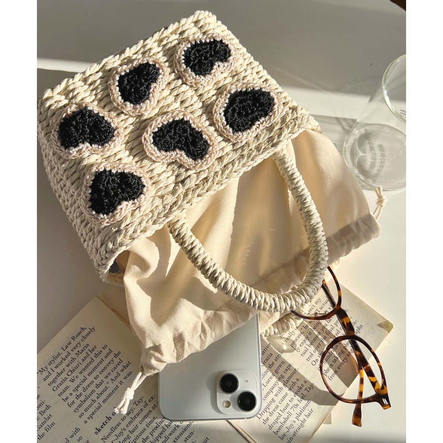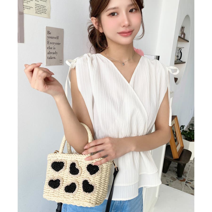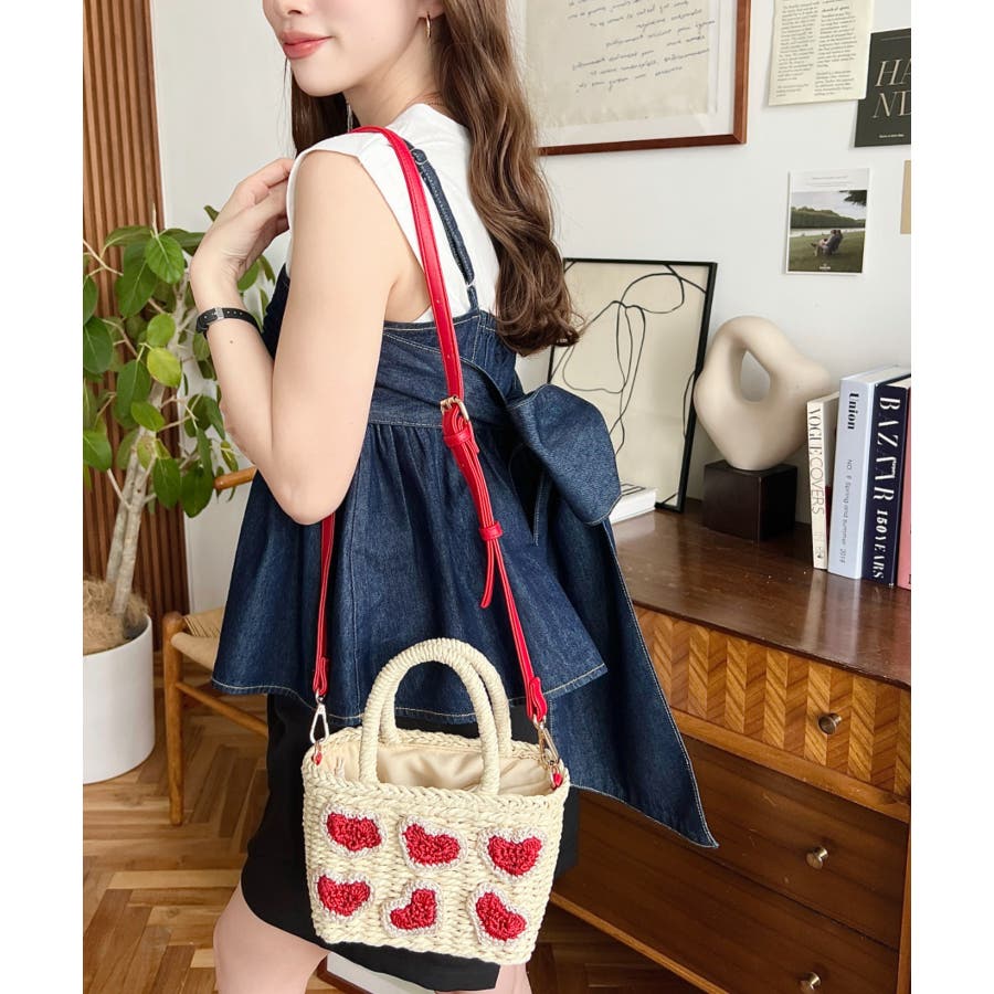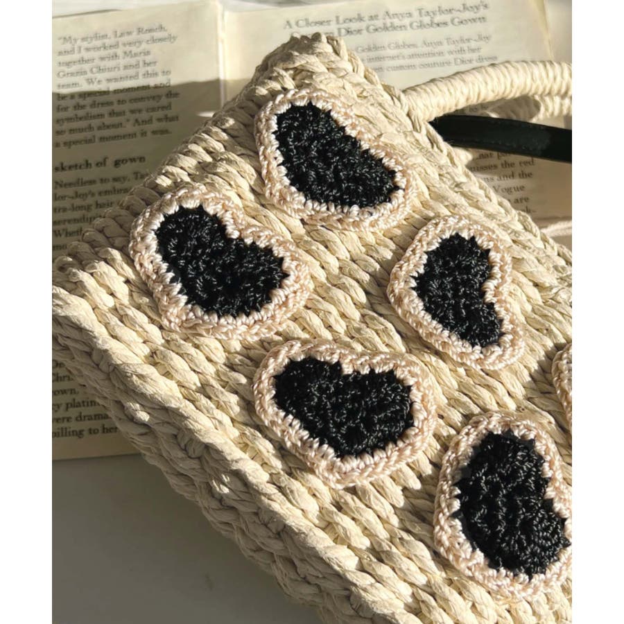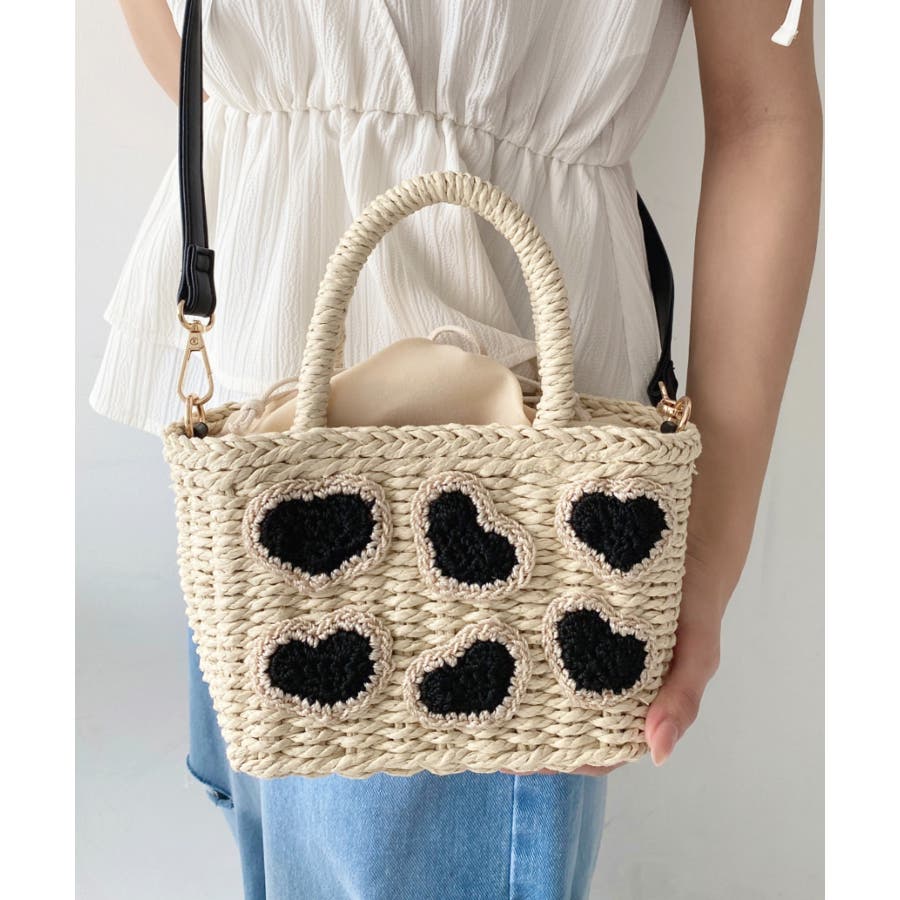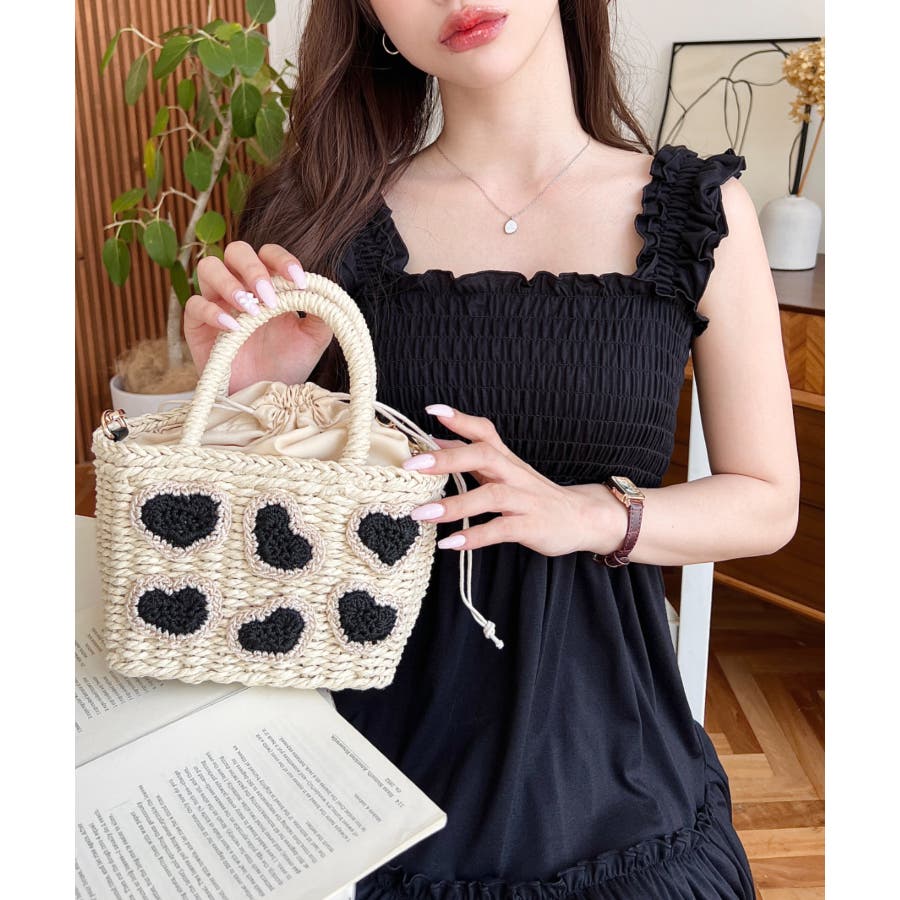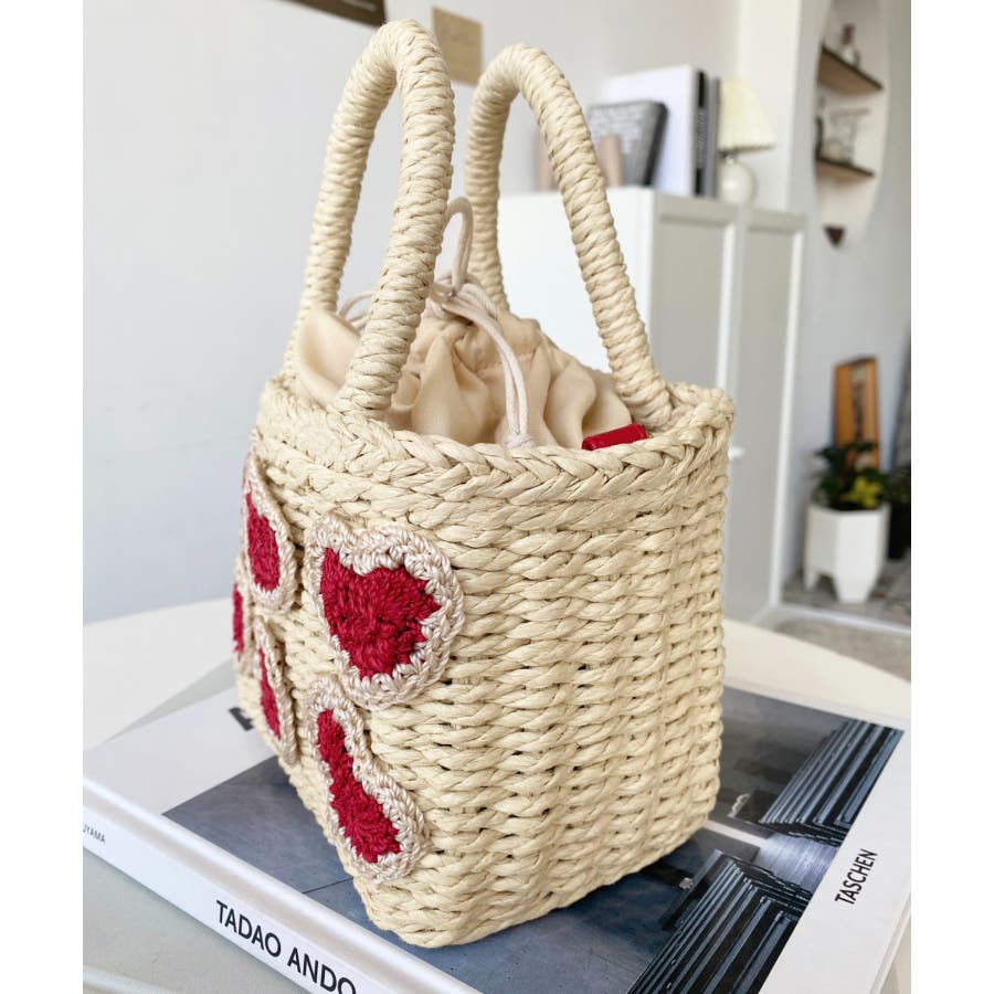 ・ペーパー素材を使用したトートバッグ。表部分のハートデザインがポイント。シンプルになりがちな夏のスタイリングにかわいい女性ぽっさに仕上げてくれるひと品です。