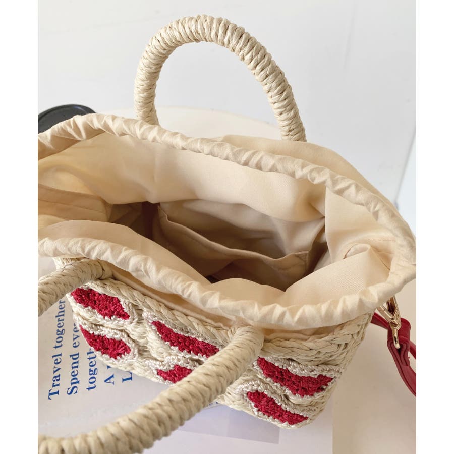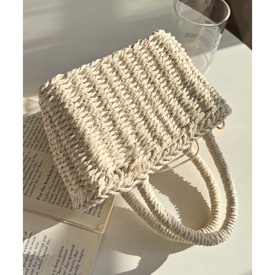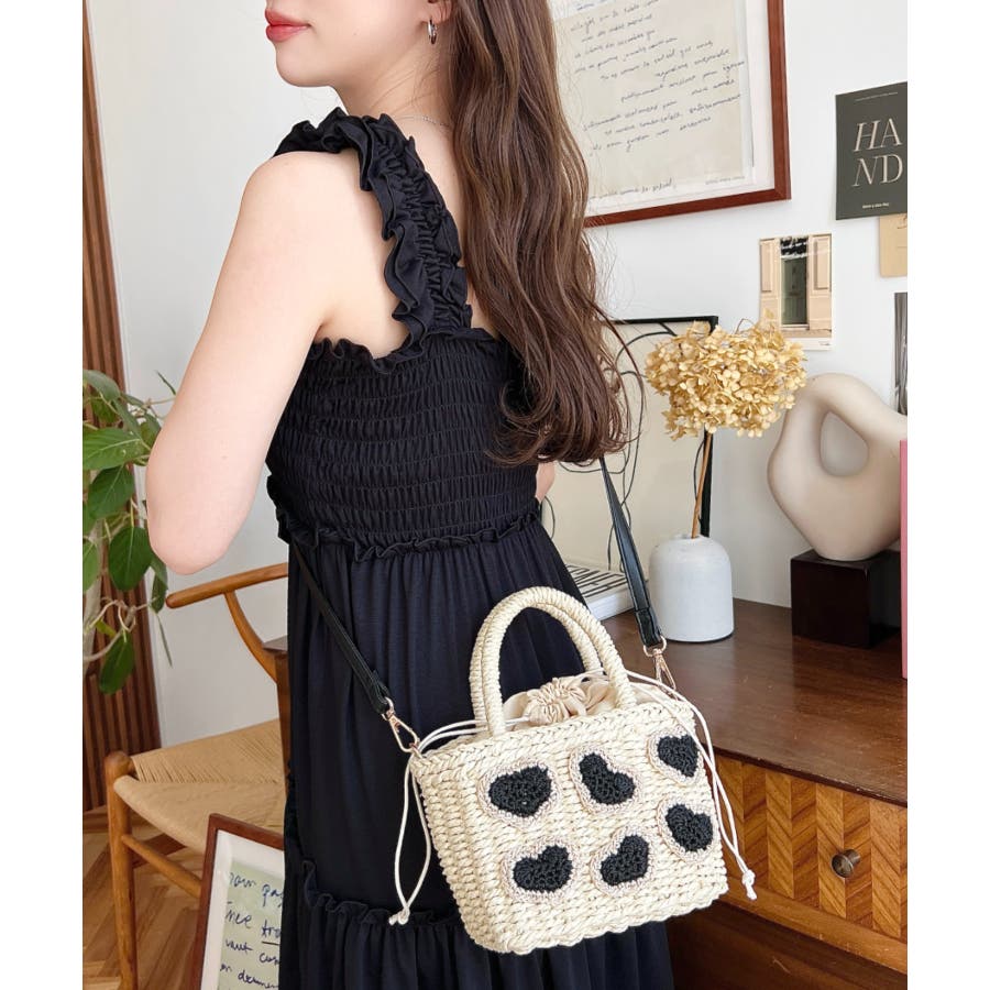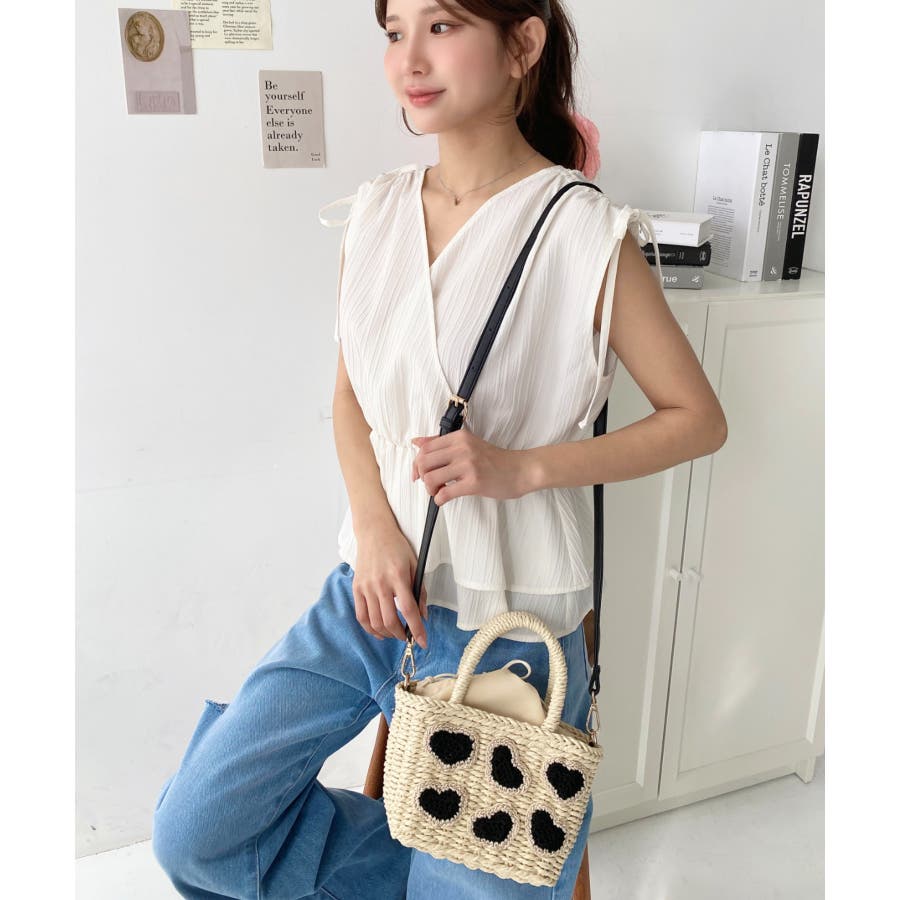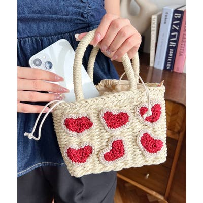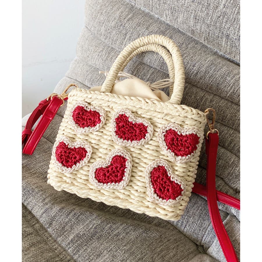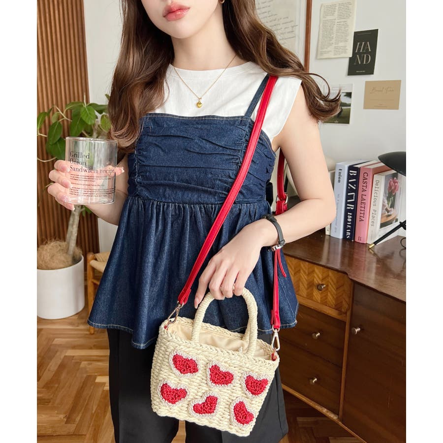 ・ペーパー素材を使用したトートバッグ。表部分のハートデザインがポイント。シンプルになりがちな夏のスタイリングにかわいい女性ぽっさに仕上げてくれるひと品です。