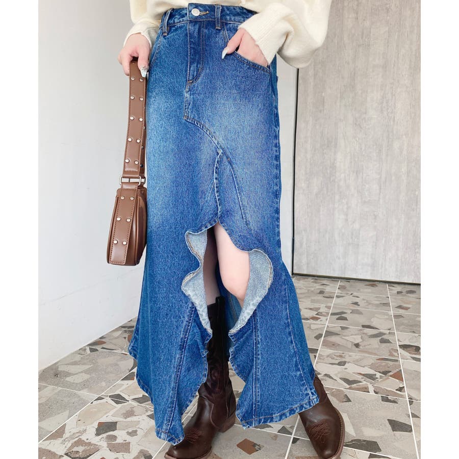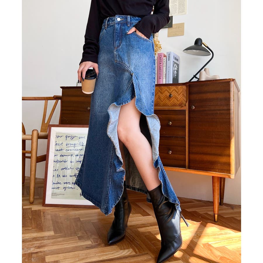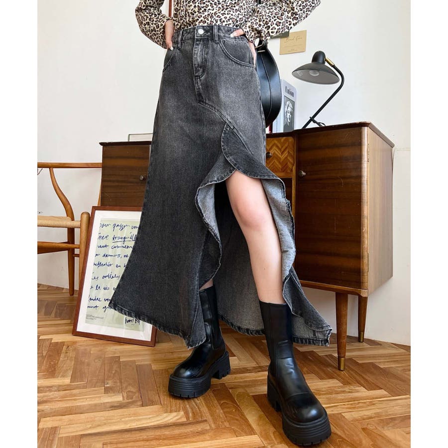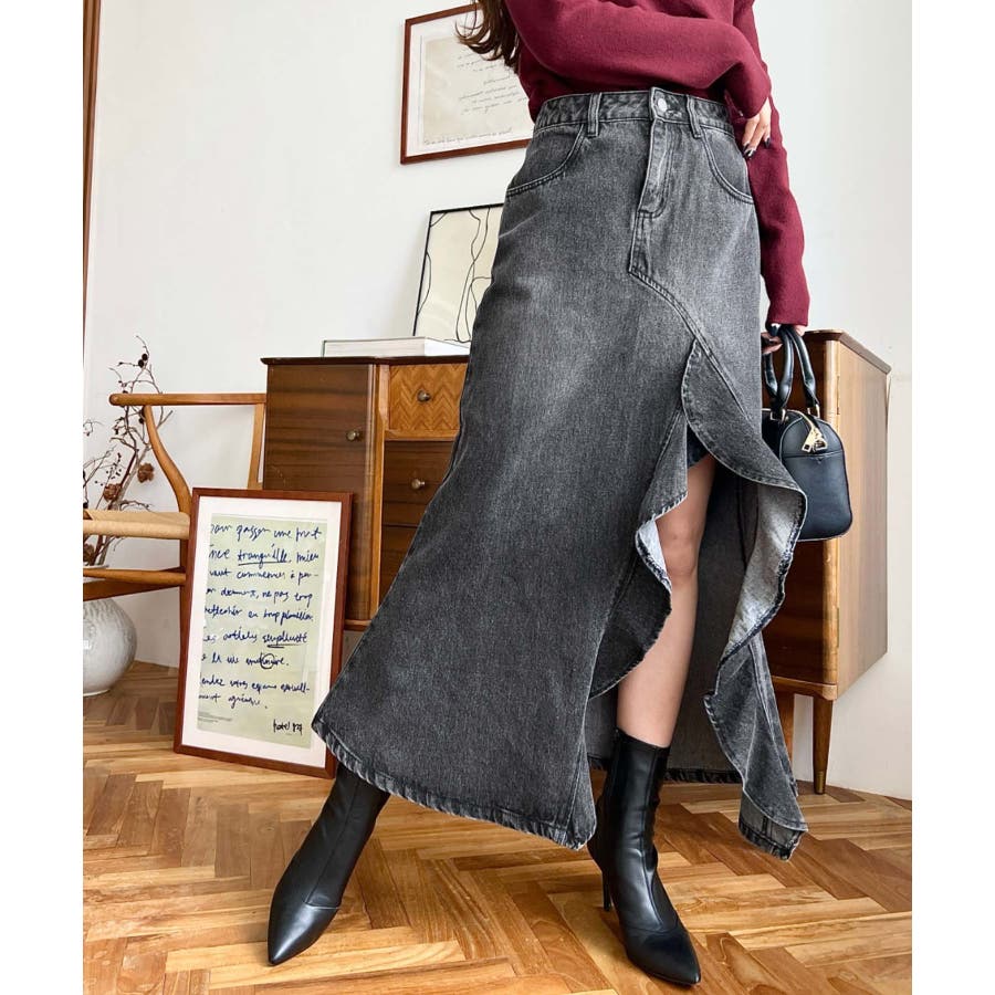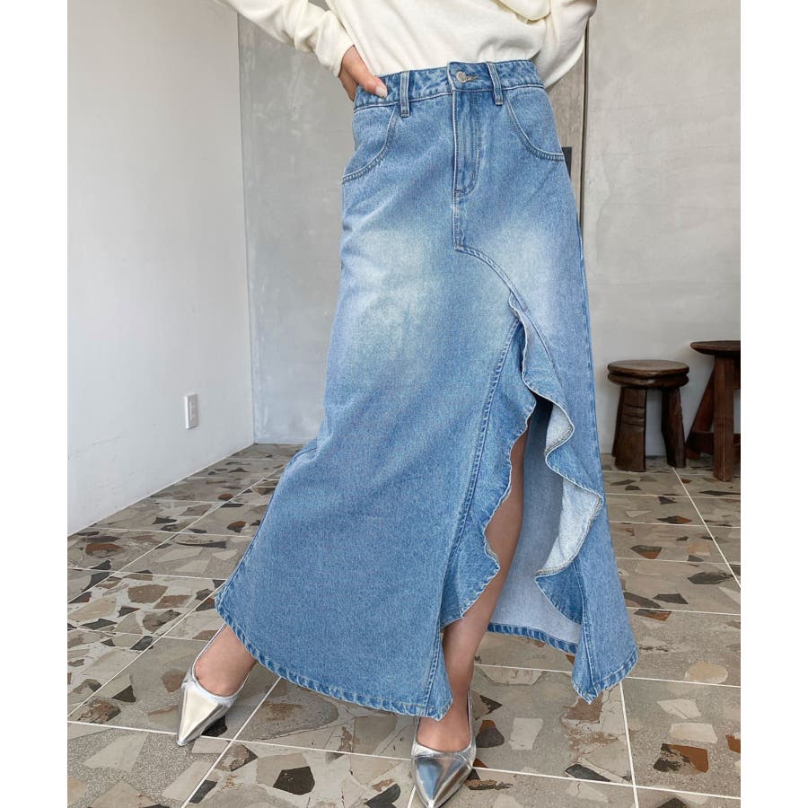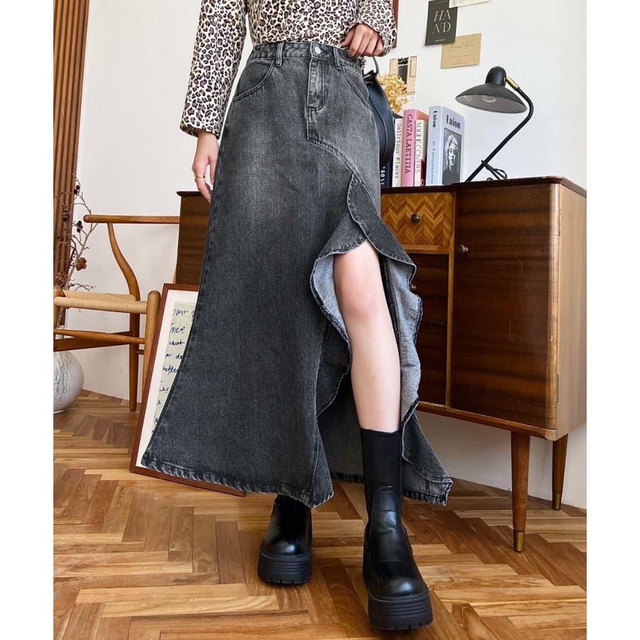 アシンメトリーフリルのスリットが目をひく、トレンドY2Kスタイルにぴったりなロングスカートが登場◎