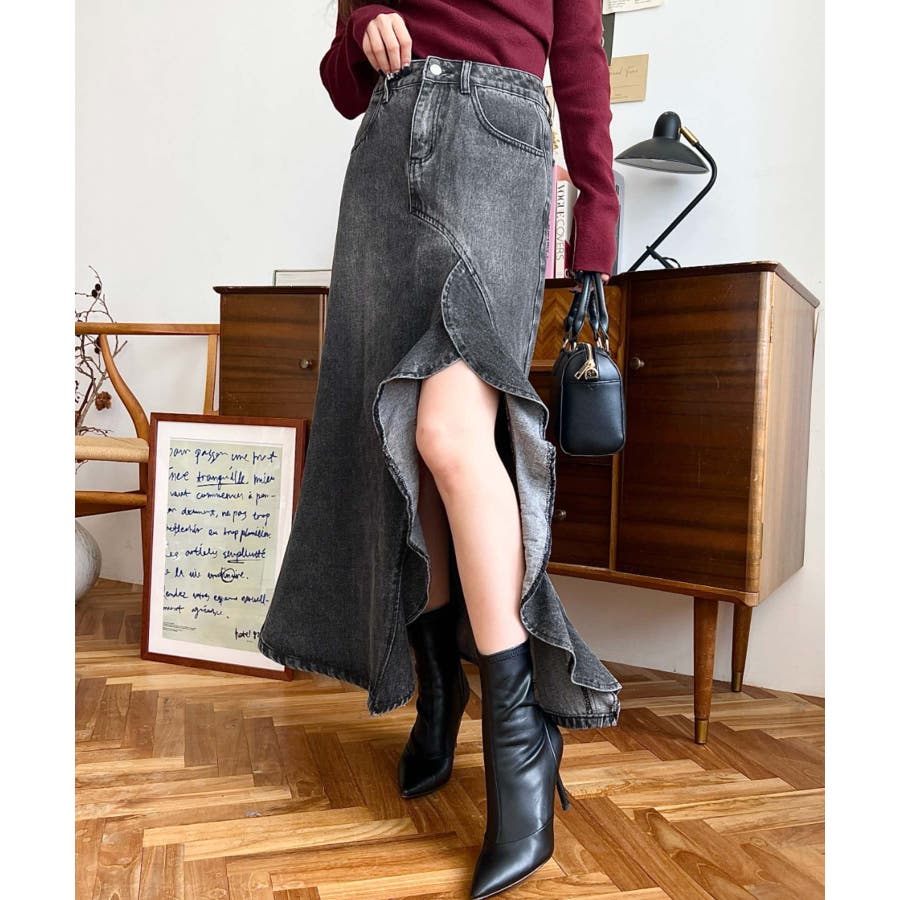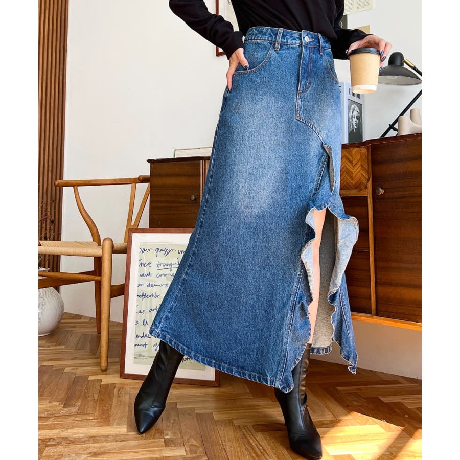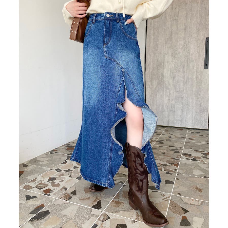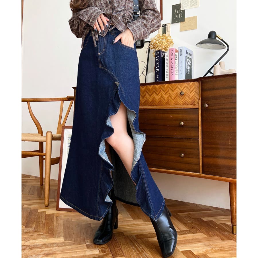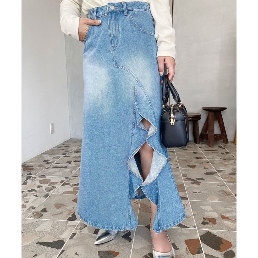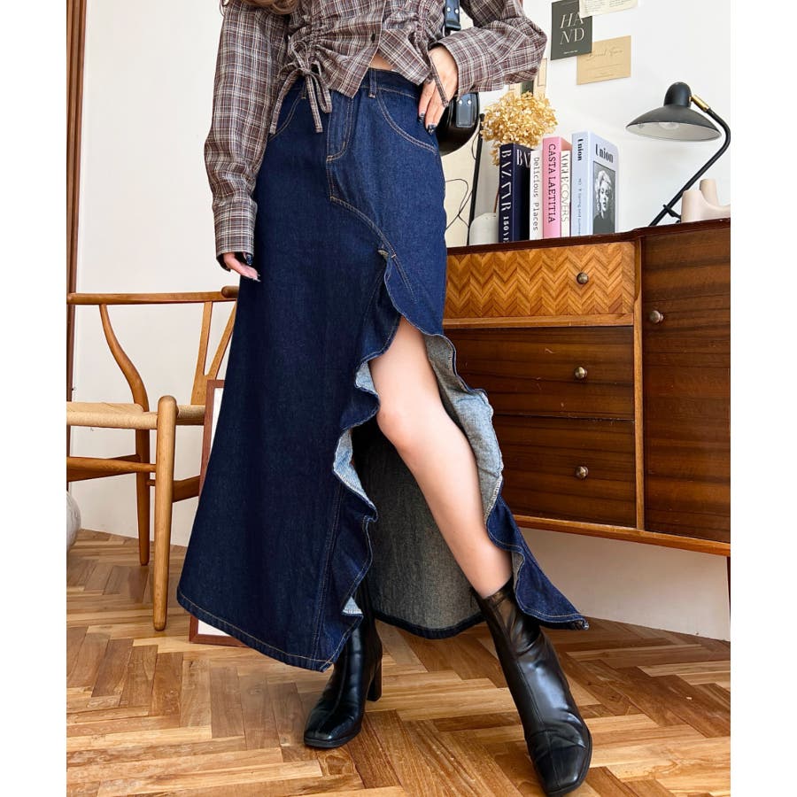 アシンメトリーフリルのスリットが目をひく、トレンドY2Kスタイルにぴったりなロングスカートが登場◎