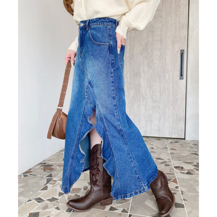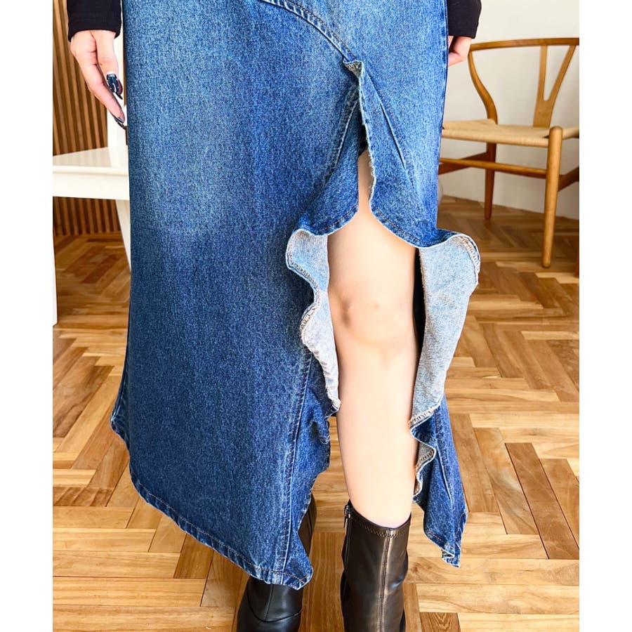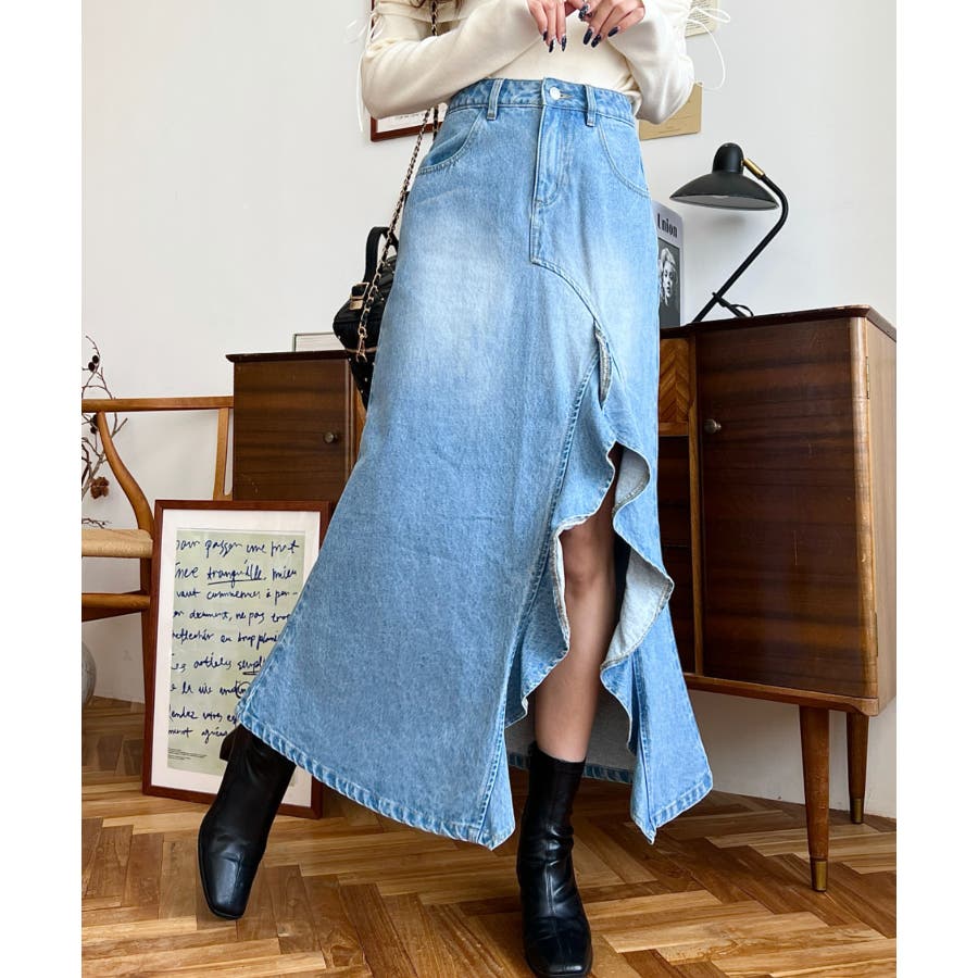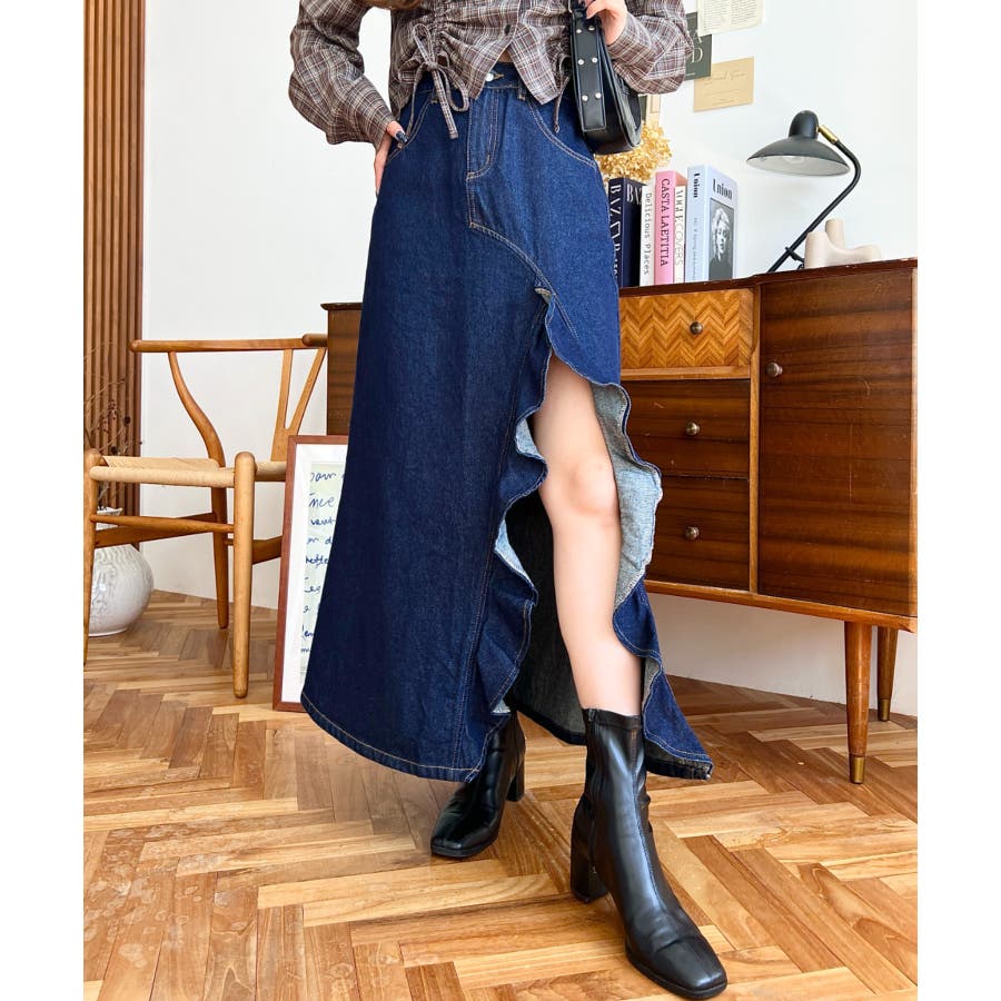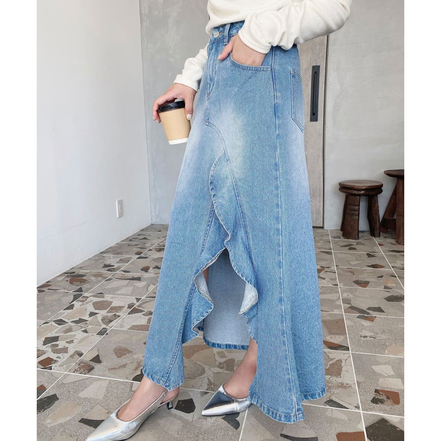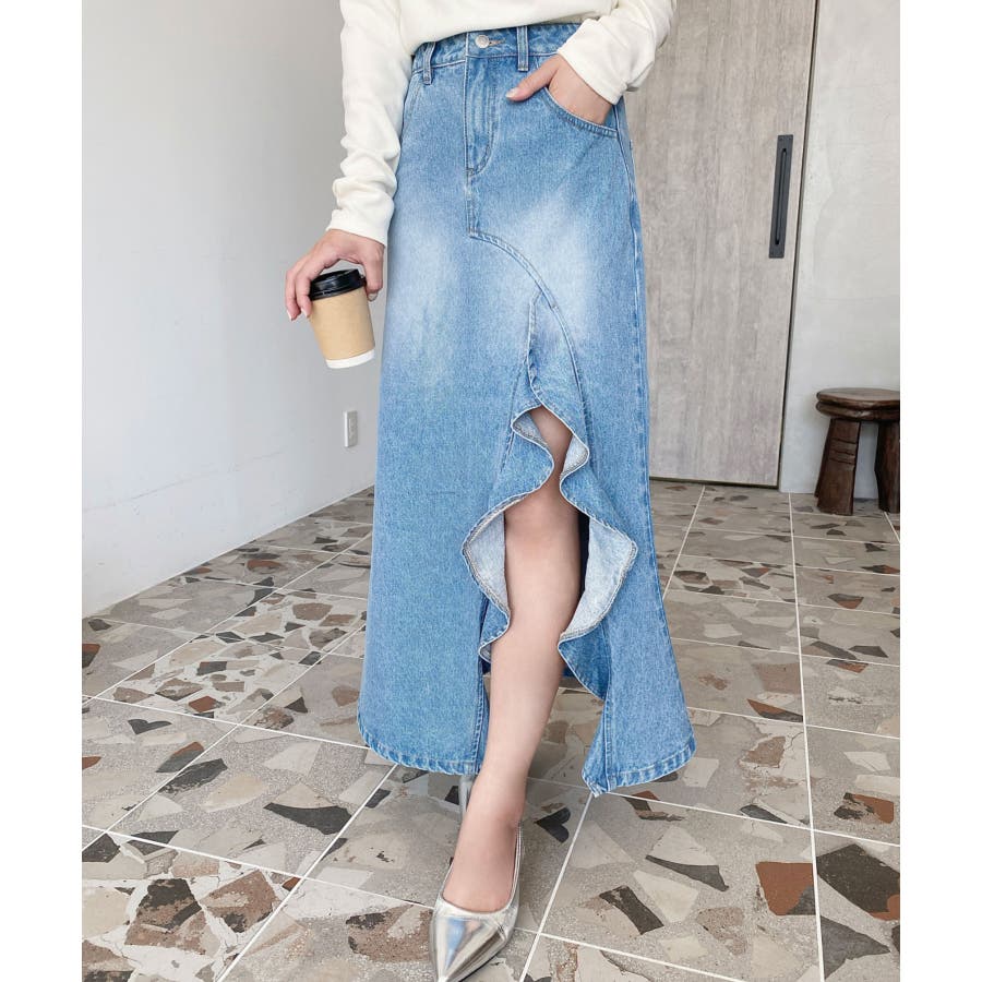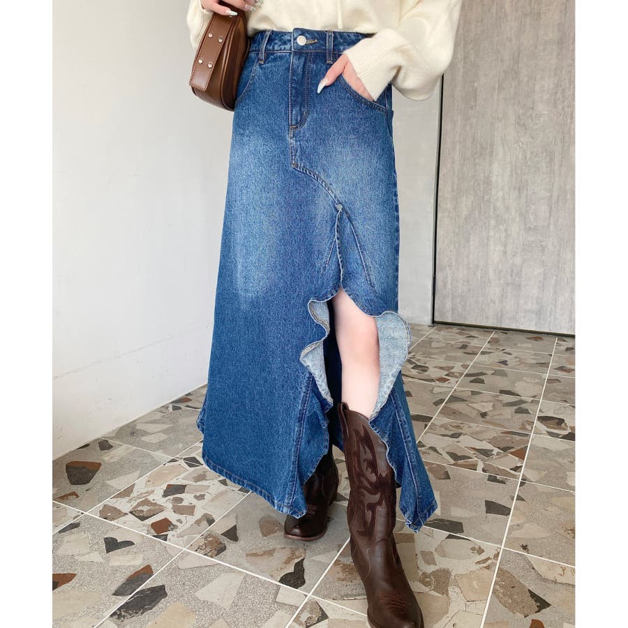 アシンメトリーフリルのスリットが目をひく、トレンドY2Kスタイルにぴったりなロングスカートが登場◎