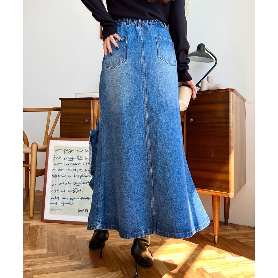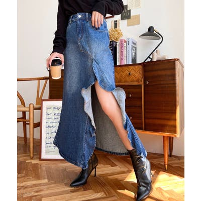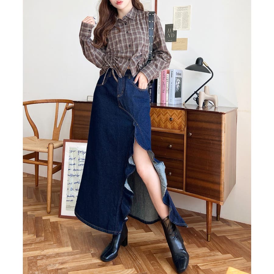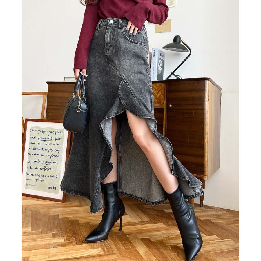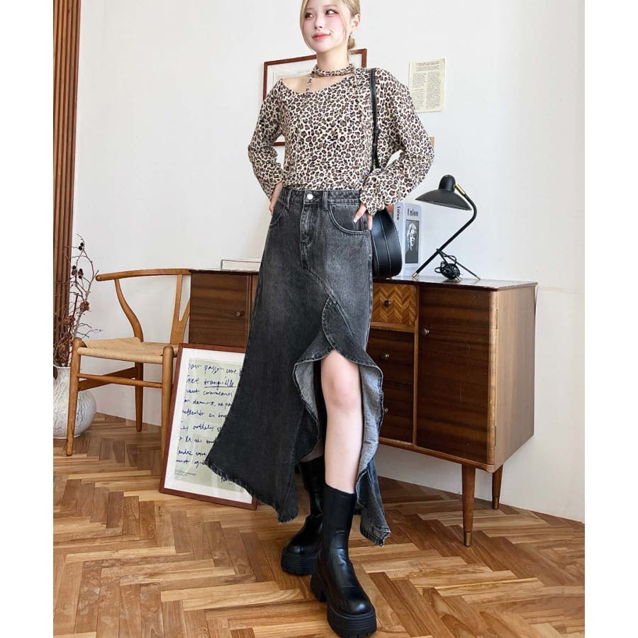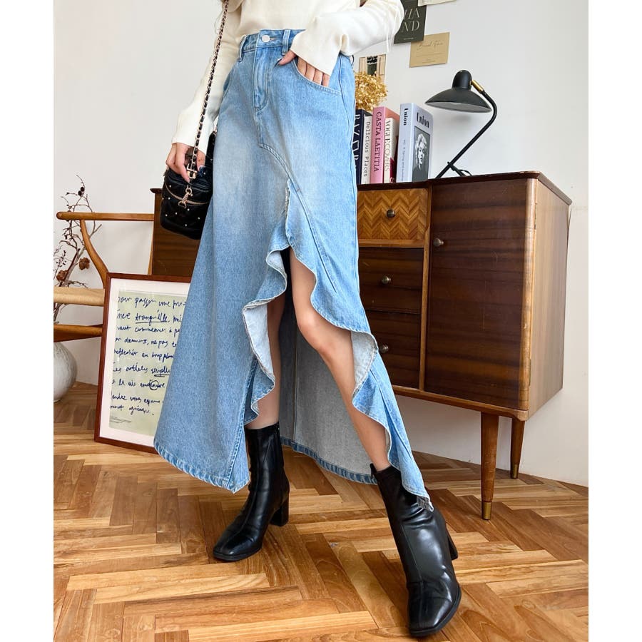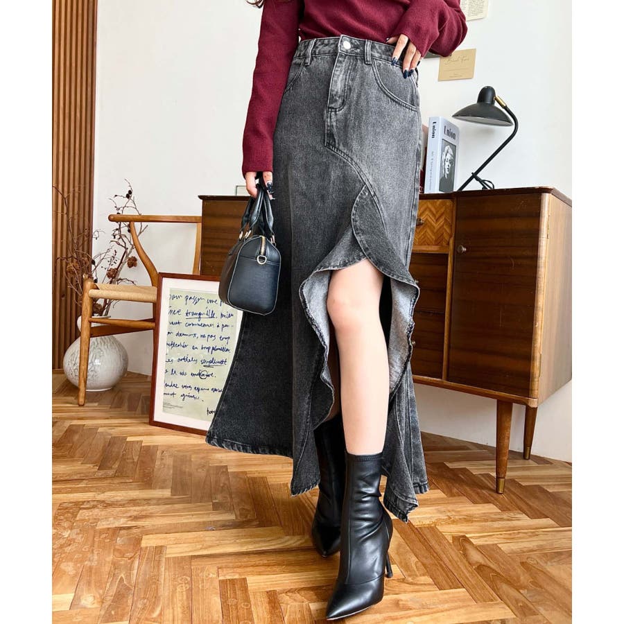 アシンメトリーフリルのスリットが目をひく、トレンドY2Kスタイルにぴったりなロングスカートが登場◎