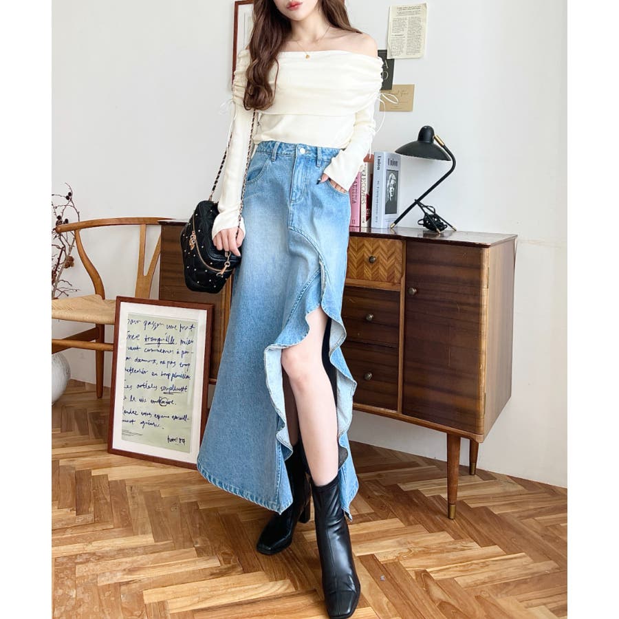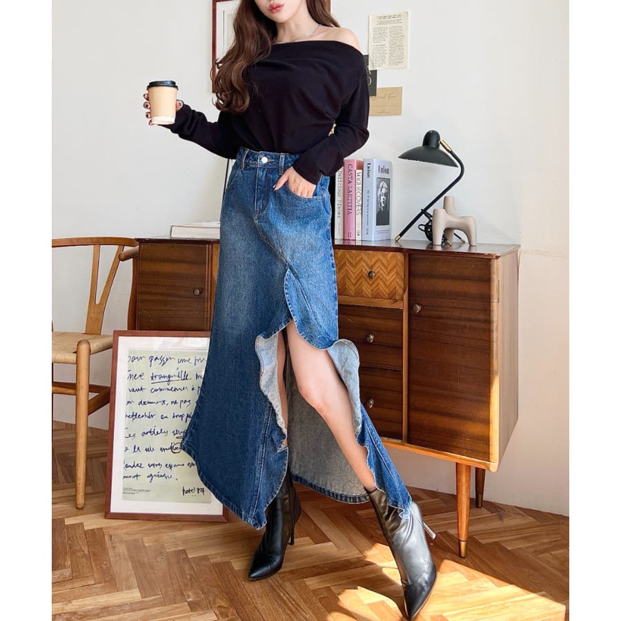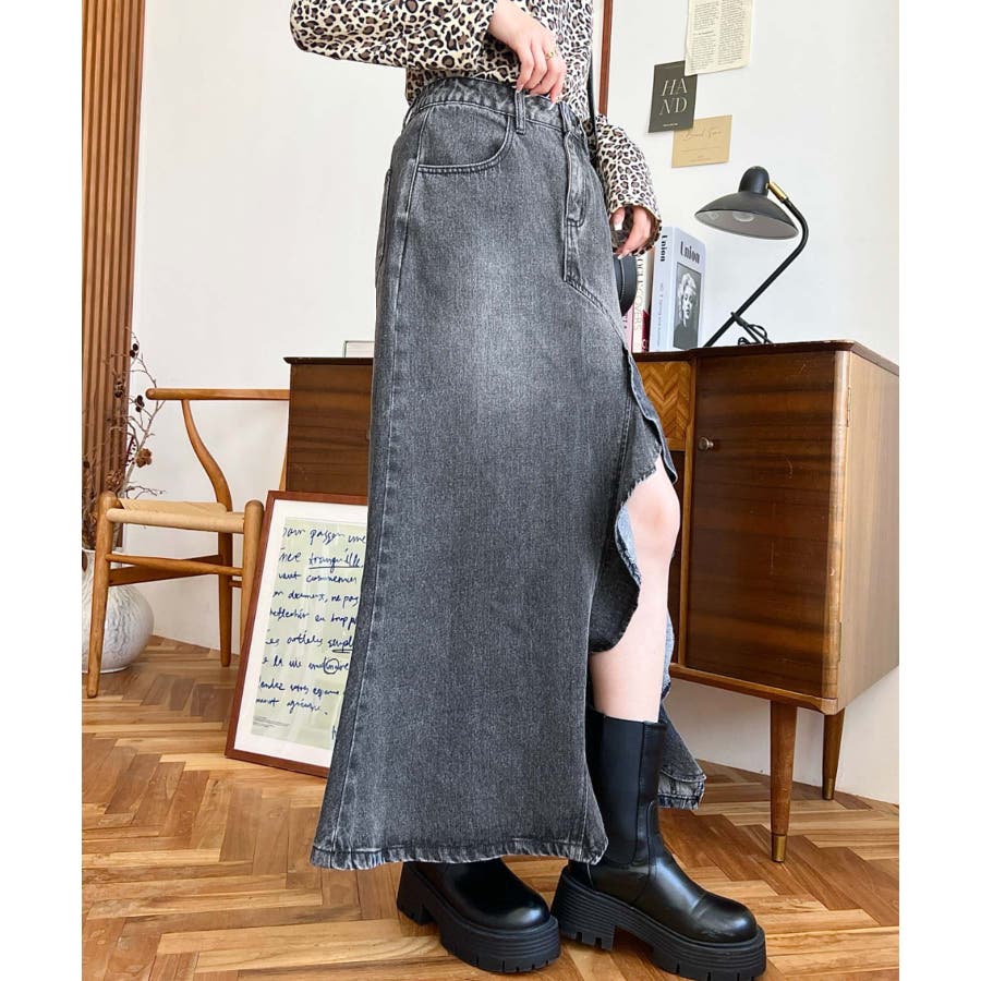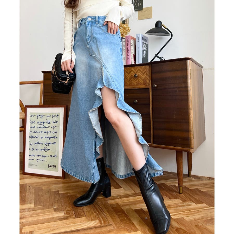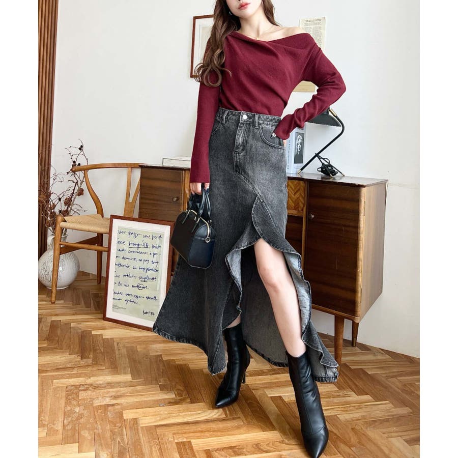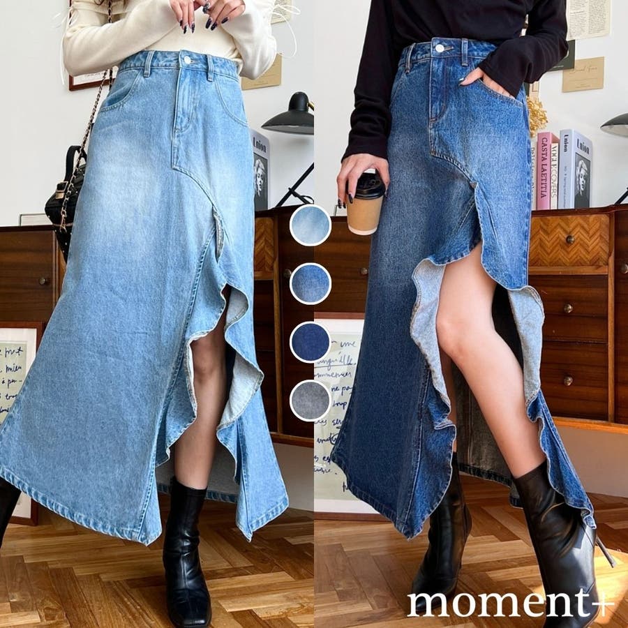 アシンメトリーフリルのスリットが目をひく、トレンドY2Kスタイルにぴったりなロングスカートが登場◎