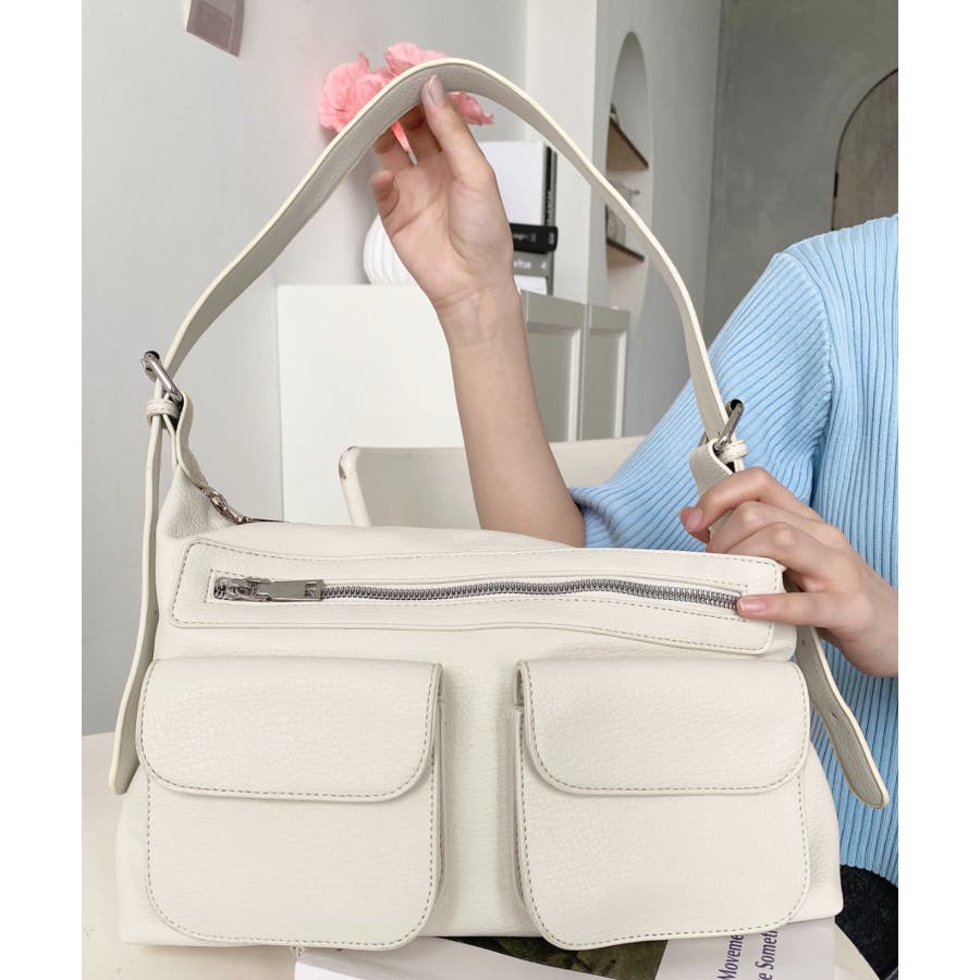 ・ポーチやお財布など必需品が余裕でおさまる安心の容量。フラップポケットを活用してスマホやハンカチなどさっと取り出したいアイテムを収納するのが◎