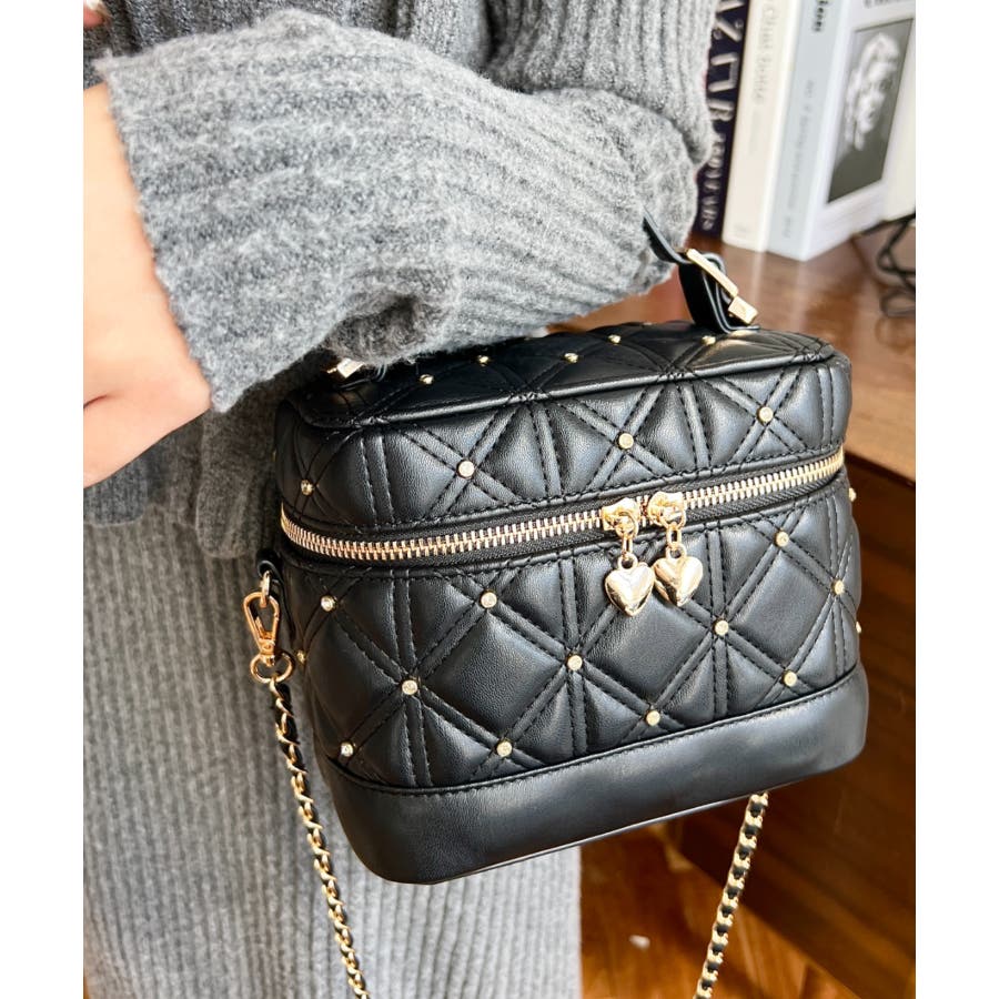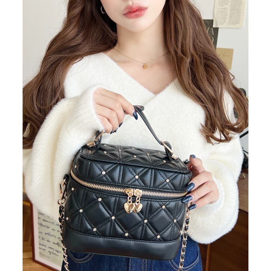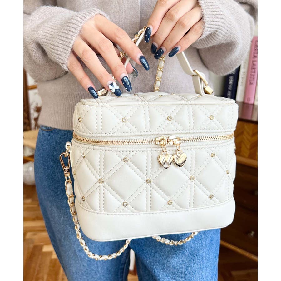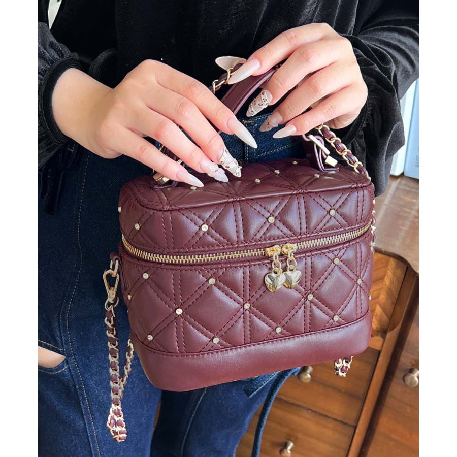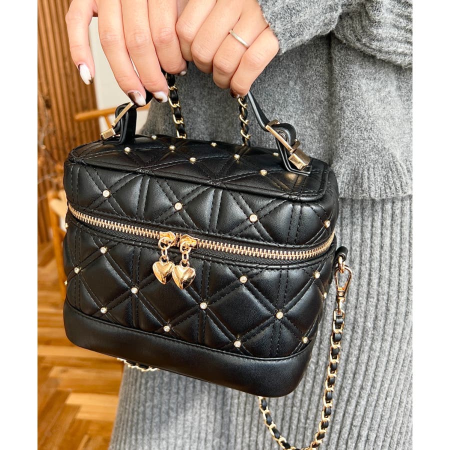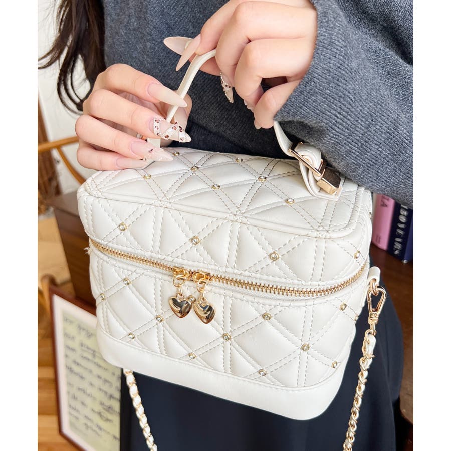 ハートチャームビジューキルティングバニティバッグ