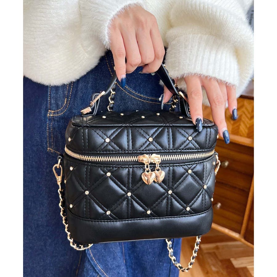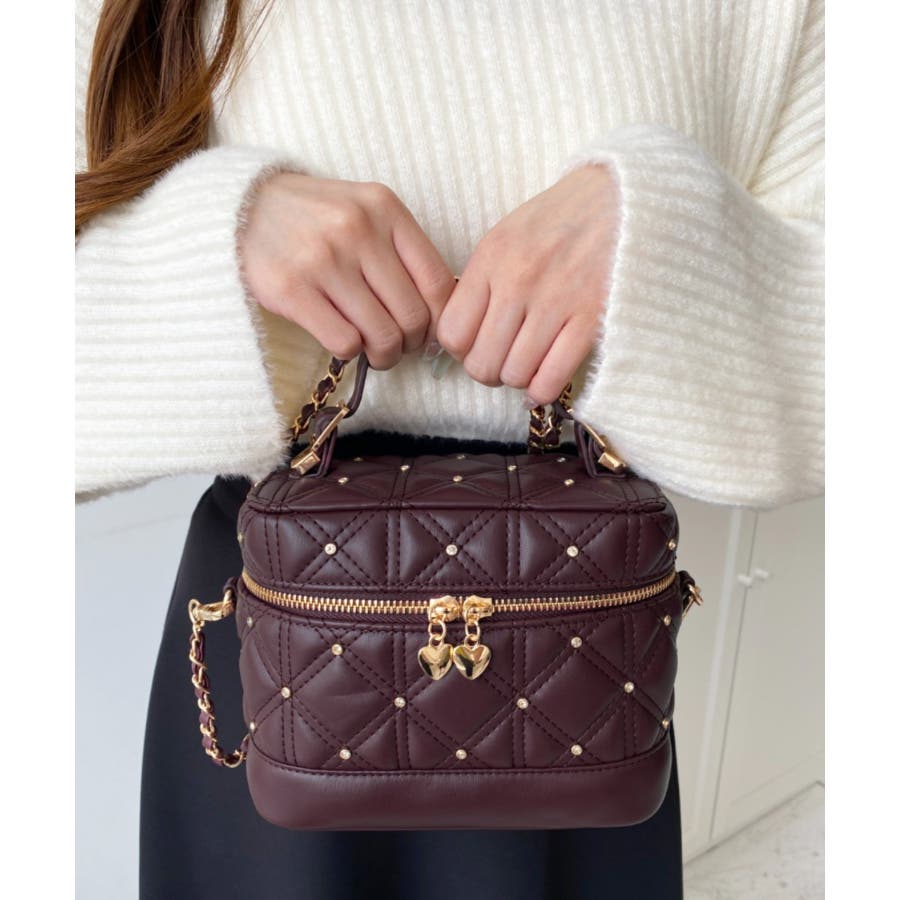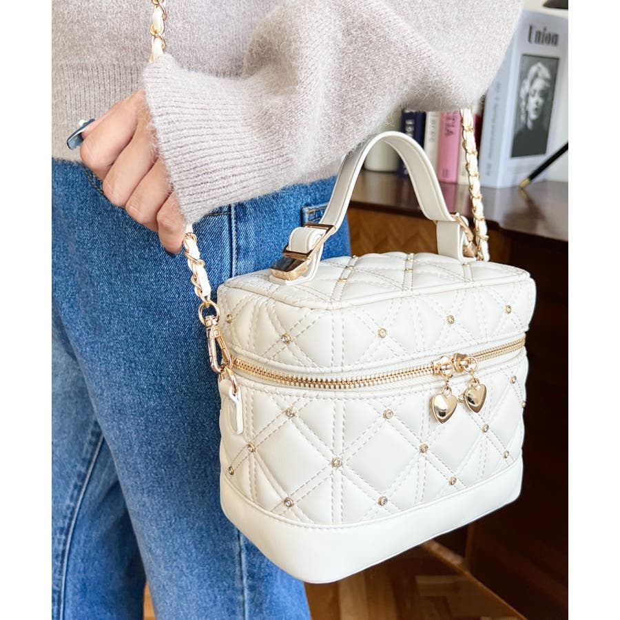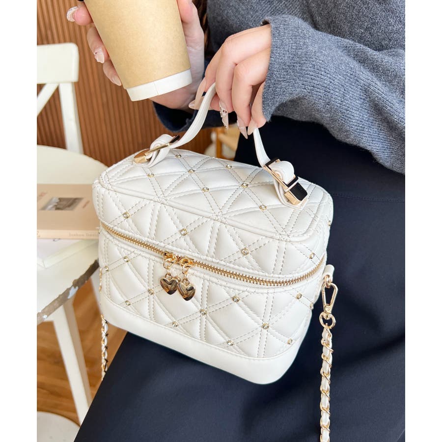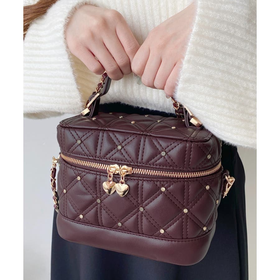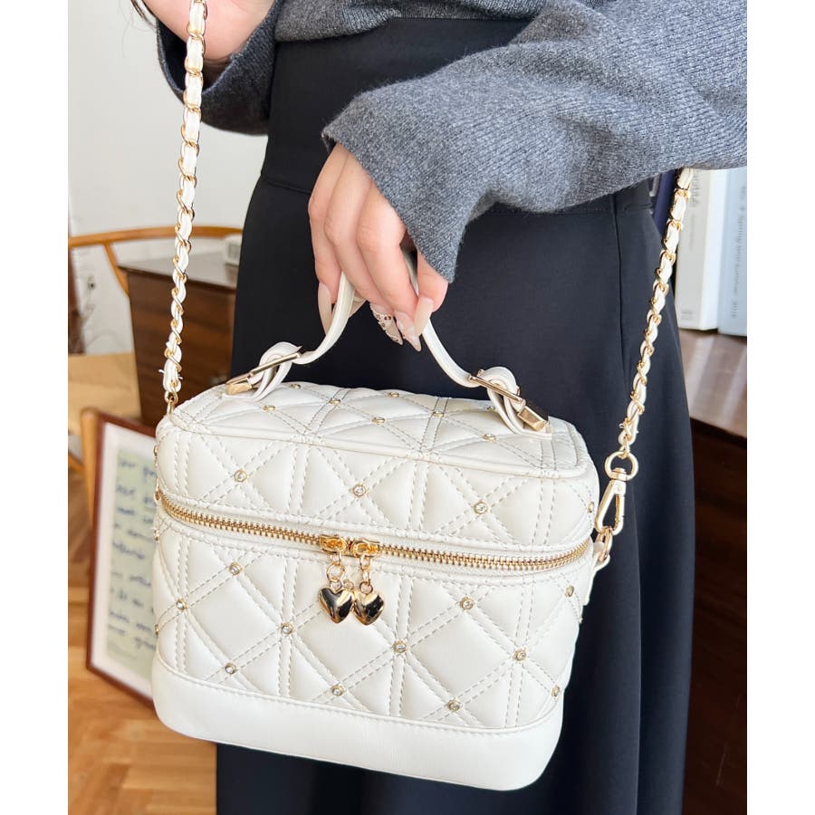 ハートチャームビジューキルティングバニティバッグ
