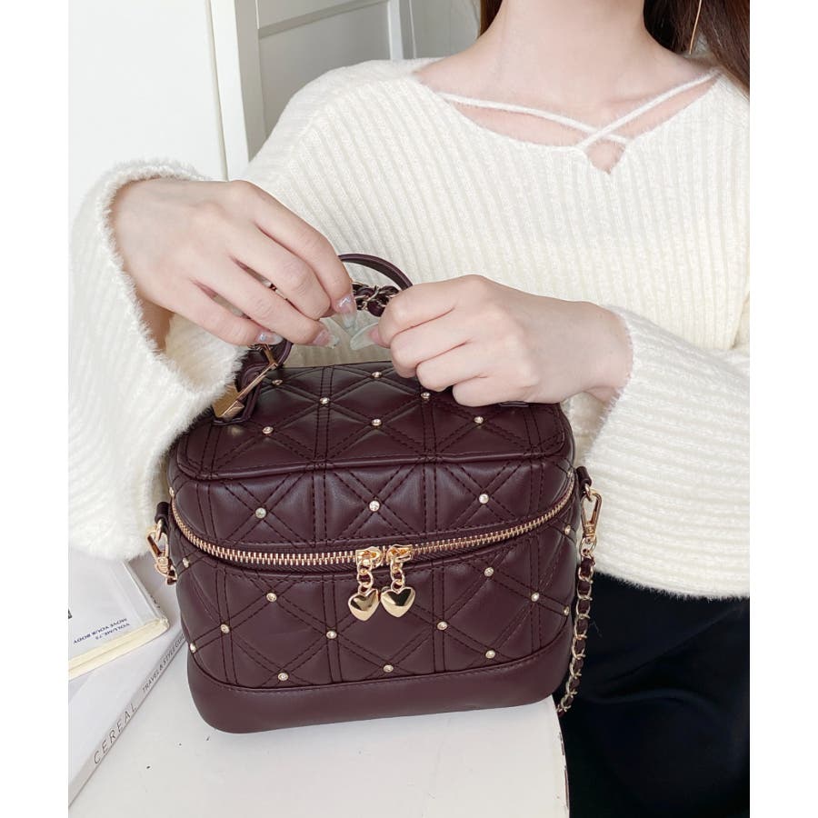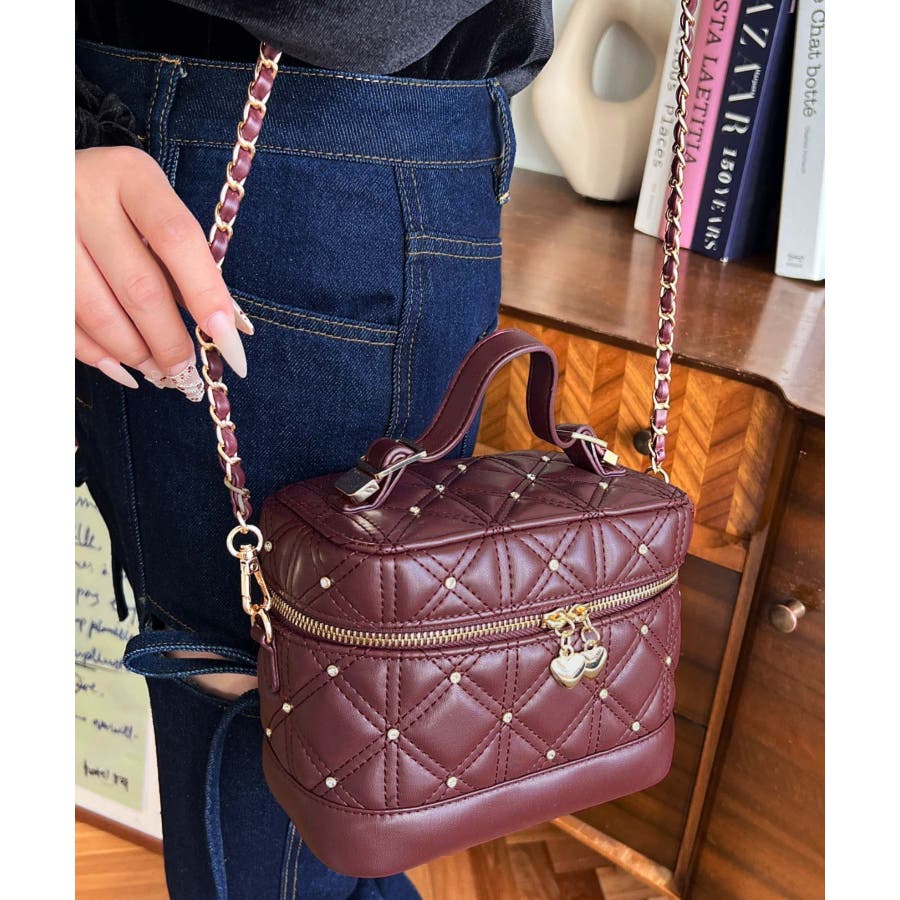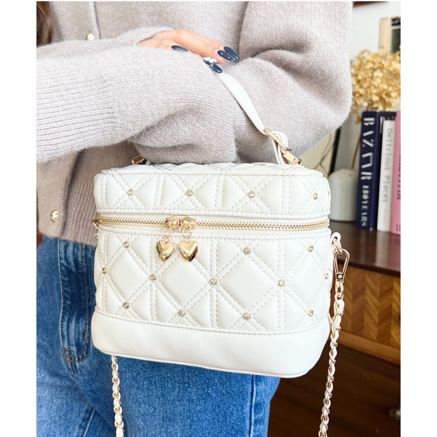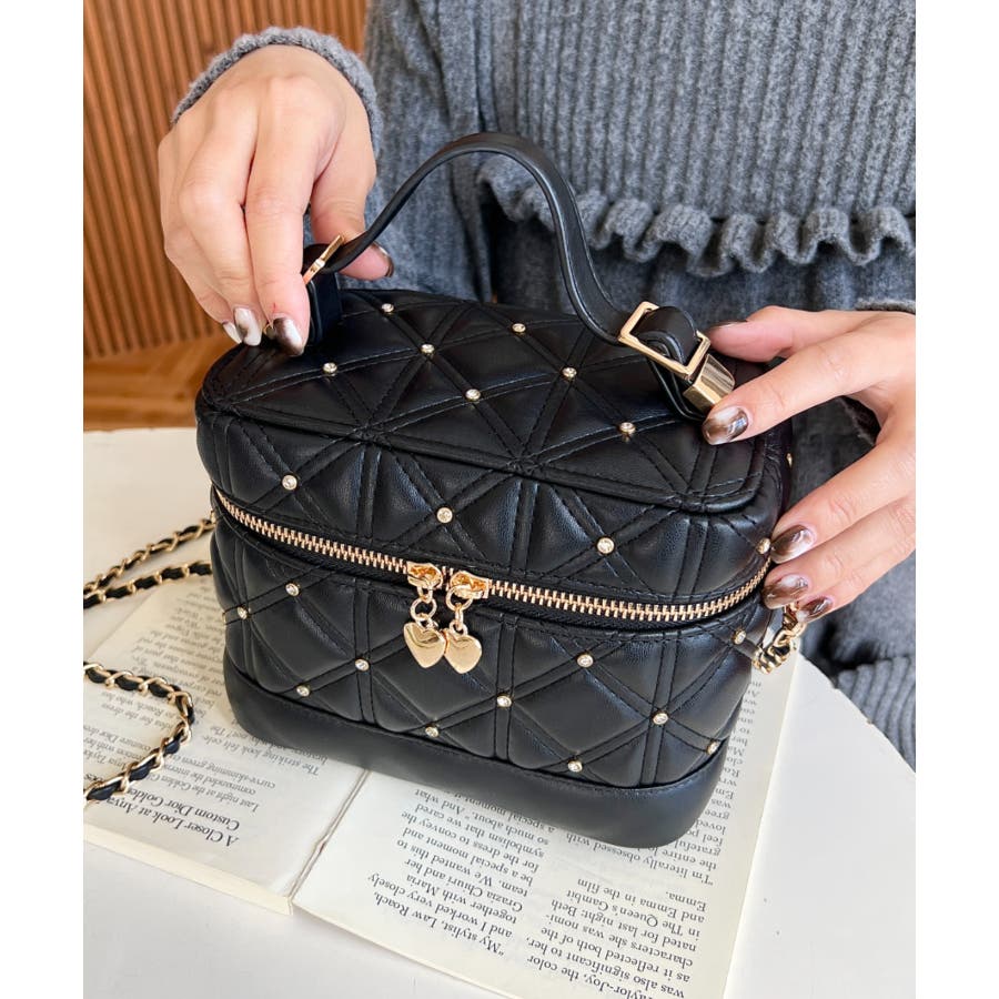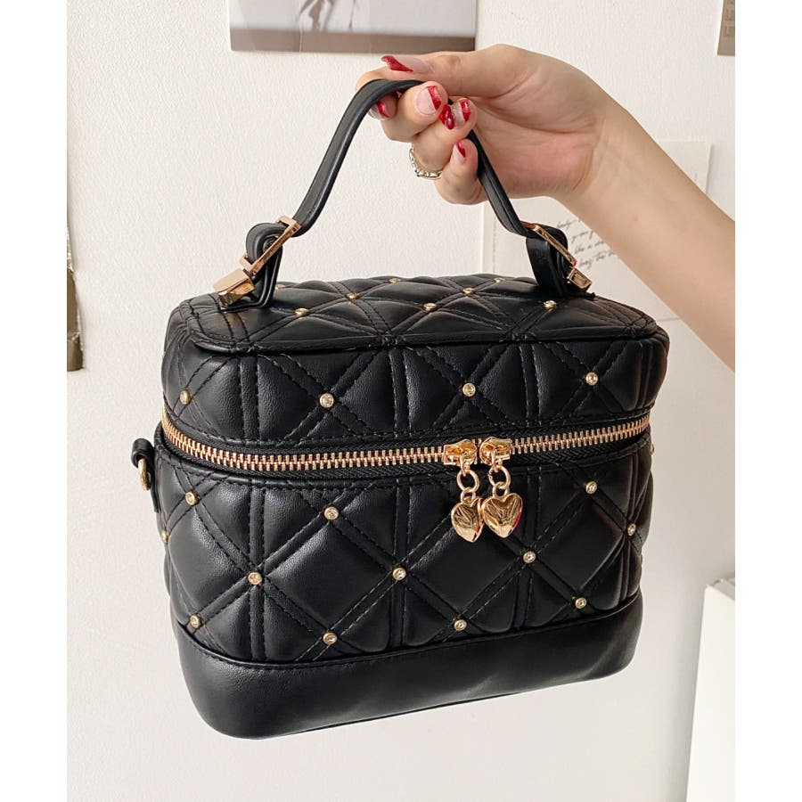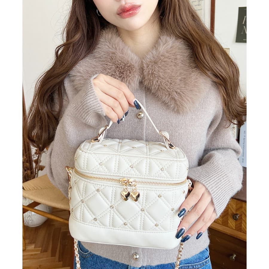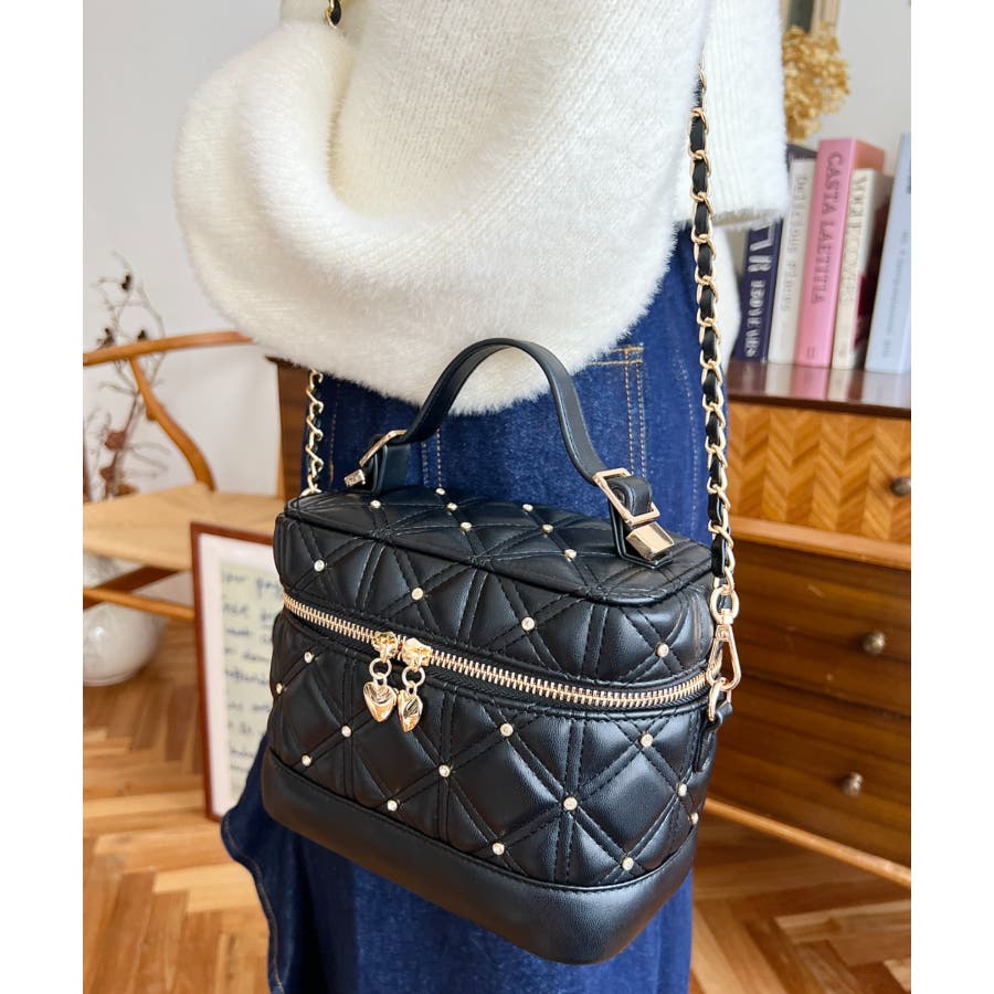 ハートチャームビジューキルティングバニティバッグ