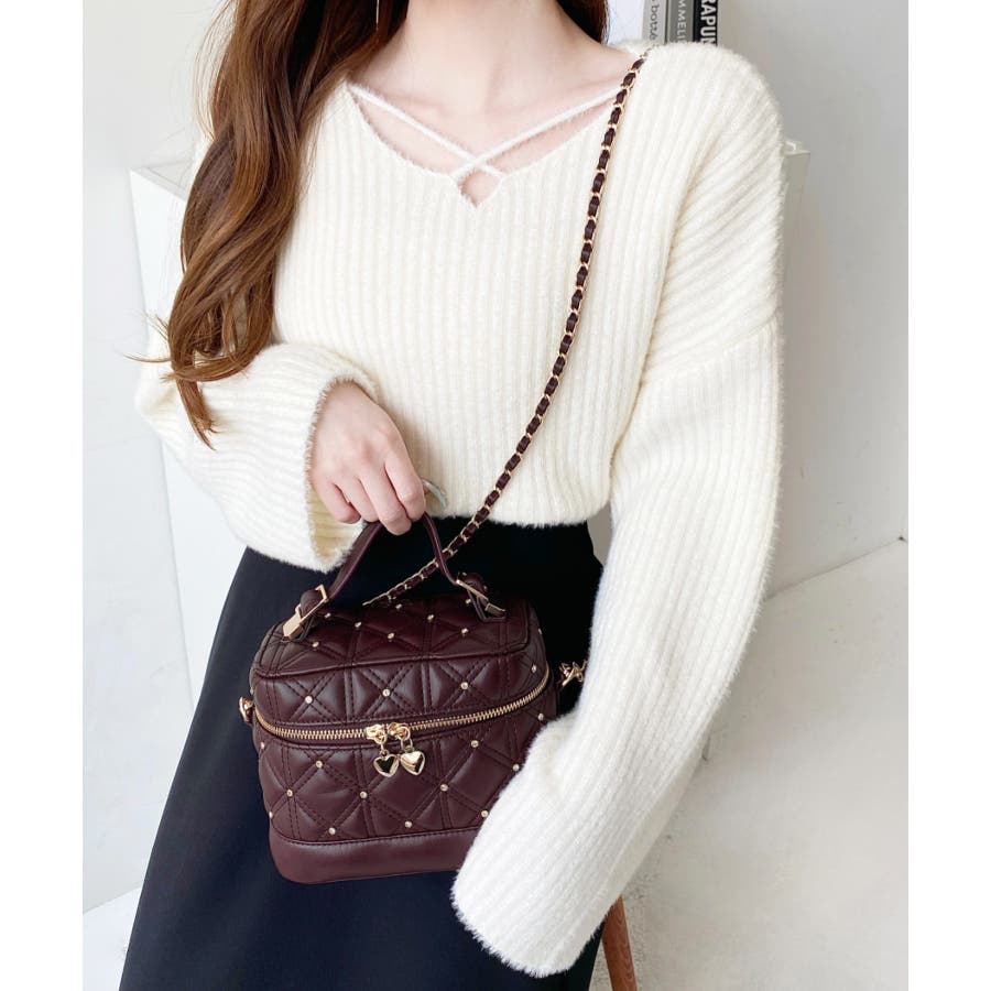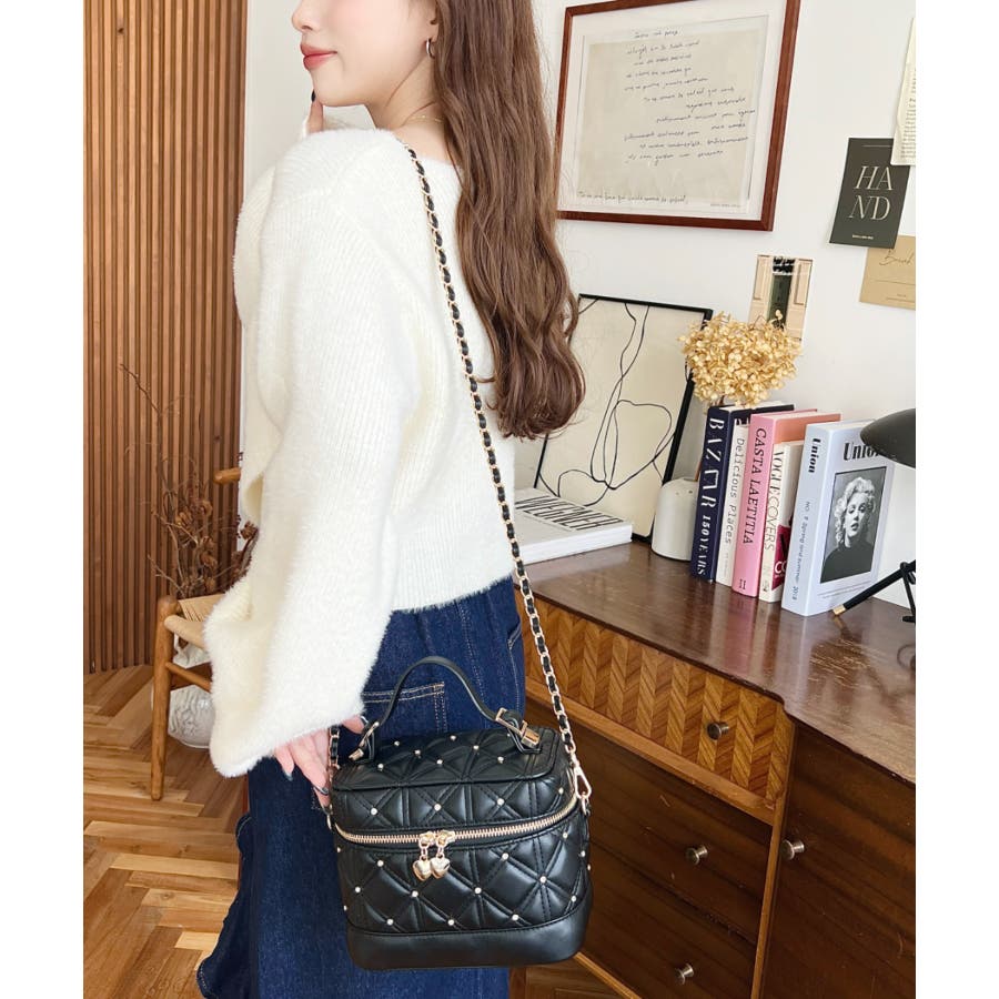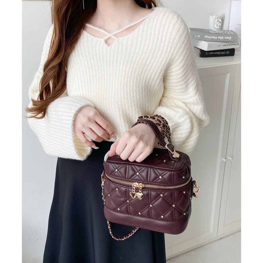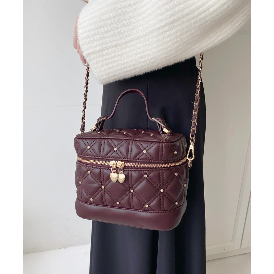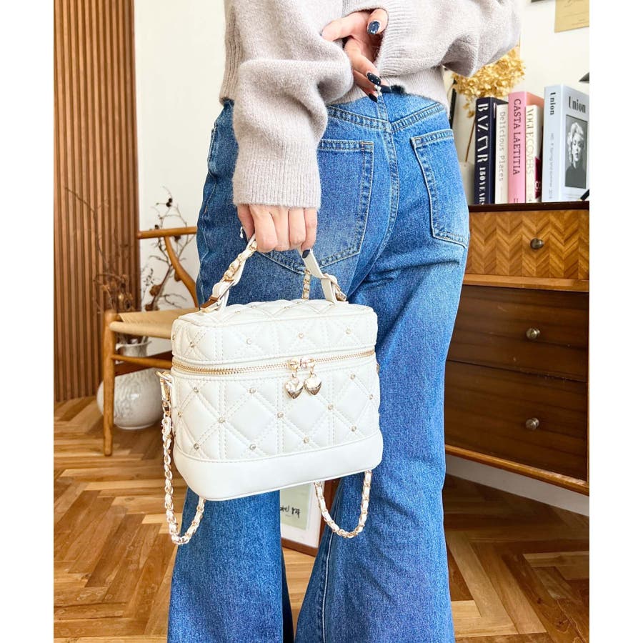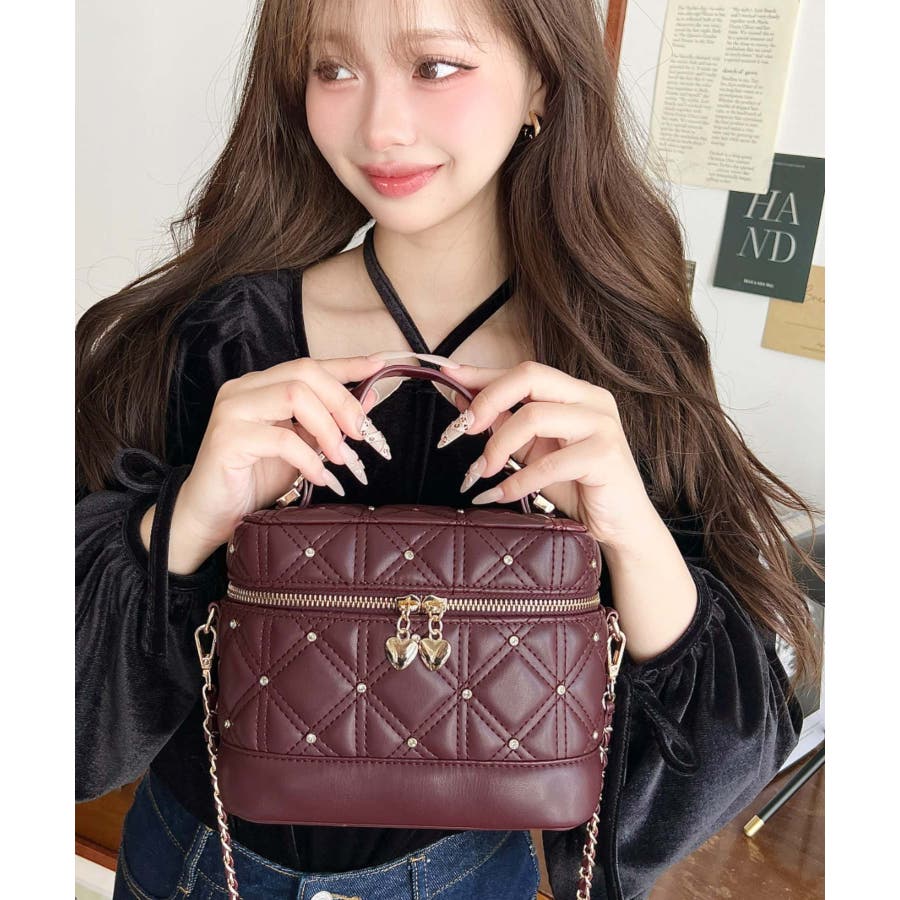 ハートチャームビジューキルティングバニティバッグ