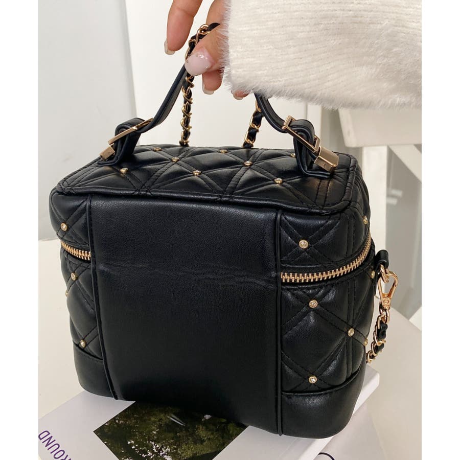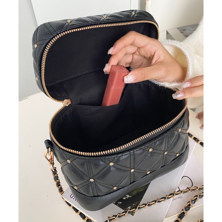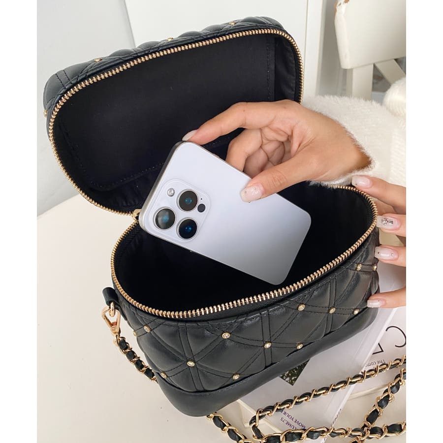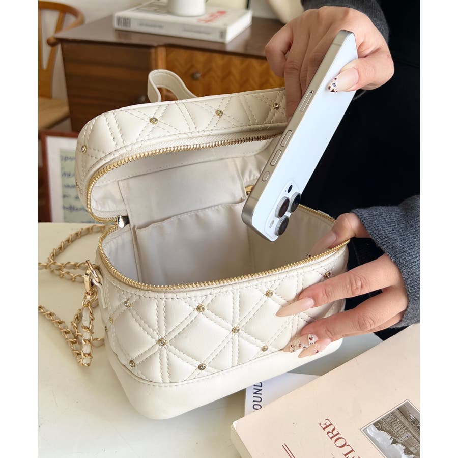 ・キルティング生地に均等に組み込まれたビジューが高見えする持つだけで気分が上がるアイテム。