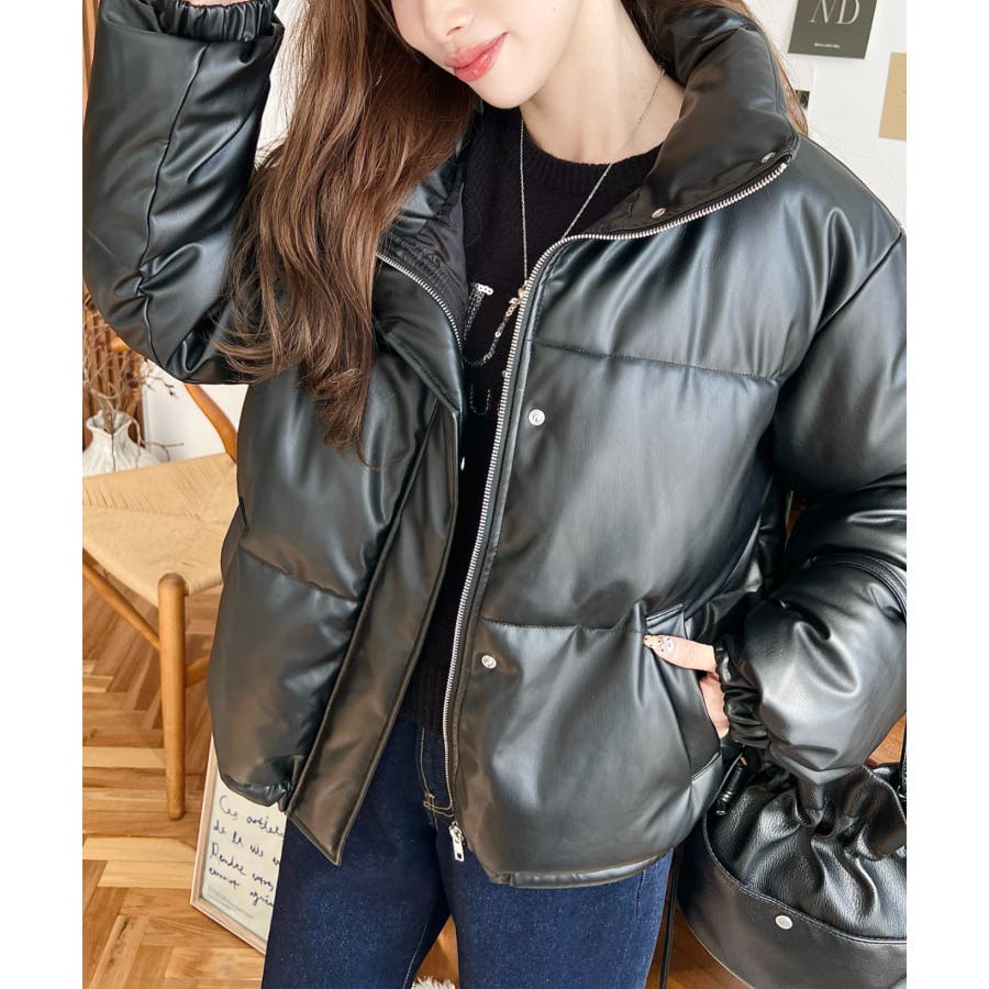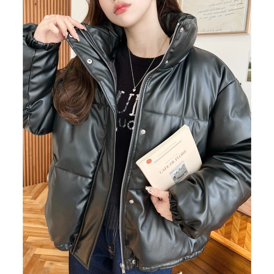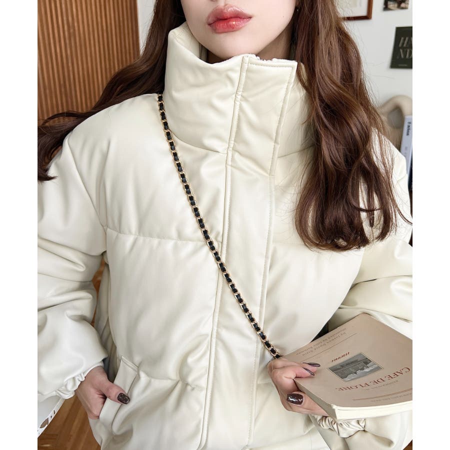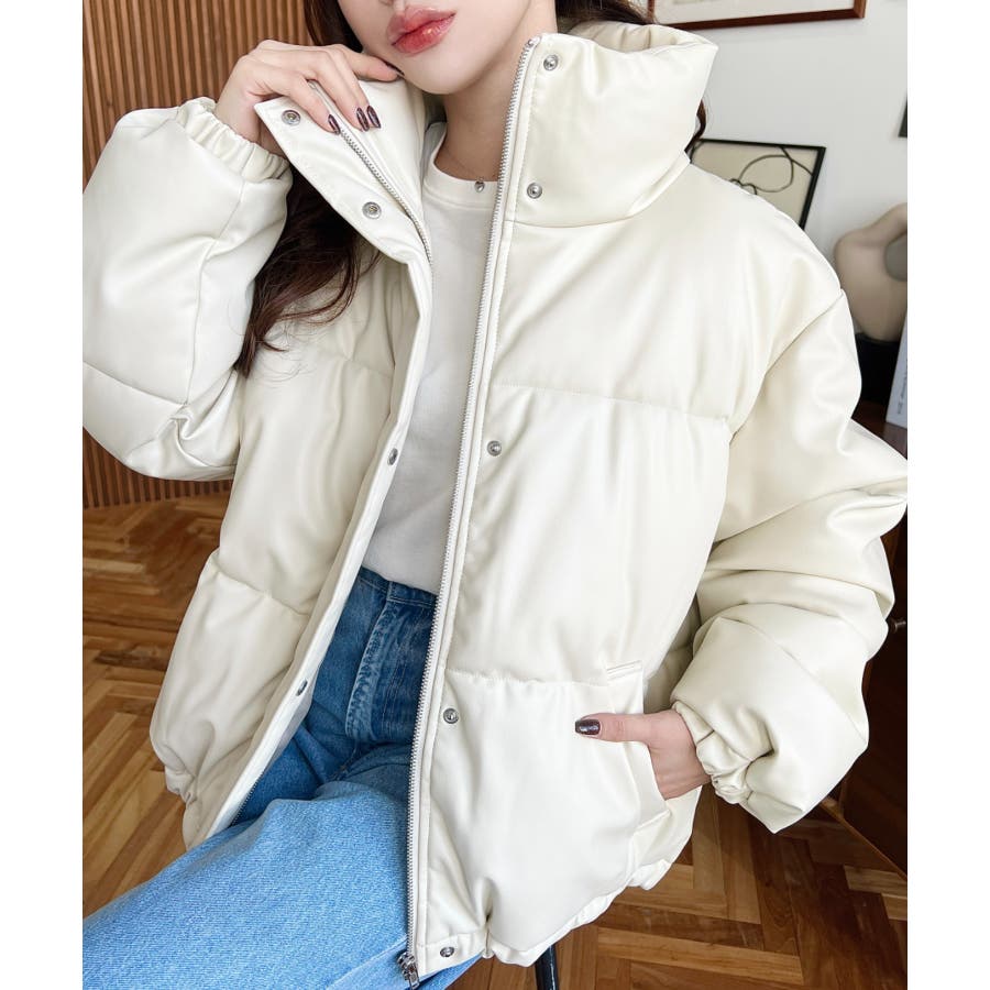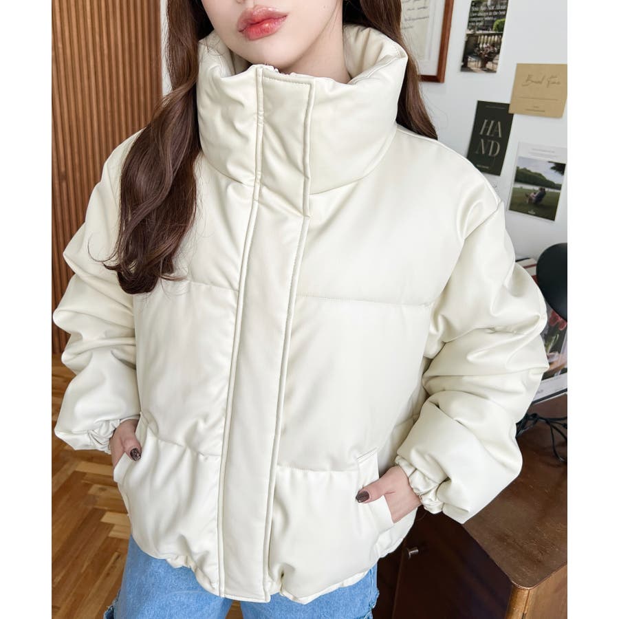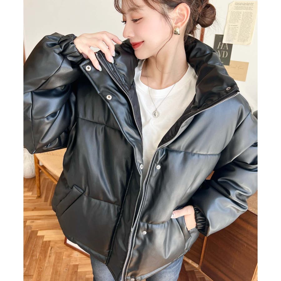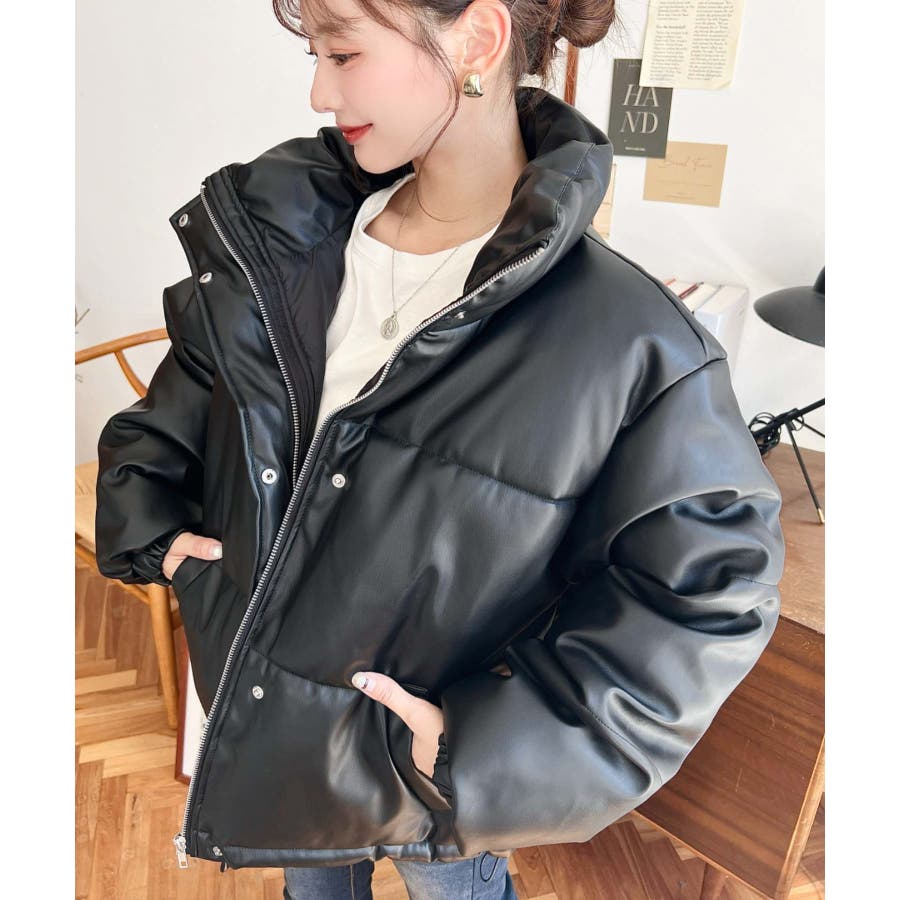 スタンドカラーファイバーダウンソフトフェイクレザーブルゾン