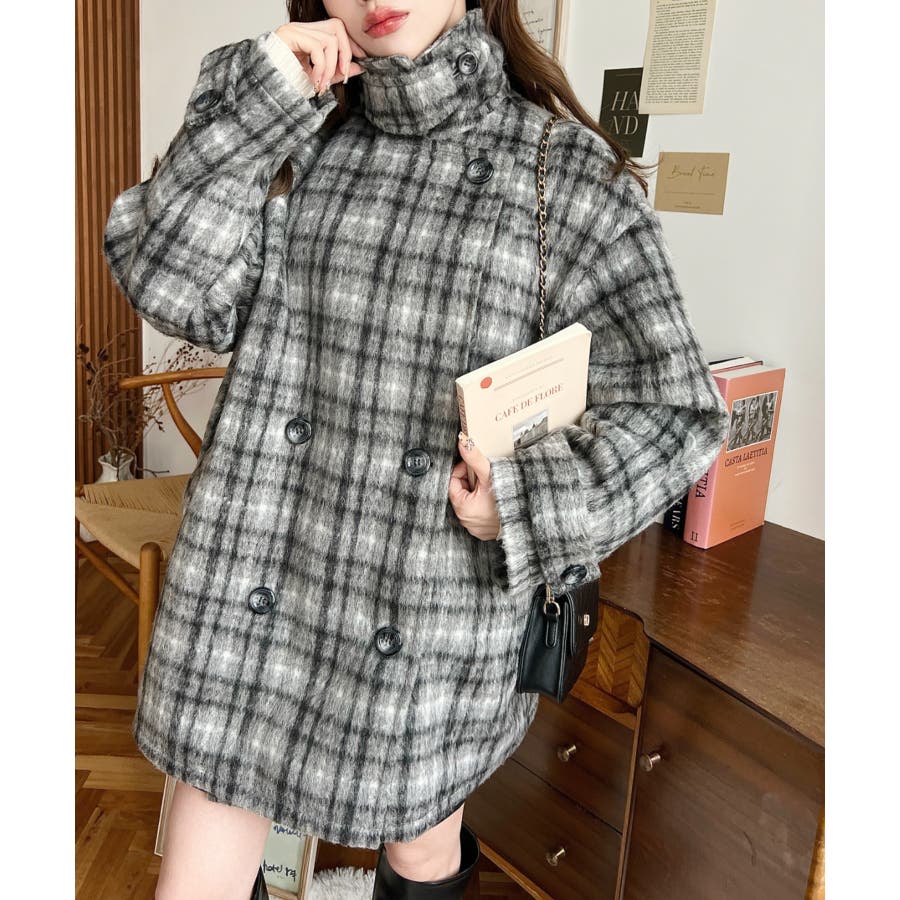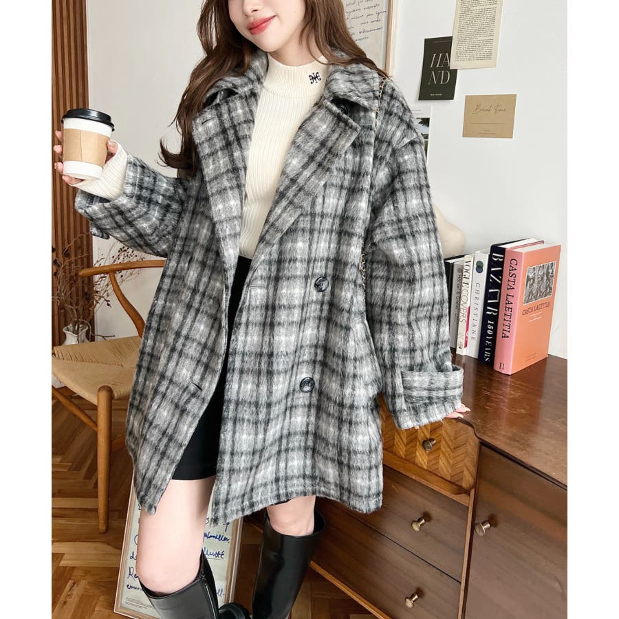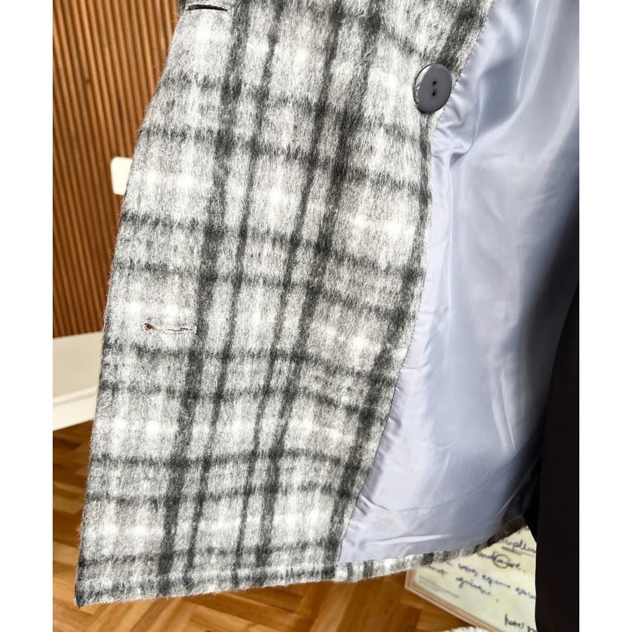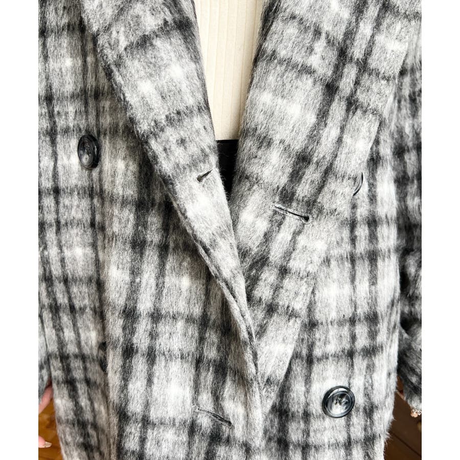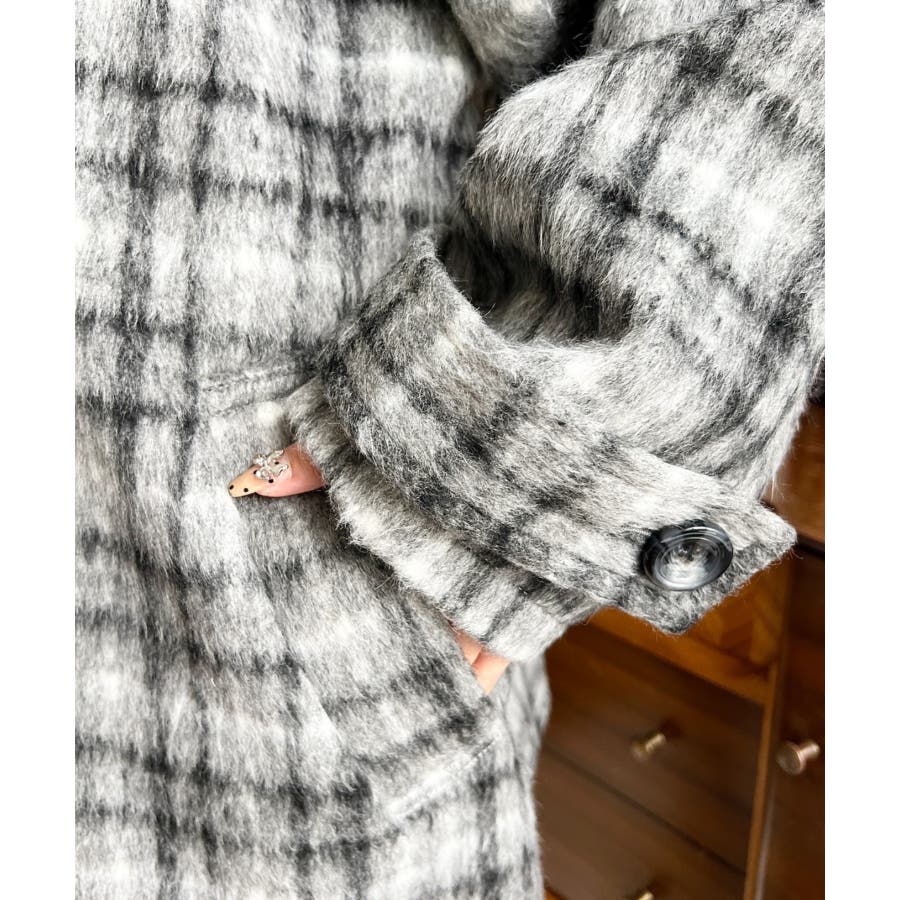 フェイクウールシャギーチェック&ニットモッサ無地オーバーサイズミドル丈Pコートジ…