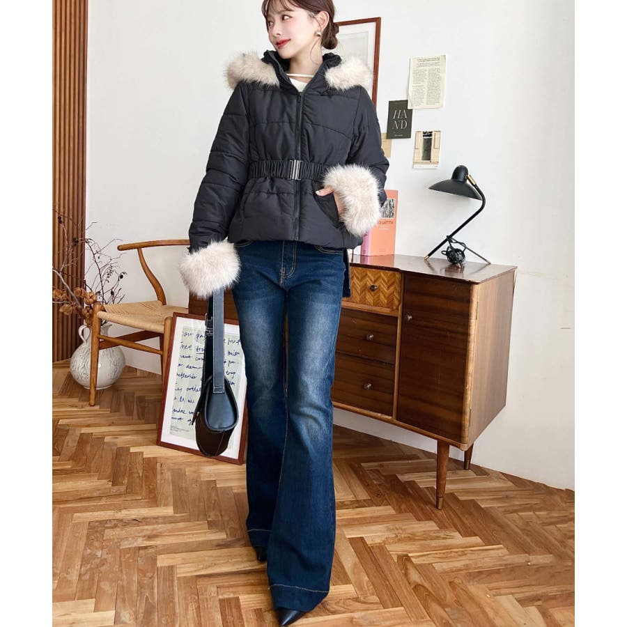 ・スウェットやデニムを合わせ、足元はスニーカーでラフに。ダウン素材がカジュアル見えしながらファーやペプラムシルエットで女性らしさもプラスしてくれます◎