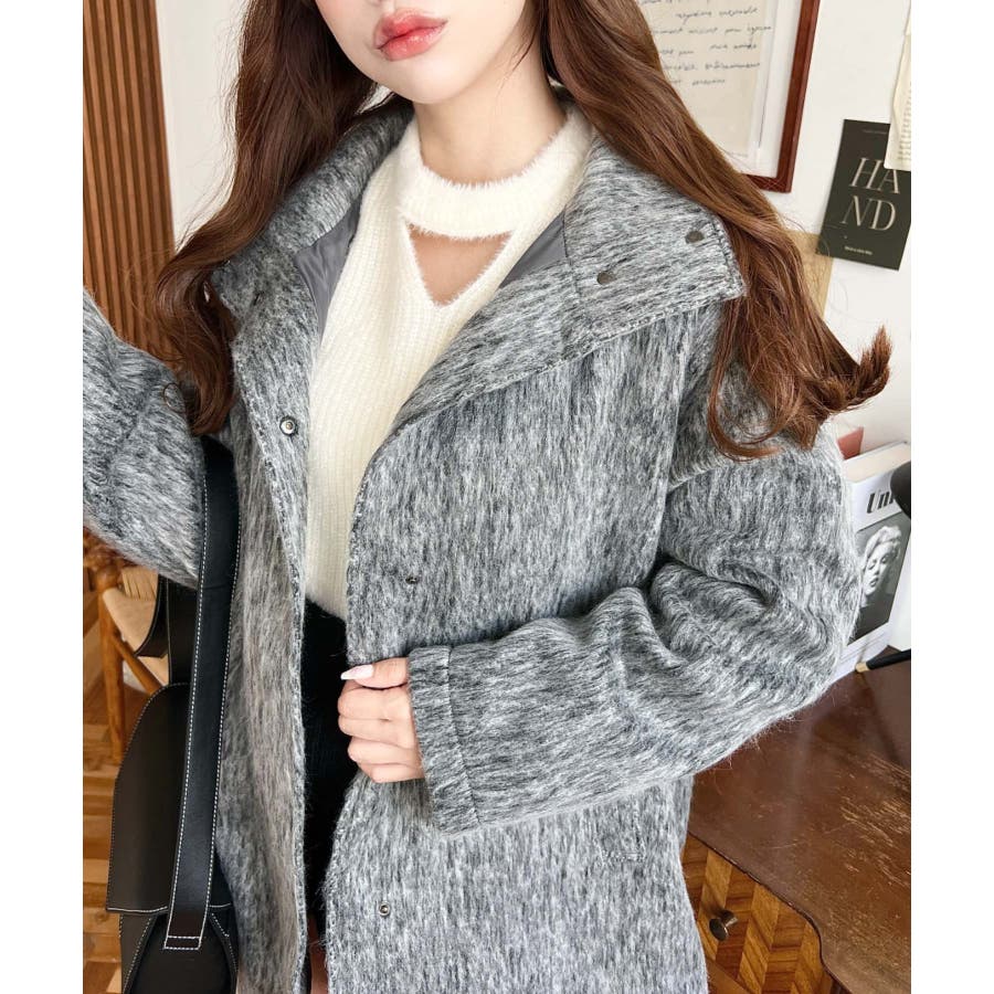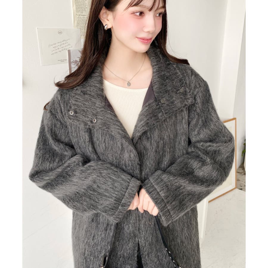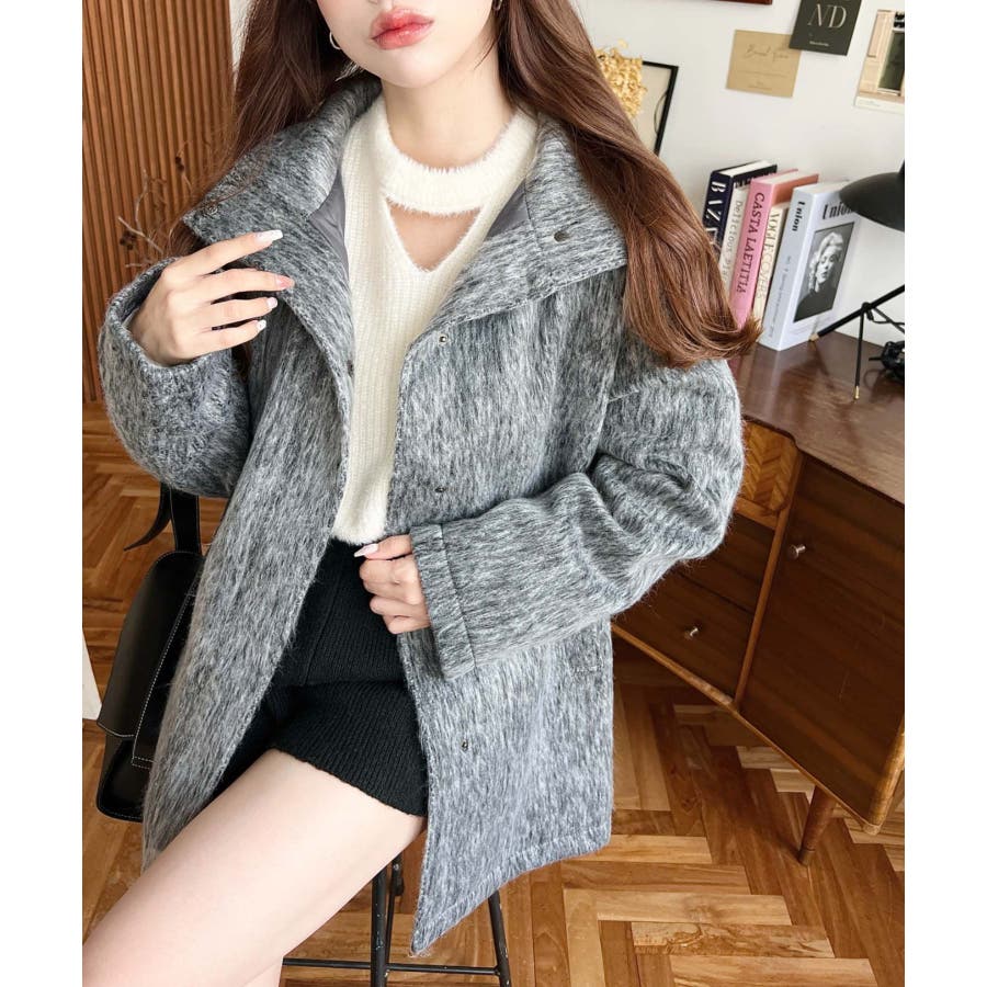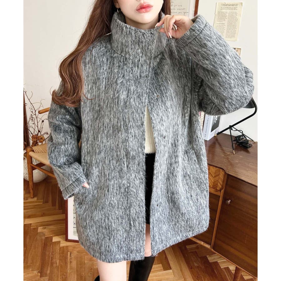スタンドカラージップアップメランジシャギーコート