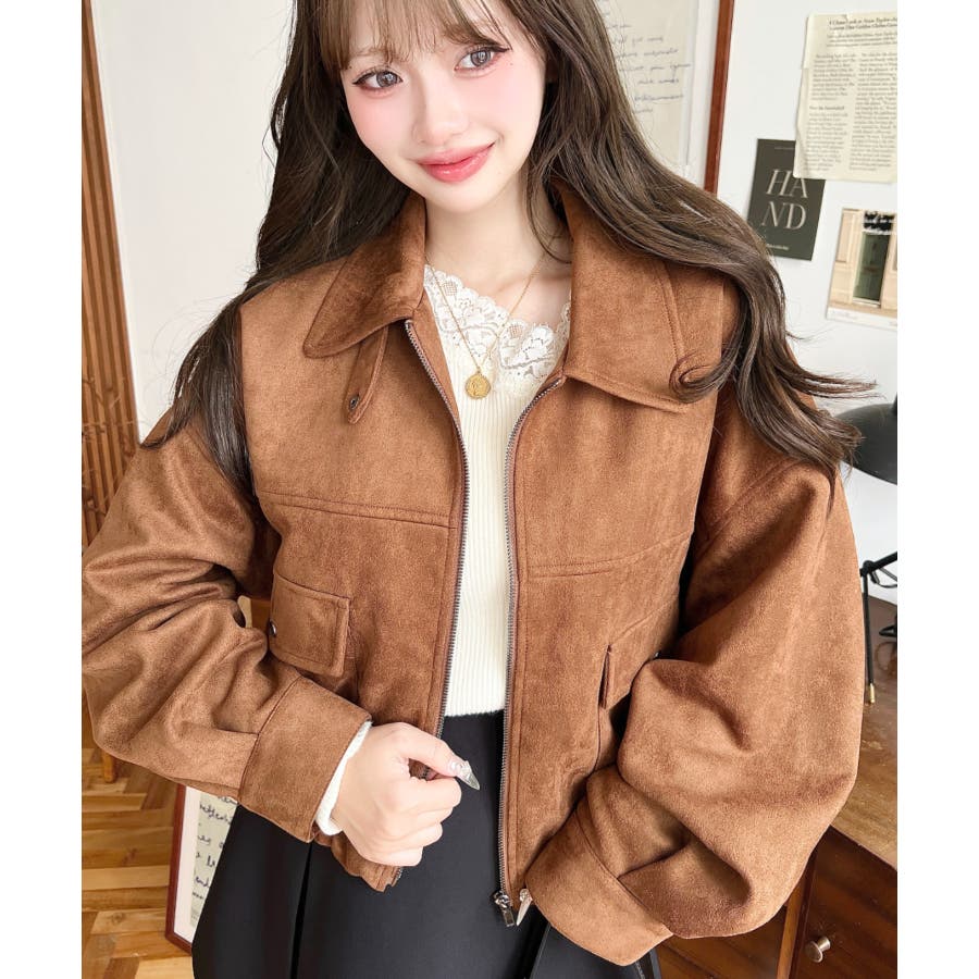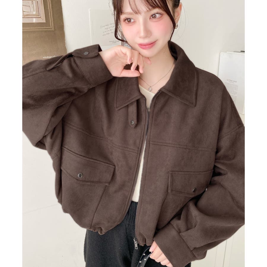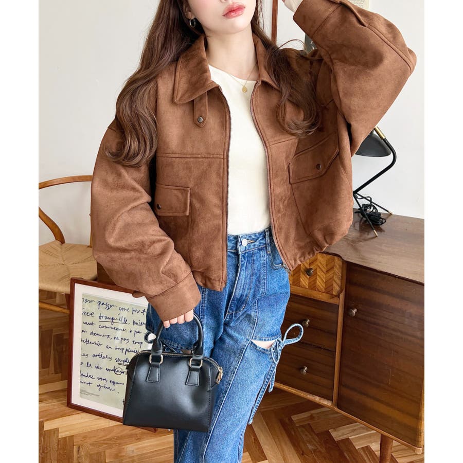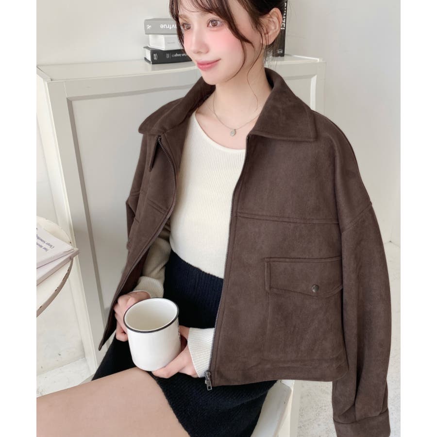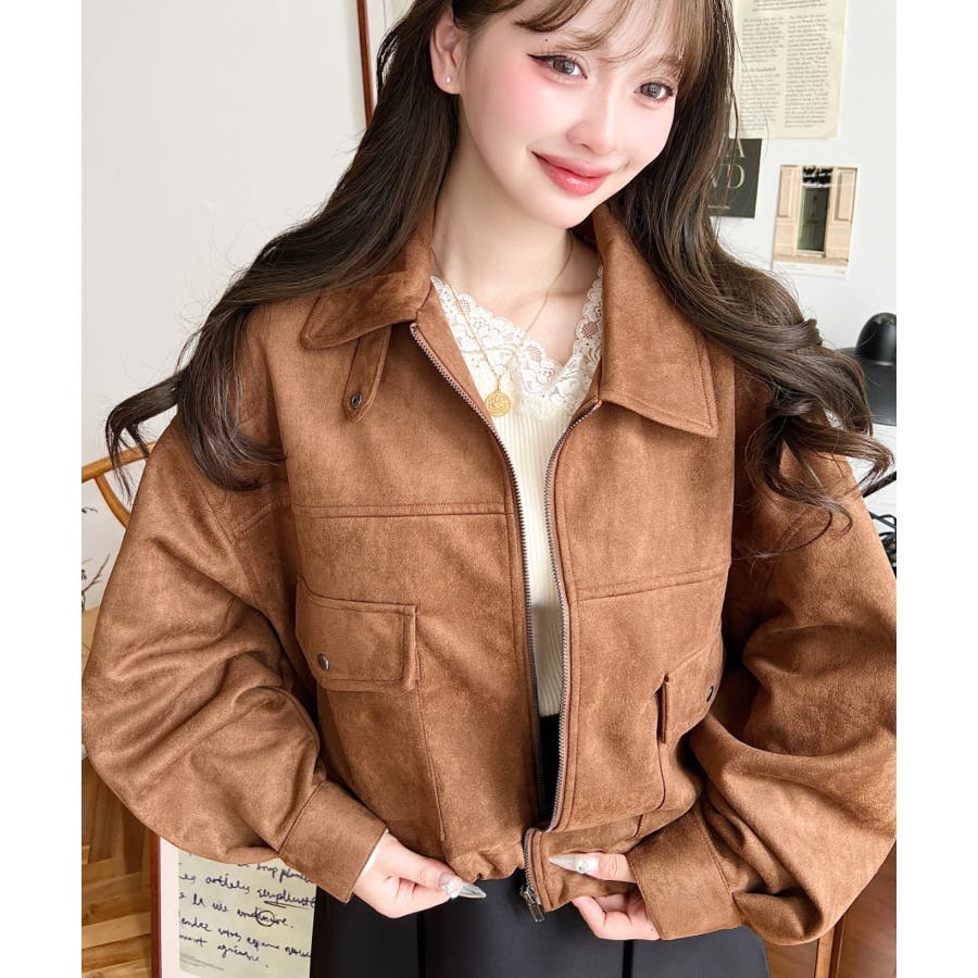 ・上品なフェイクスエードにトレンドライクなショート丈がお洒落見え間違いなしのフェイクレザーブルゾン!