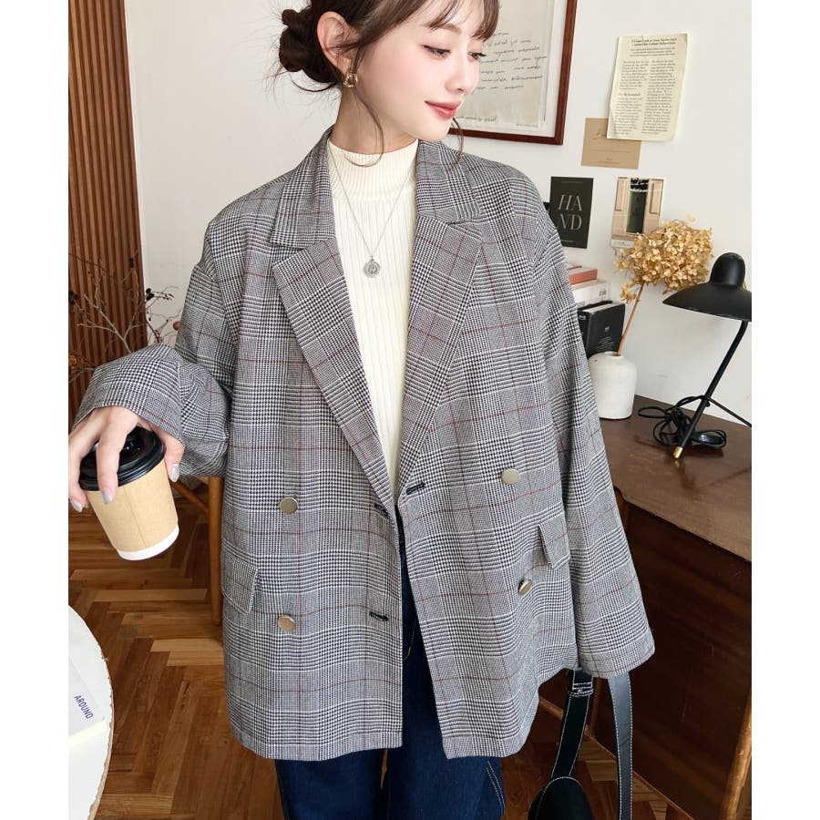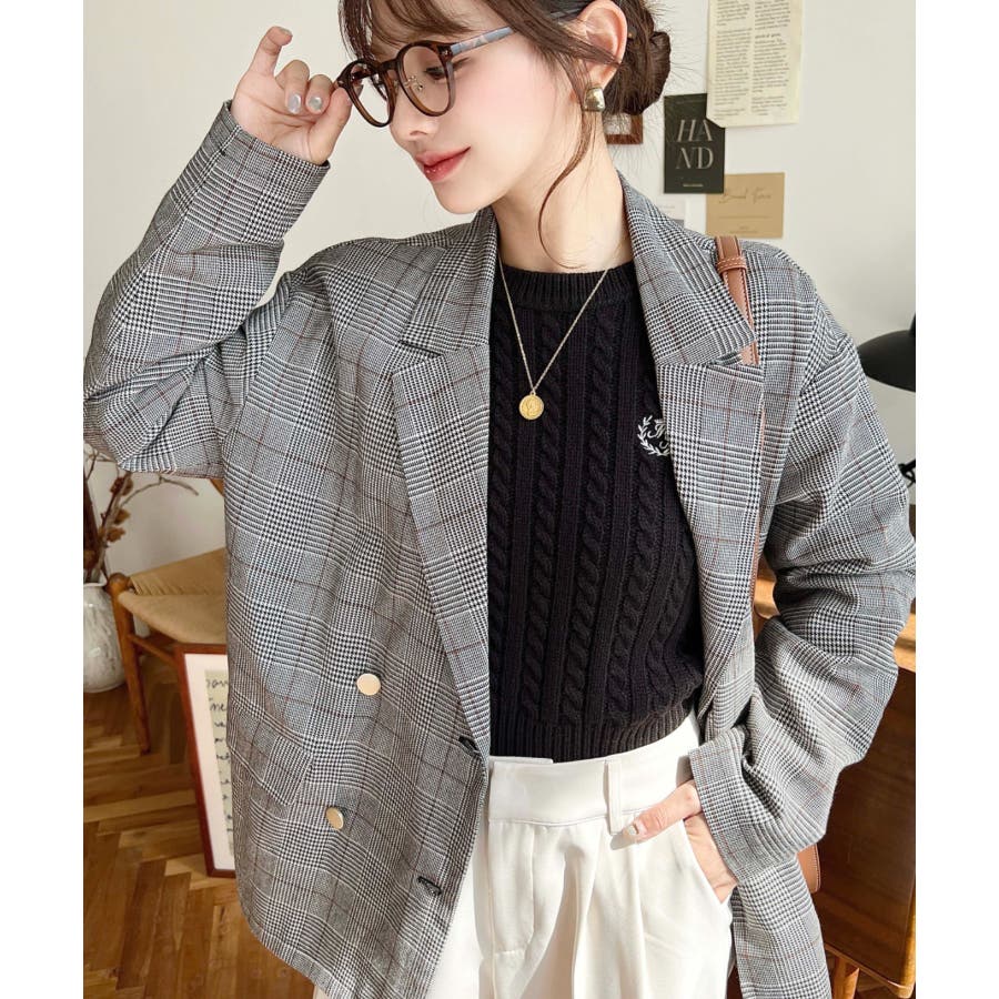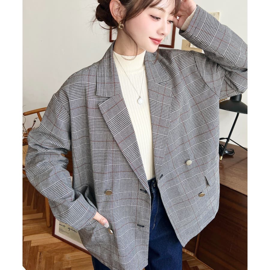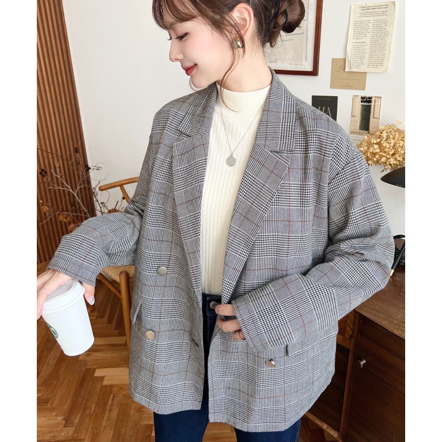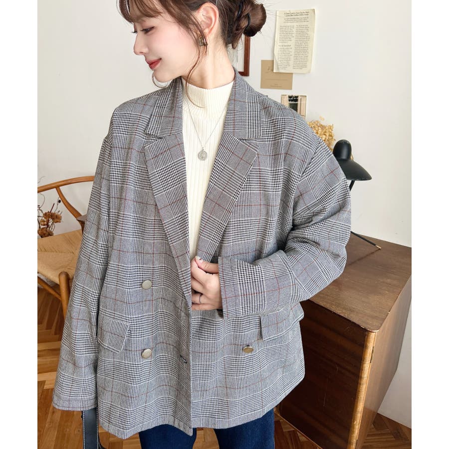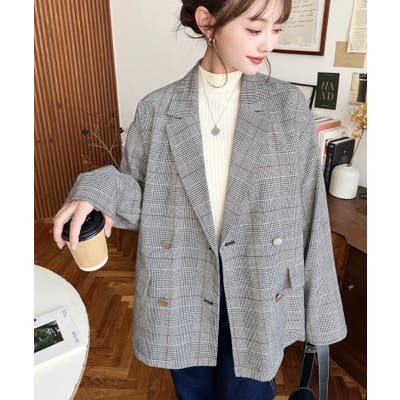 【マットゴールドのボタンが映える♪ グレンチェックダブルテーラードジャケット】