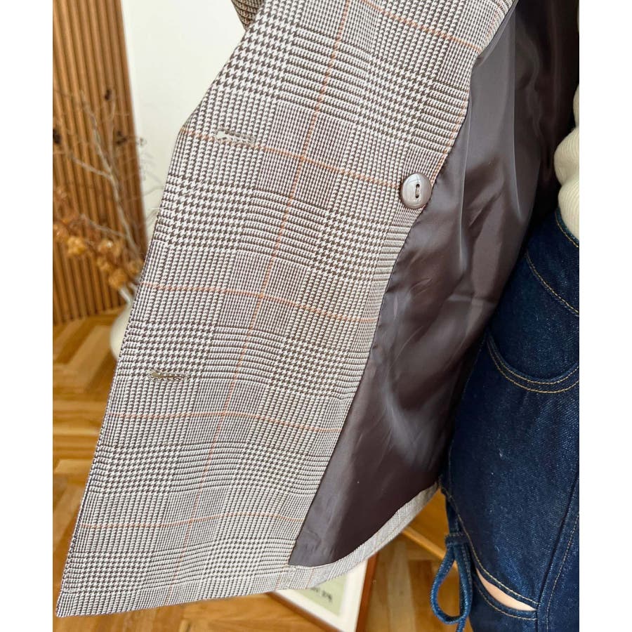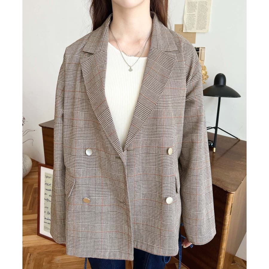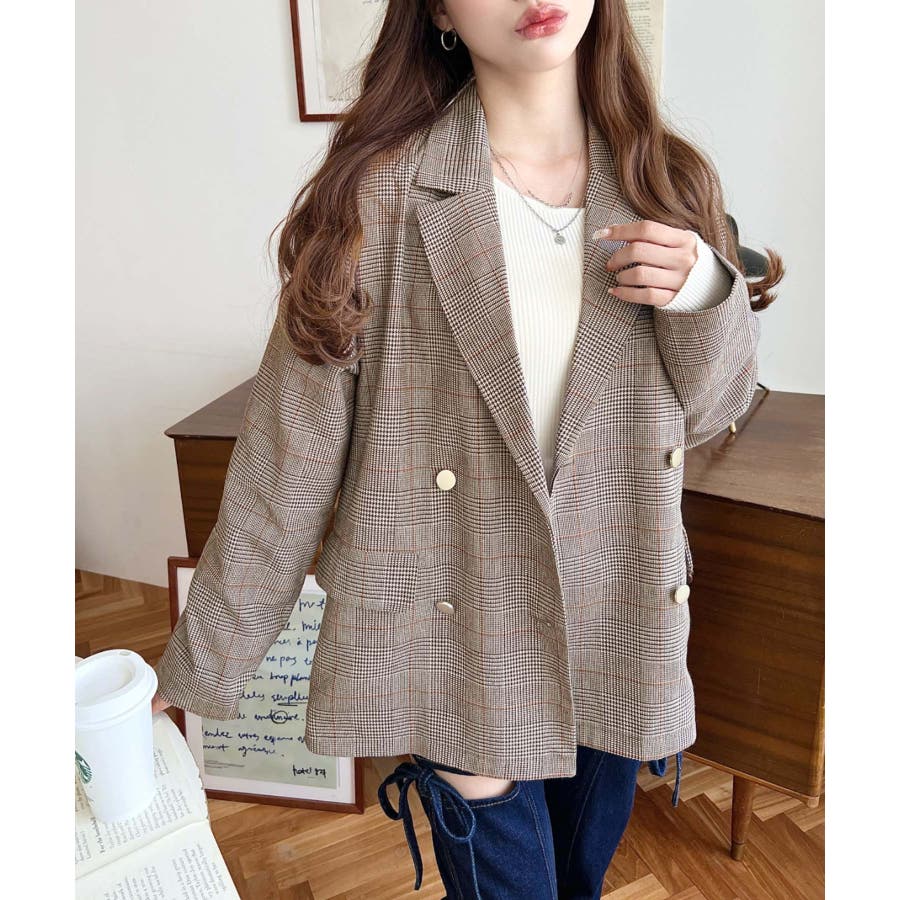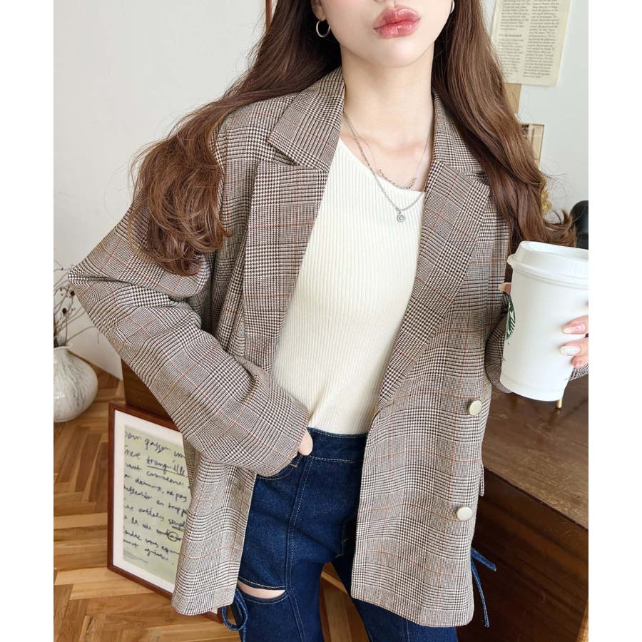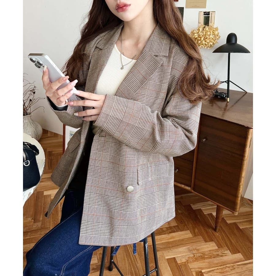 【マットゴールドのボタンが映える♪ グレンチェックダブルテーラードジャケット】