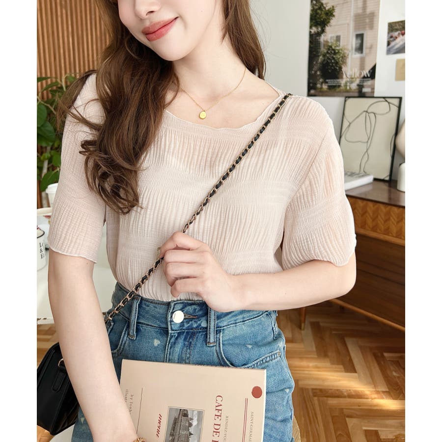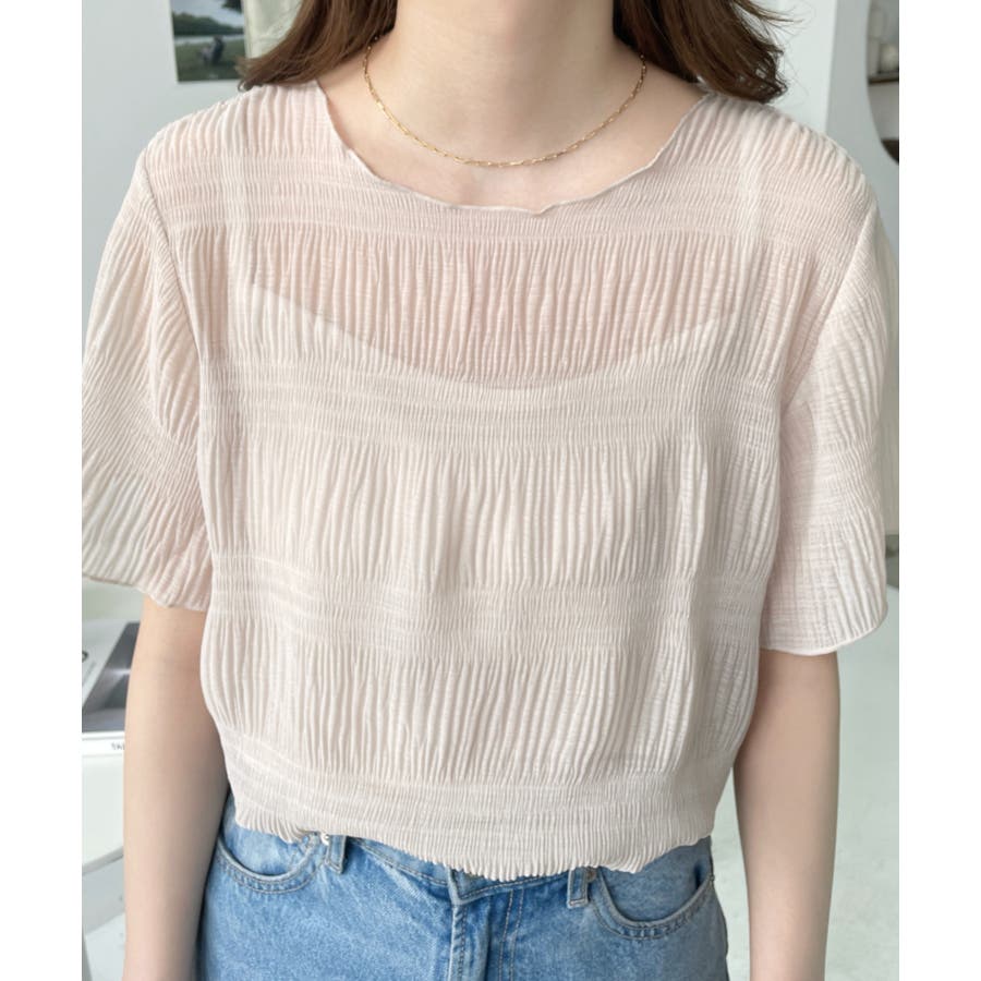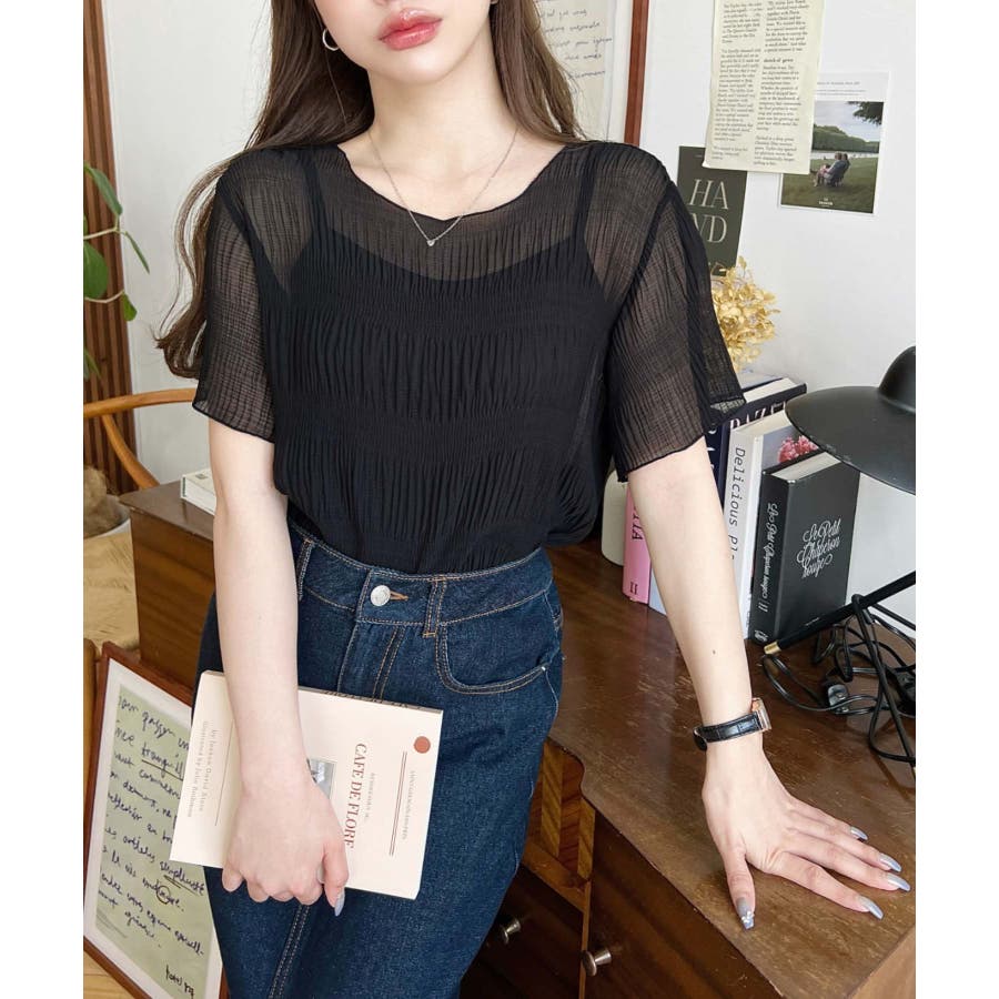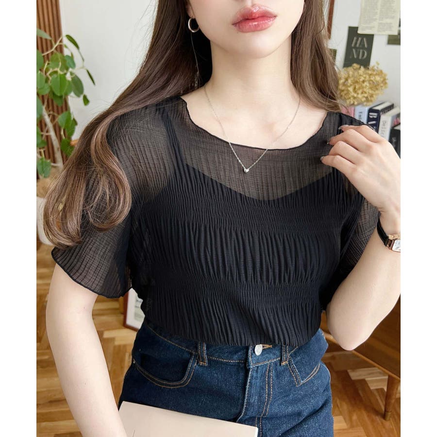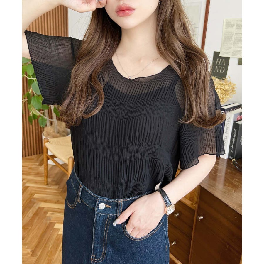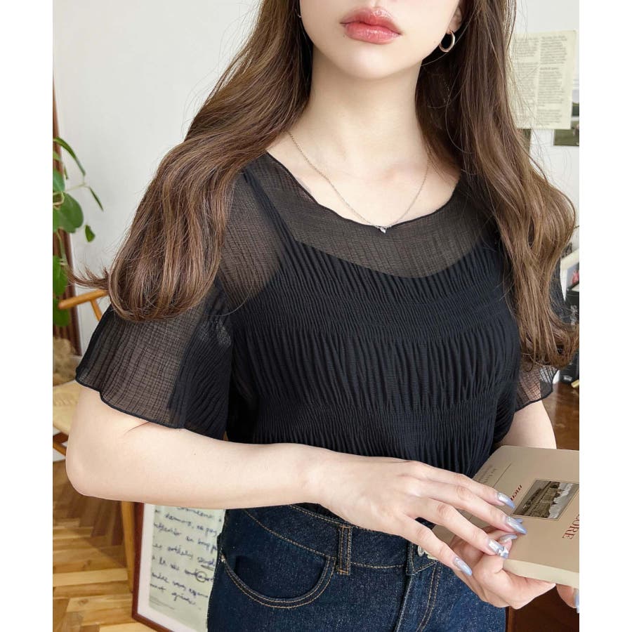 シャツ ブラウス 半袖 プリーツ フリル クルーネック ナチュラル インナー付き キャミ付き メローフリル 楊柳 透け感 シアー 通気性 レイヤード 重ね着 着回し プルオーバー シンプル 無地 インナー レディース レディースファッション トップス プチプラ 定番 SS 春 夏 mt02170