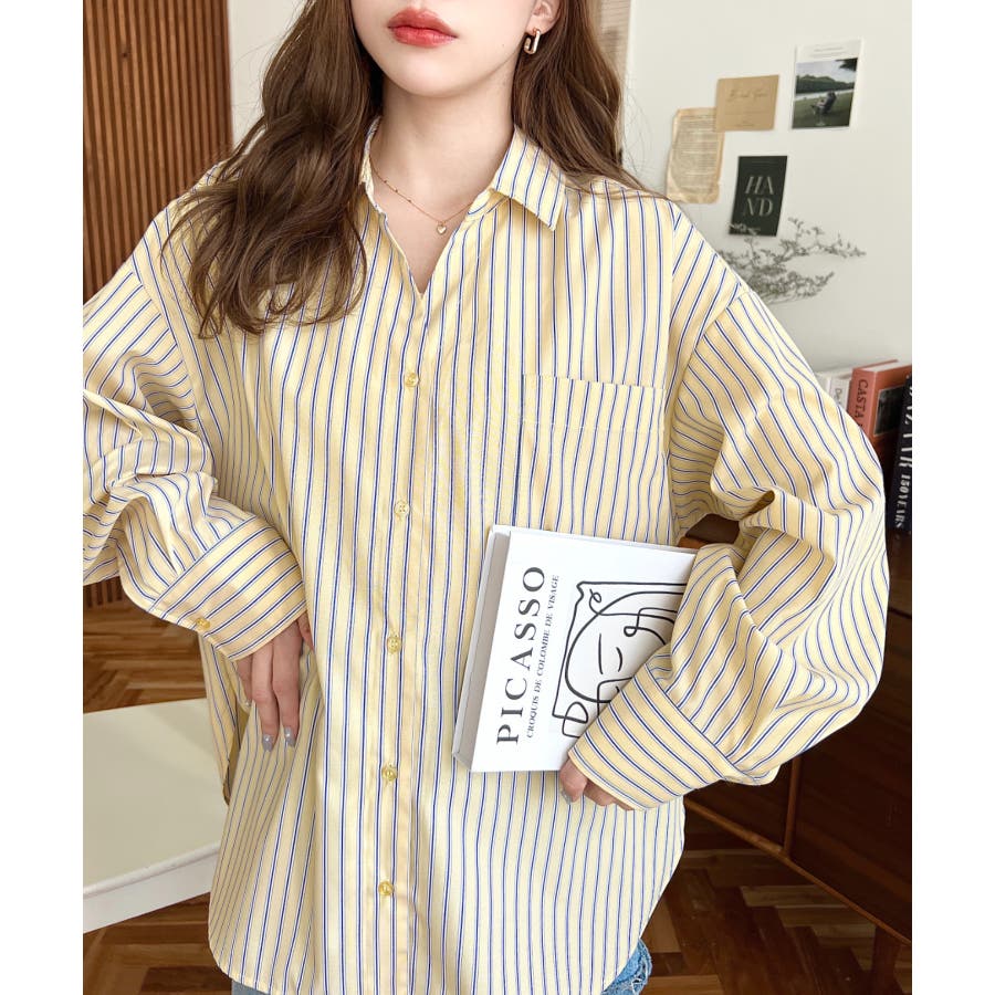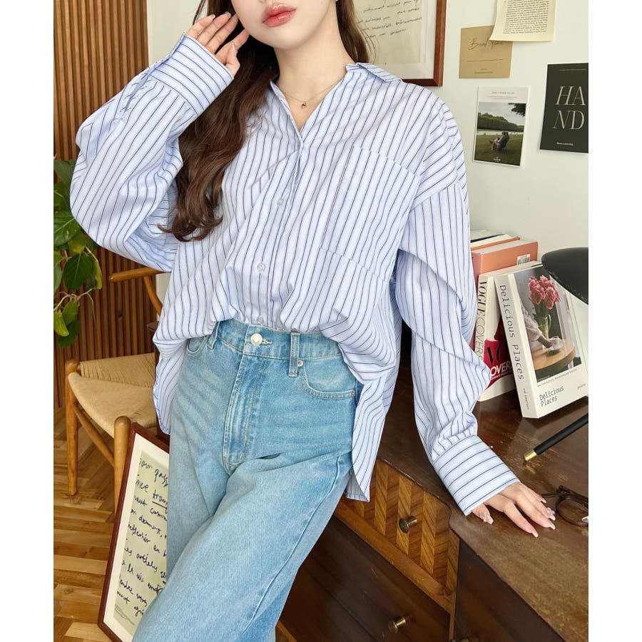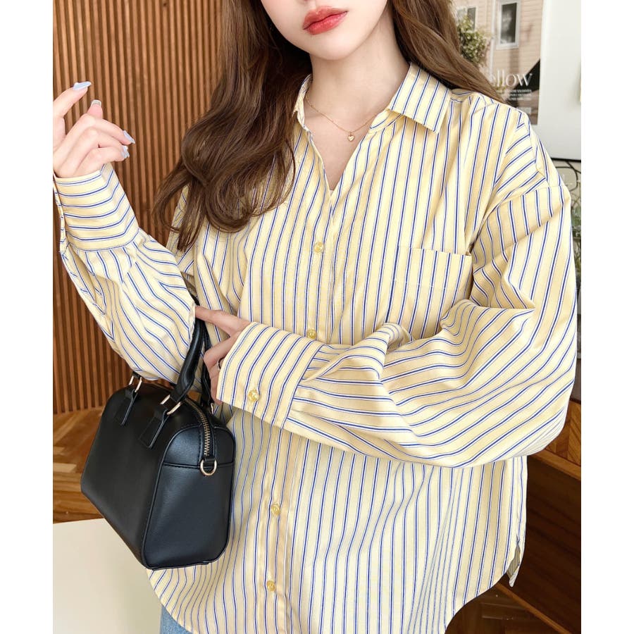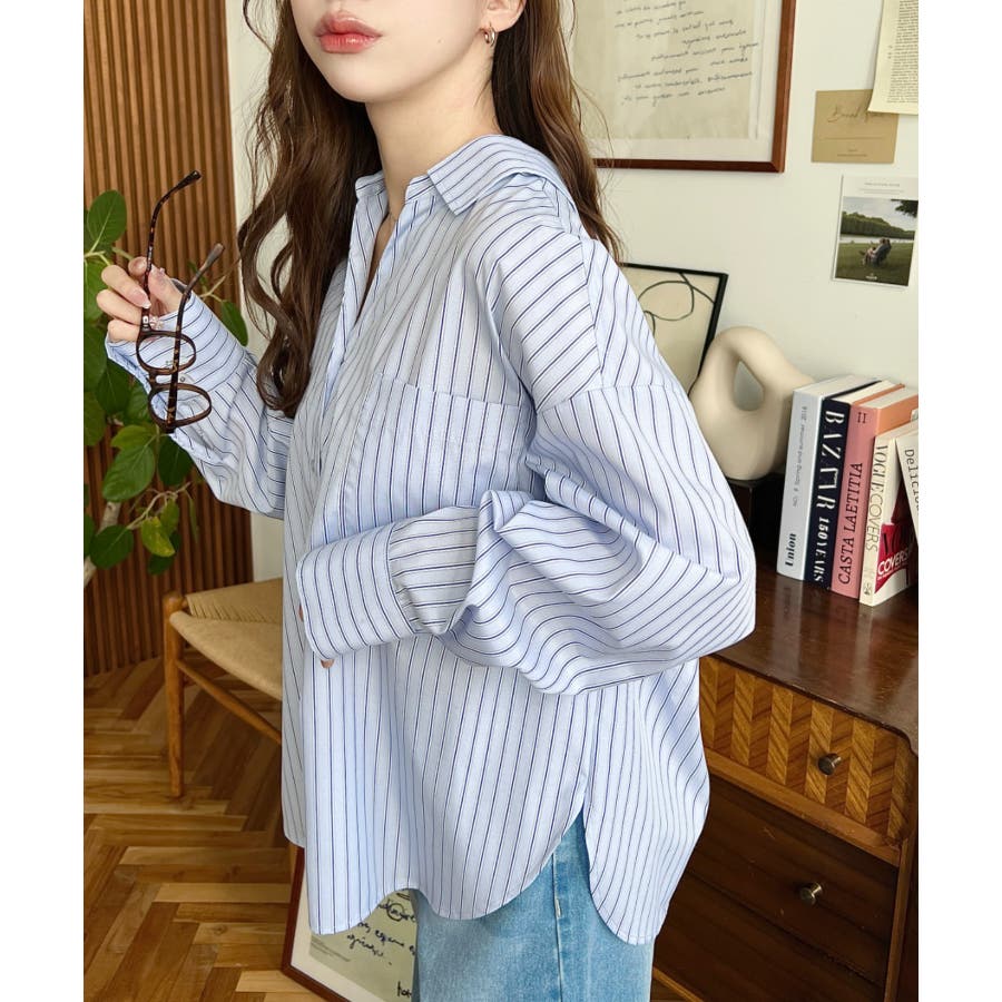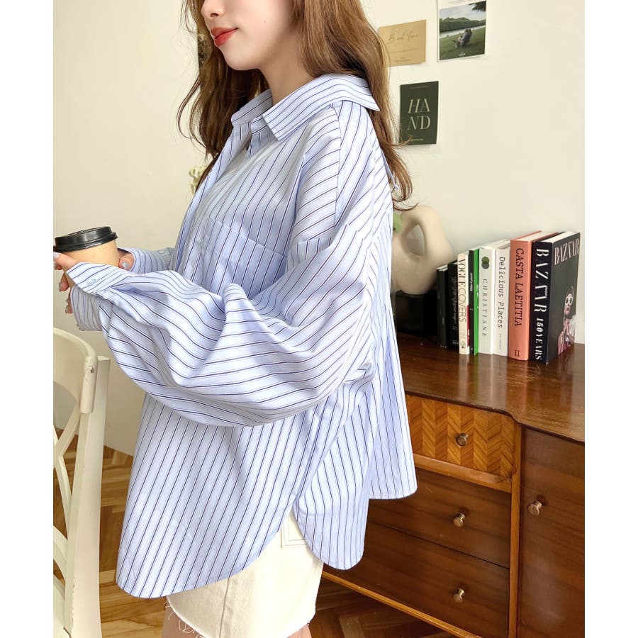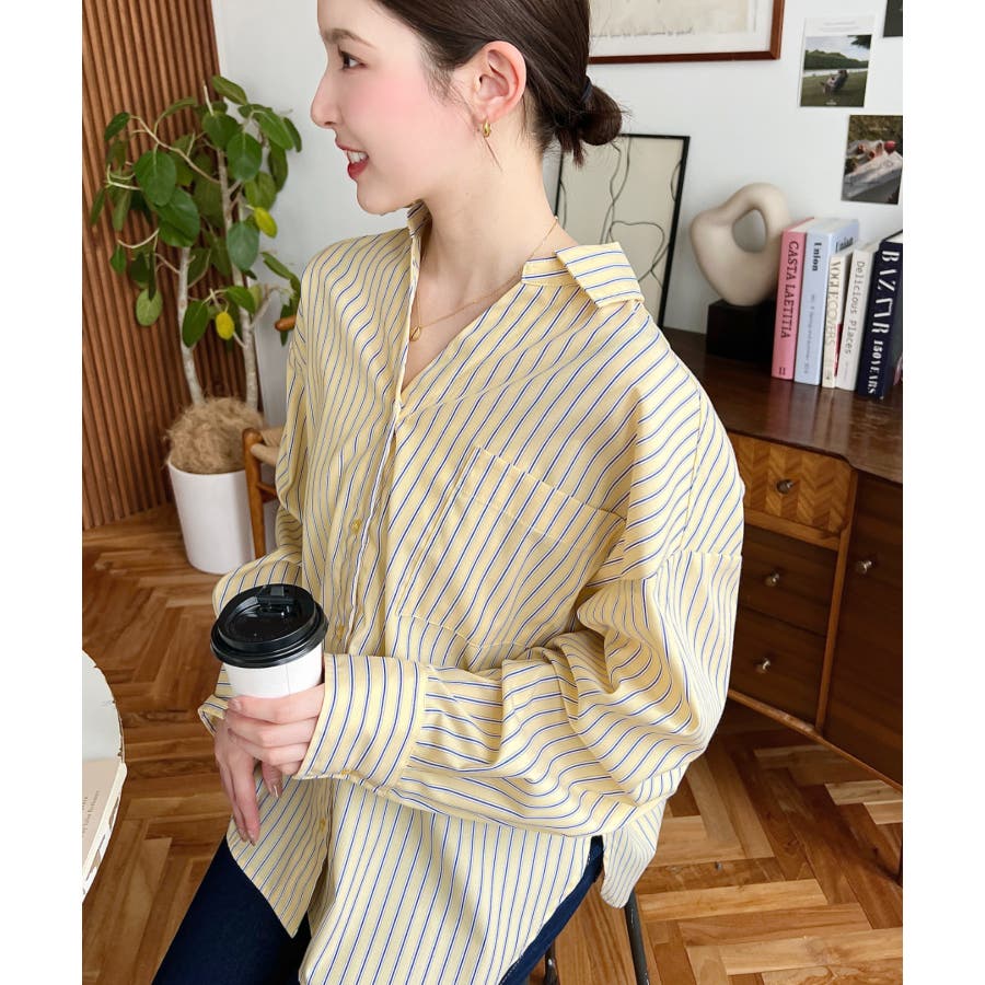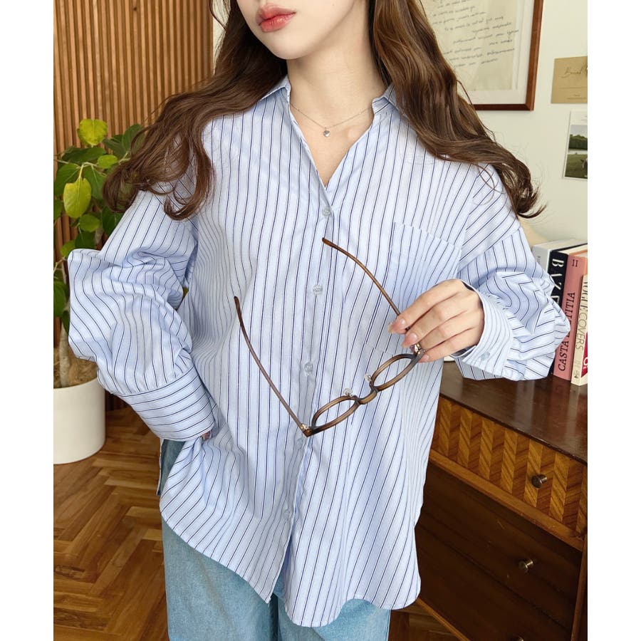 シャツ ブラウス ストライプ バックレース リボン ロング丈 体型カバー ゆったり ドロップショルダー 襟 長袖 着回し 重ね着 レディース レディースファッション トップス 大人カジュアル プチプラ 定番 SS AW 春 夏 秋 冬 mt02199