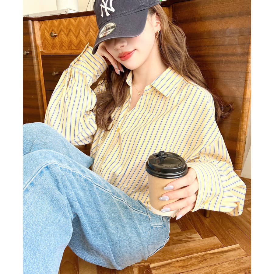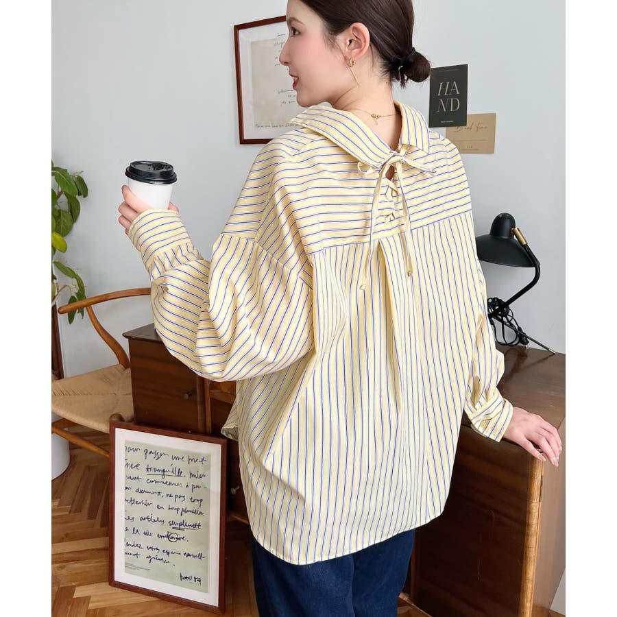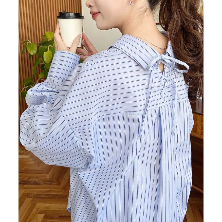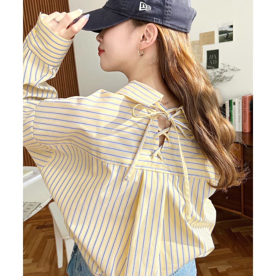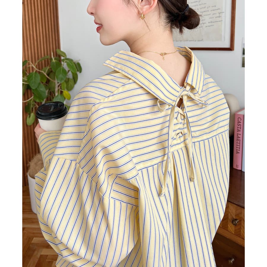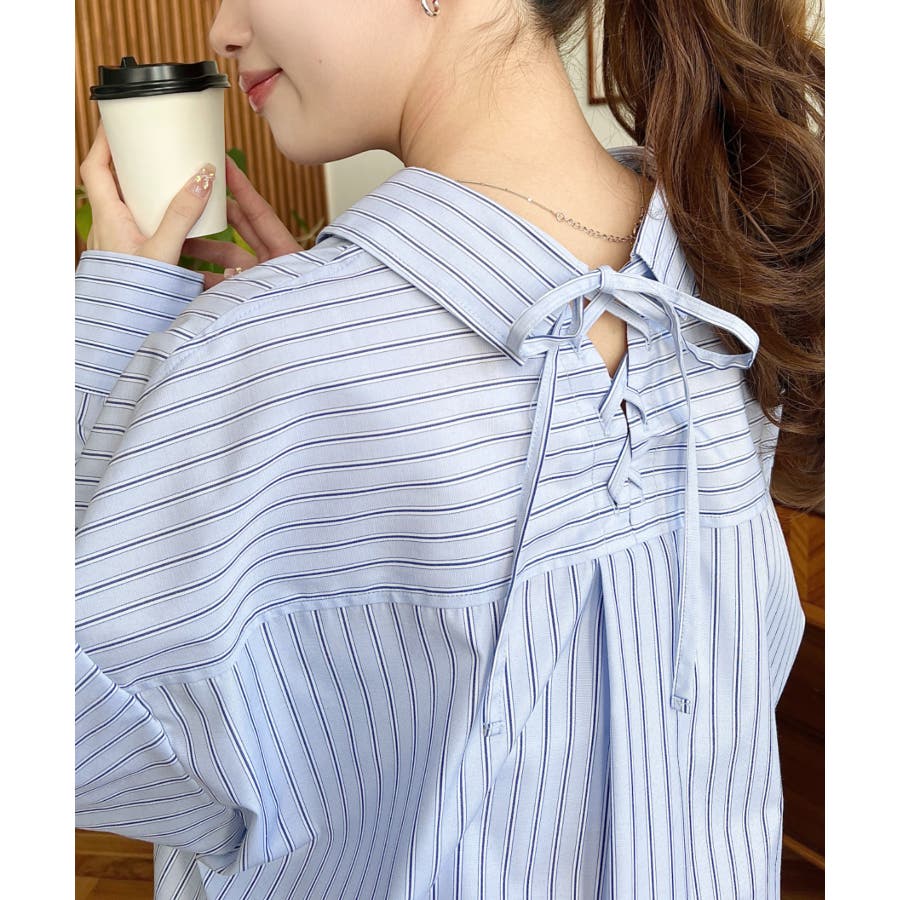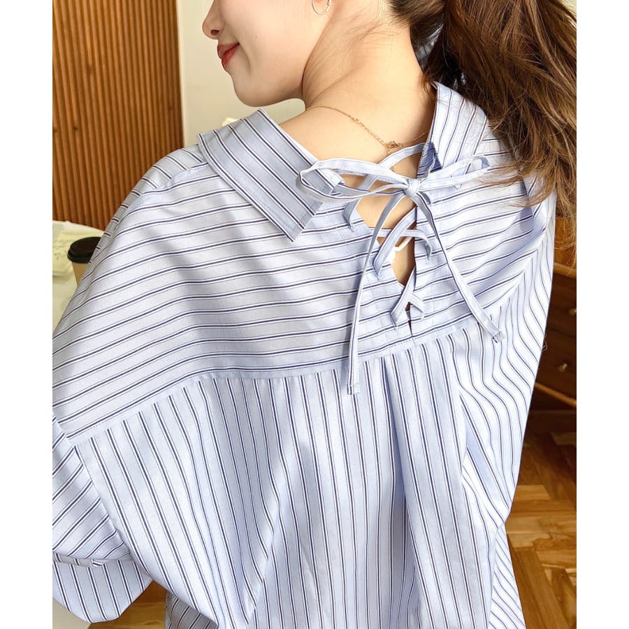 ・ベーシックなストライプ柄のシンプルシャツに後ろ姿まで抜かりなくお洒落見えするバックレースアップを施した優秀アイテム◎