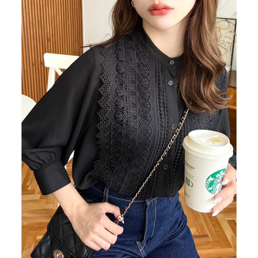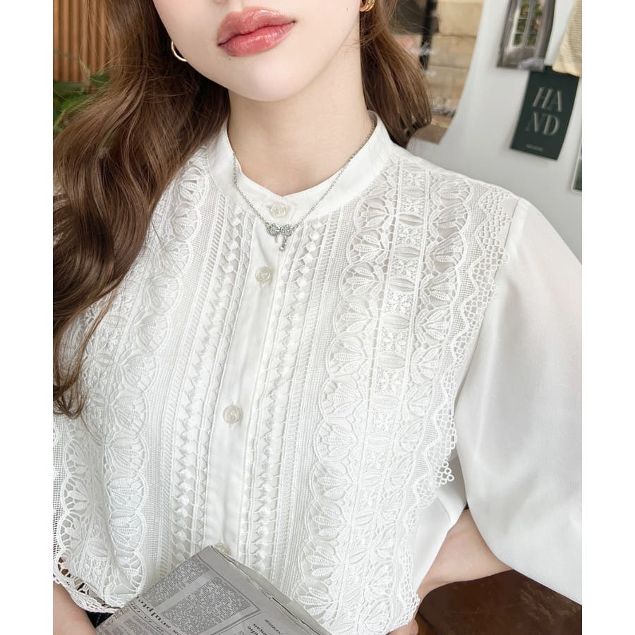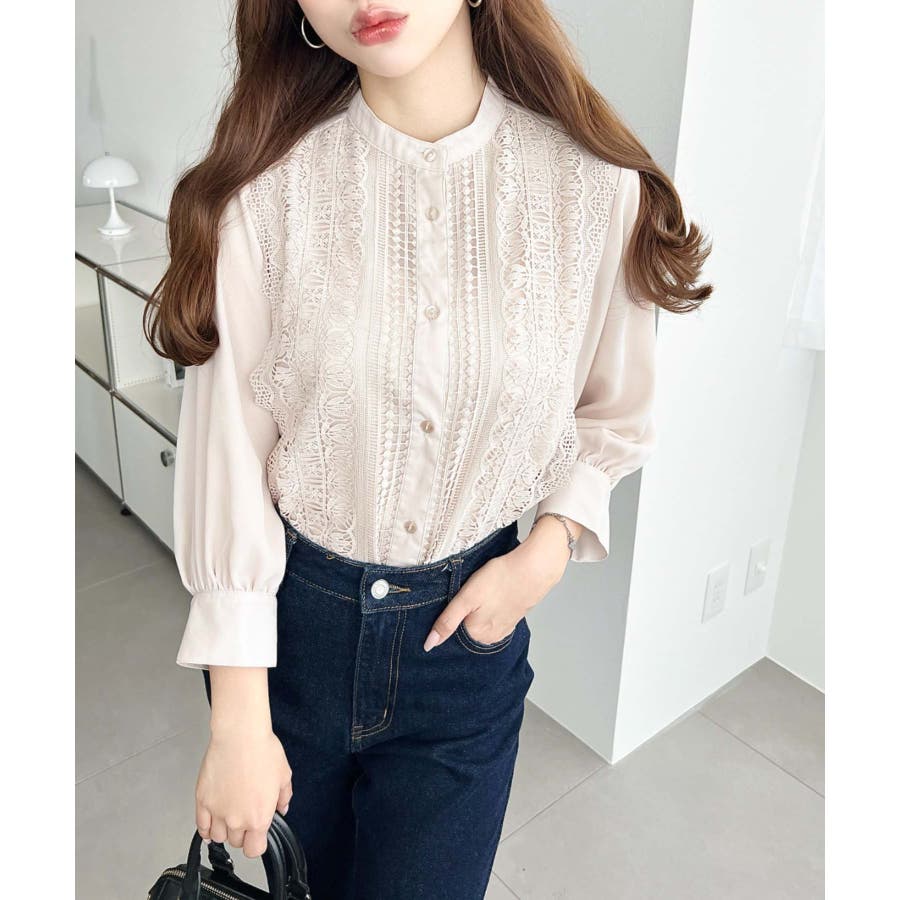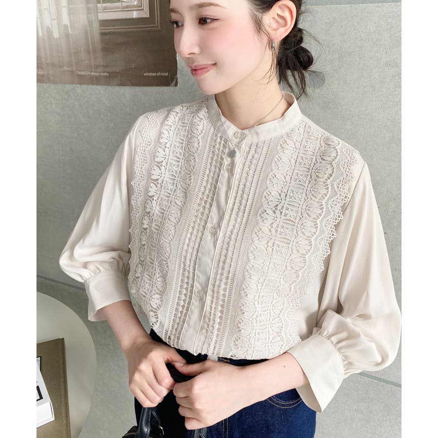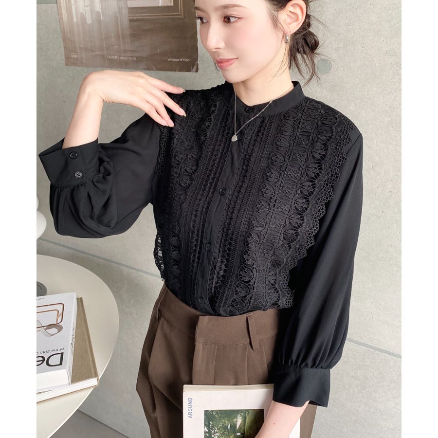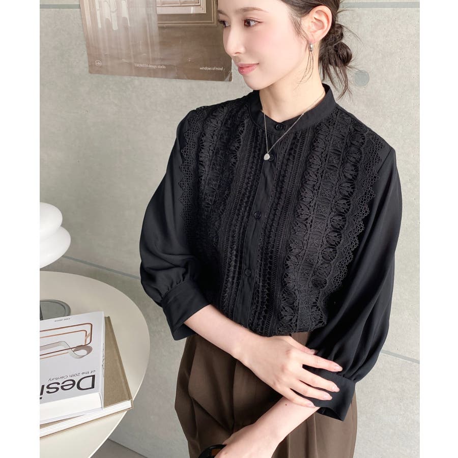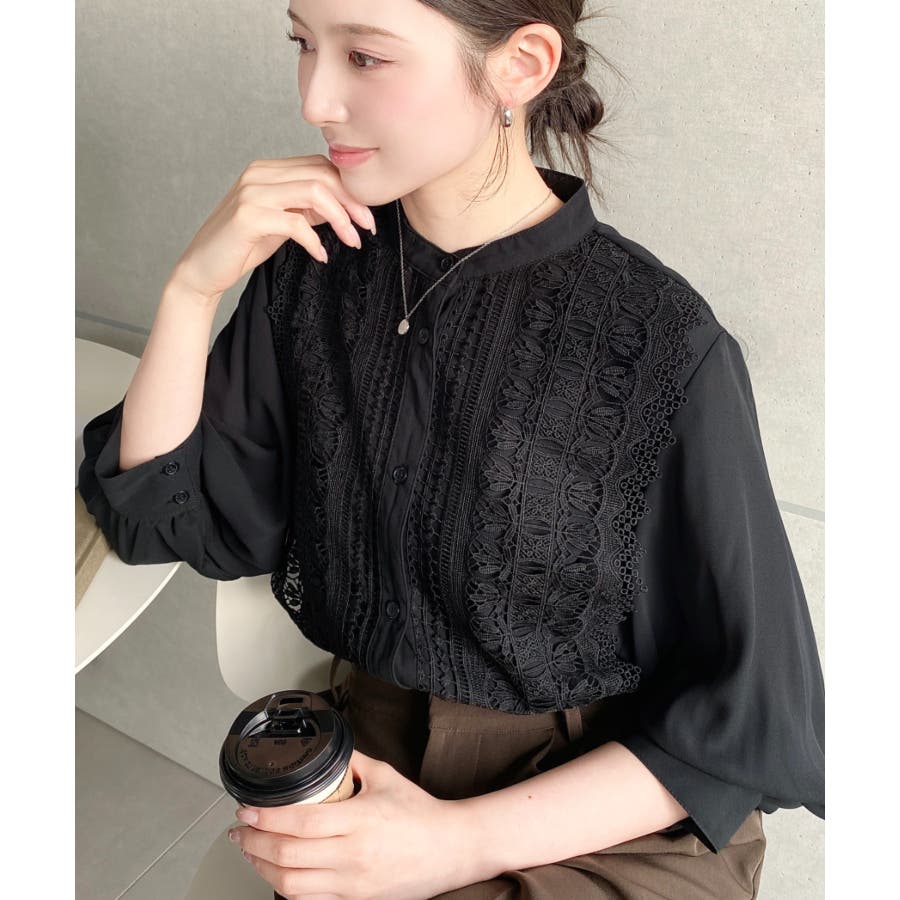 シフォンジョーゼットスタンドカラーフロントレースシャツ