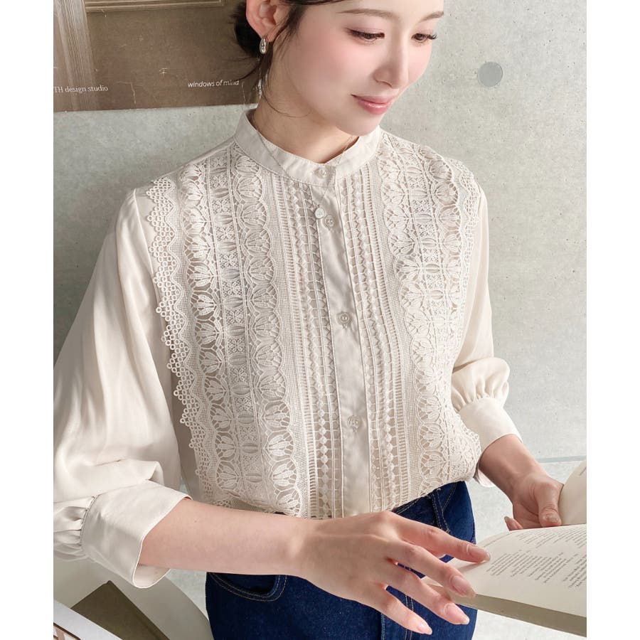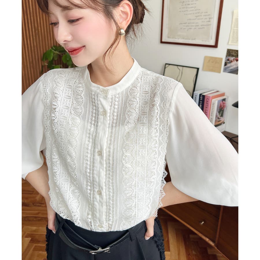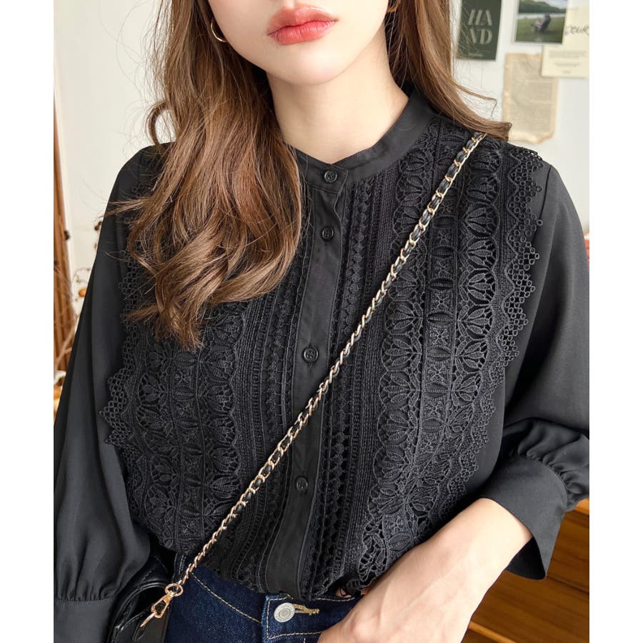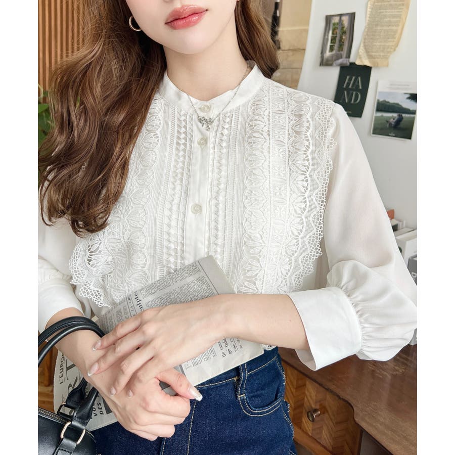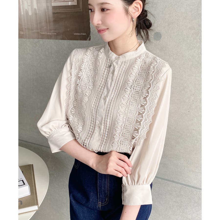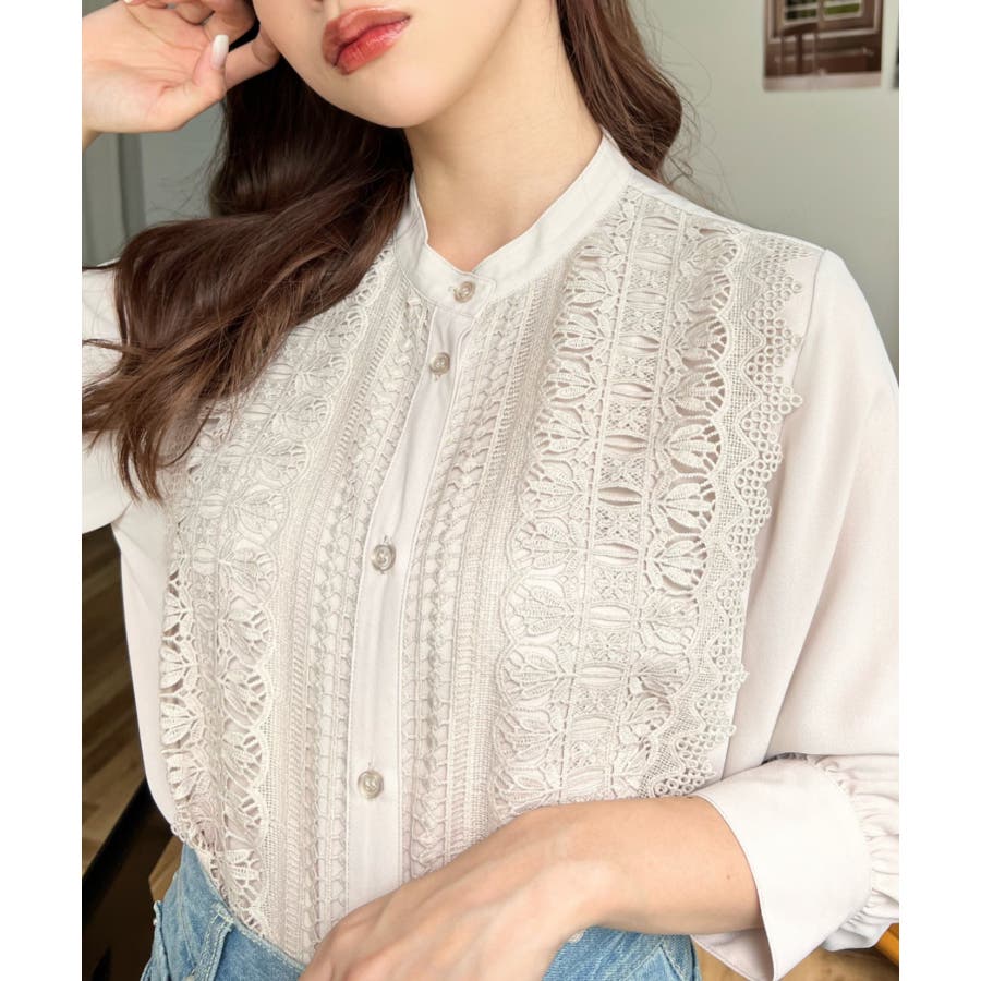 シフォンジョーゼットスタンドカラーフロントレースシャツ