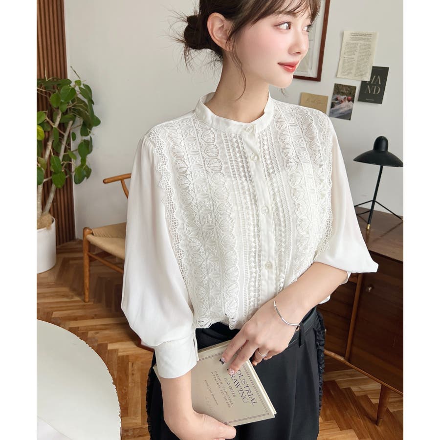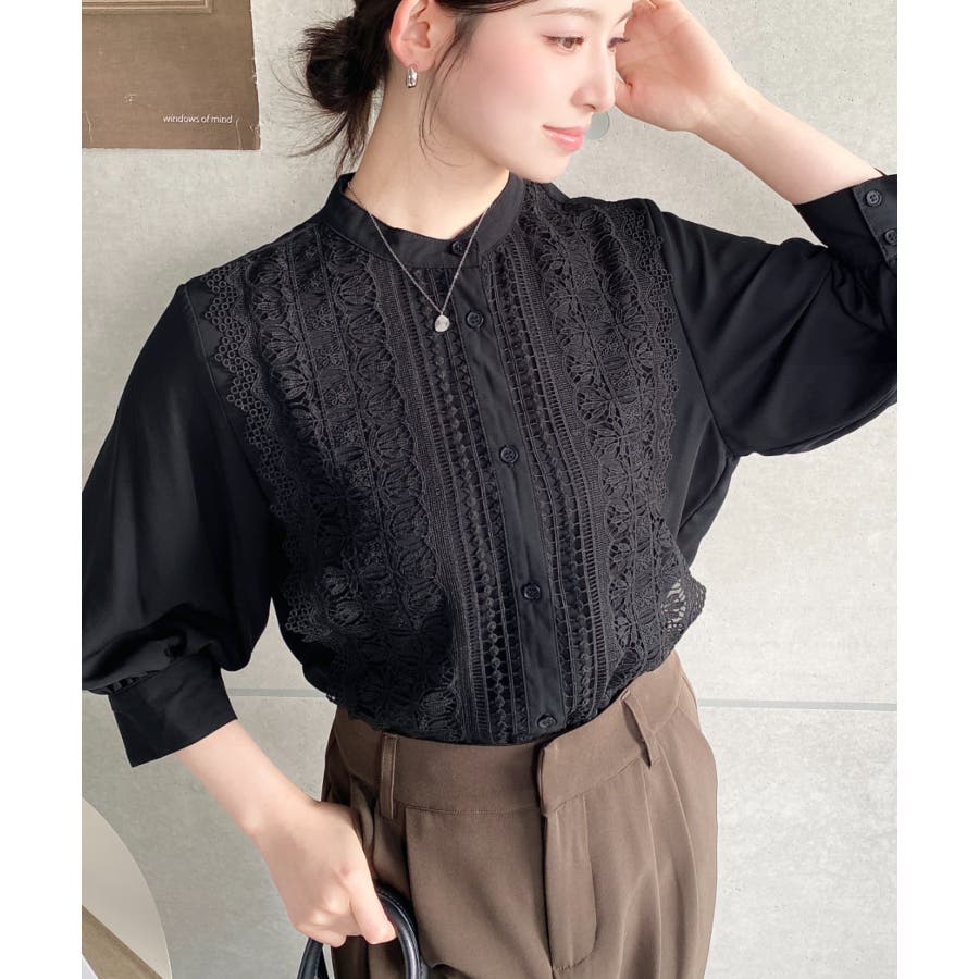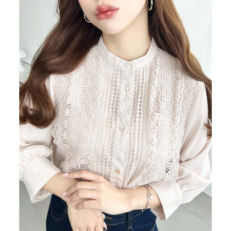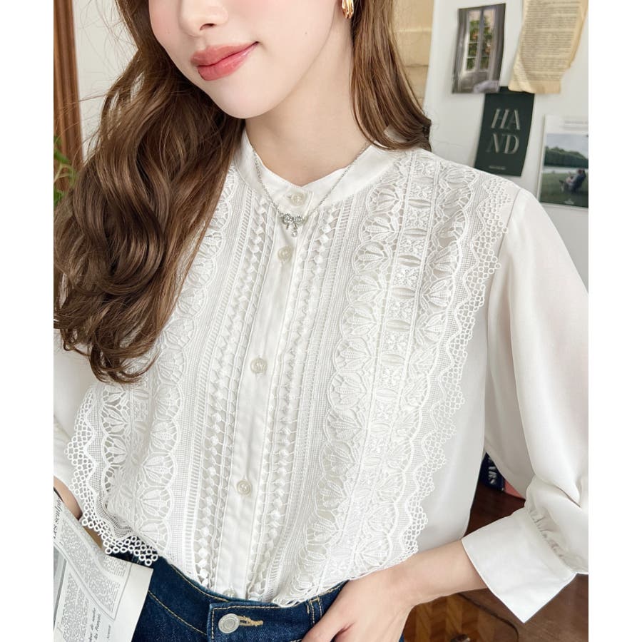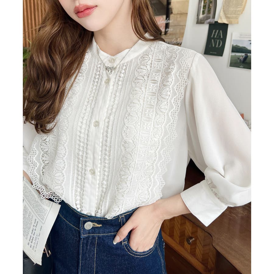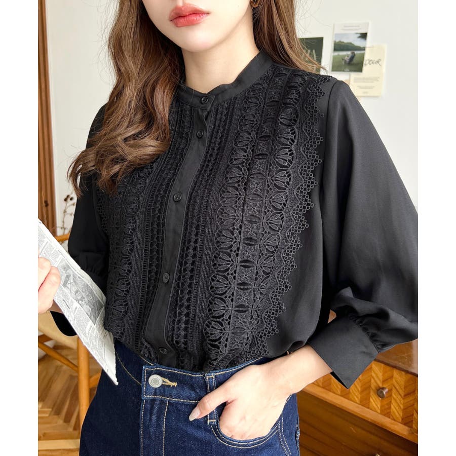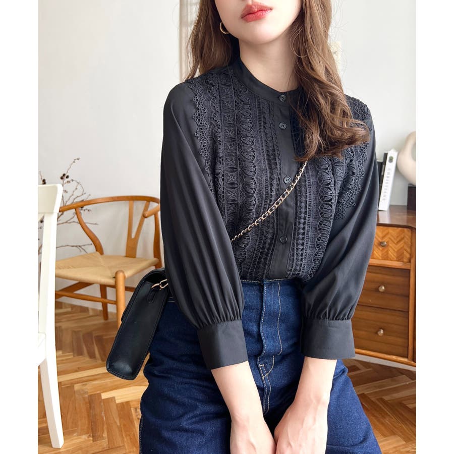 シフォンジョーゼットスタンドカラーフロントレースシャツ