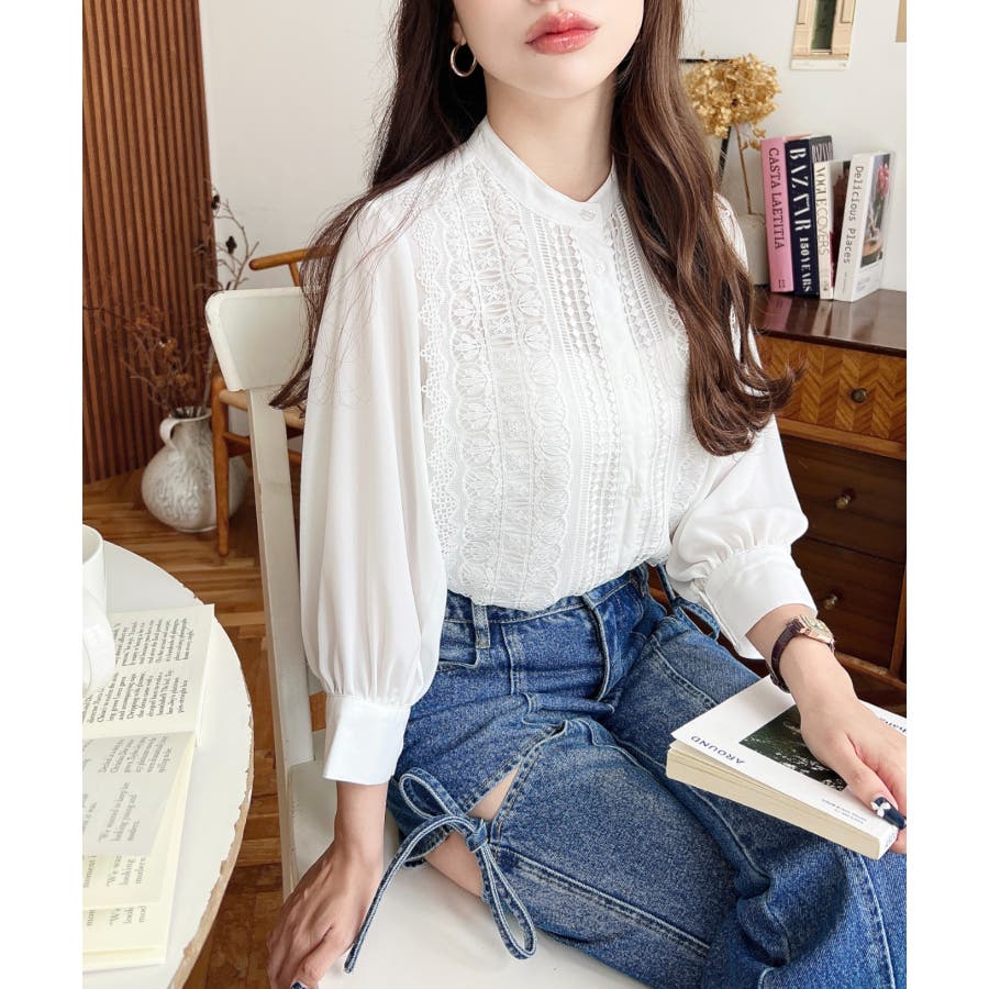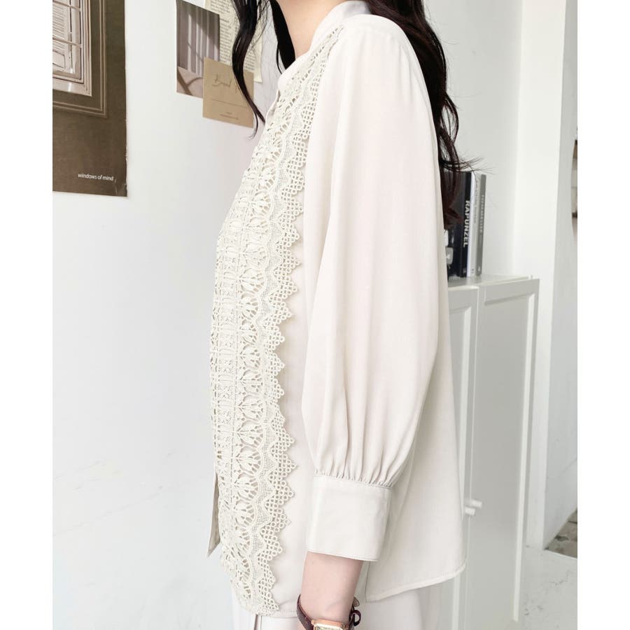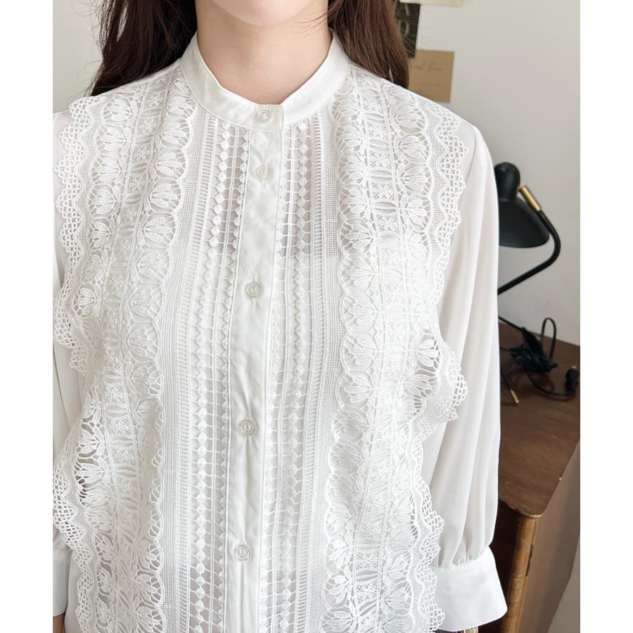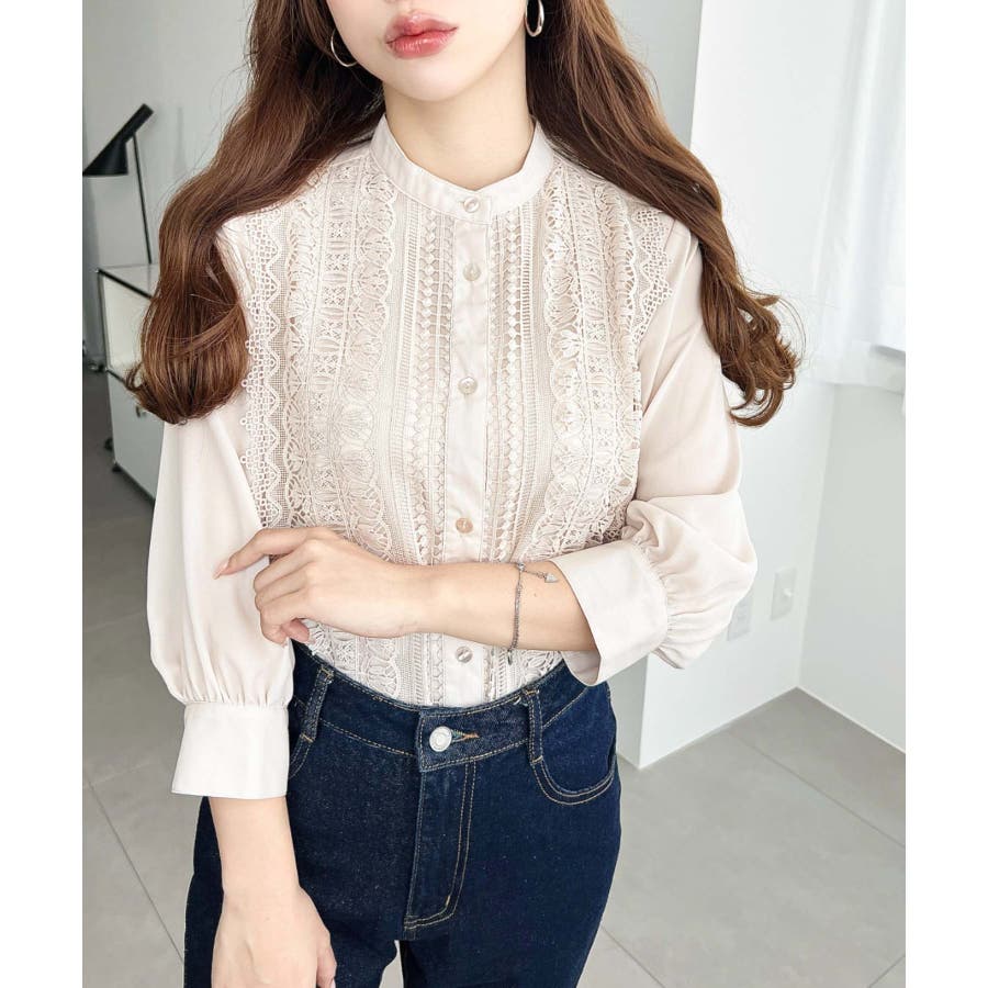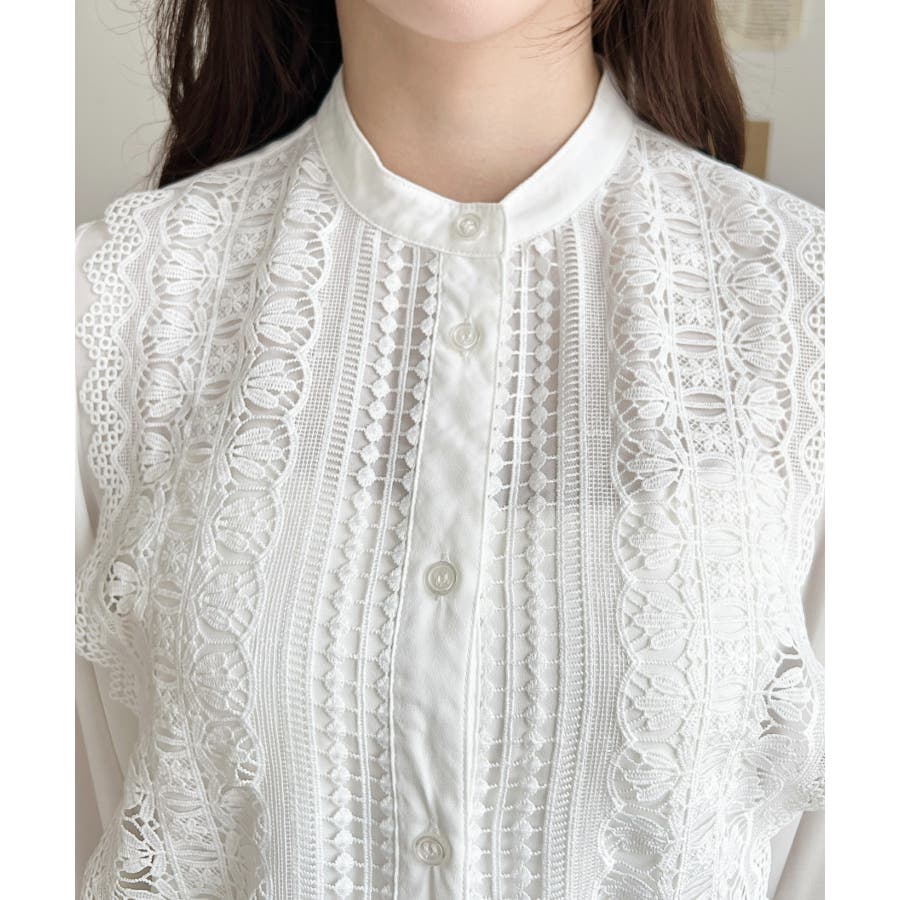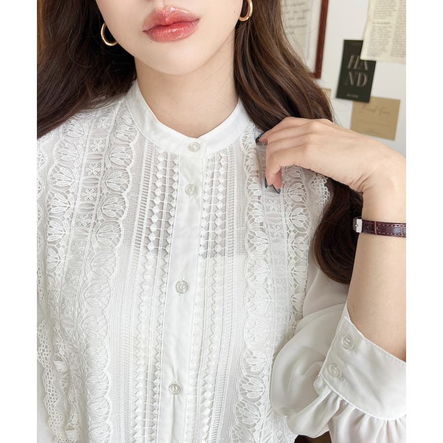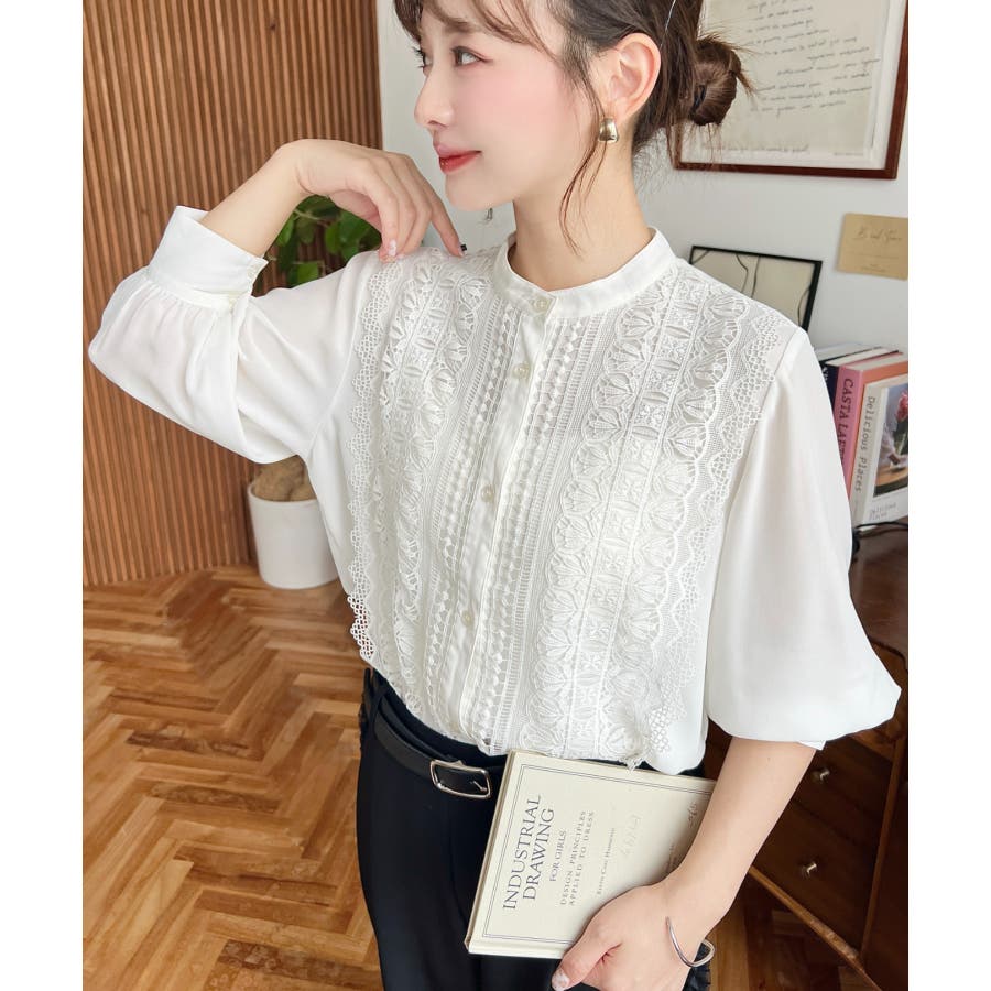 シフォンジョーゼットスタンドカラーフロントレースシャツ