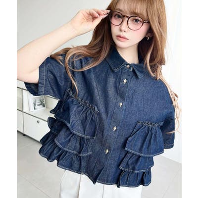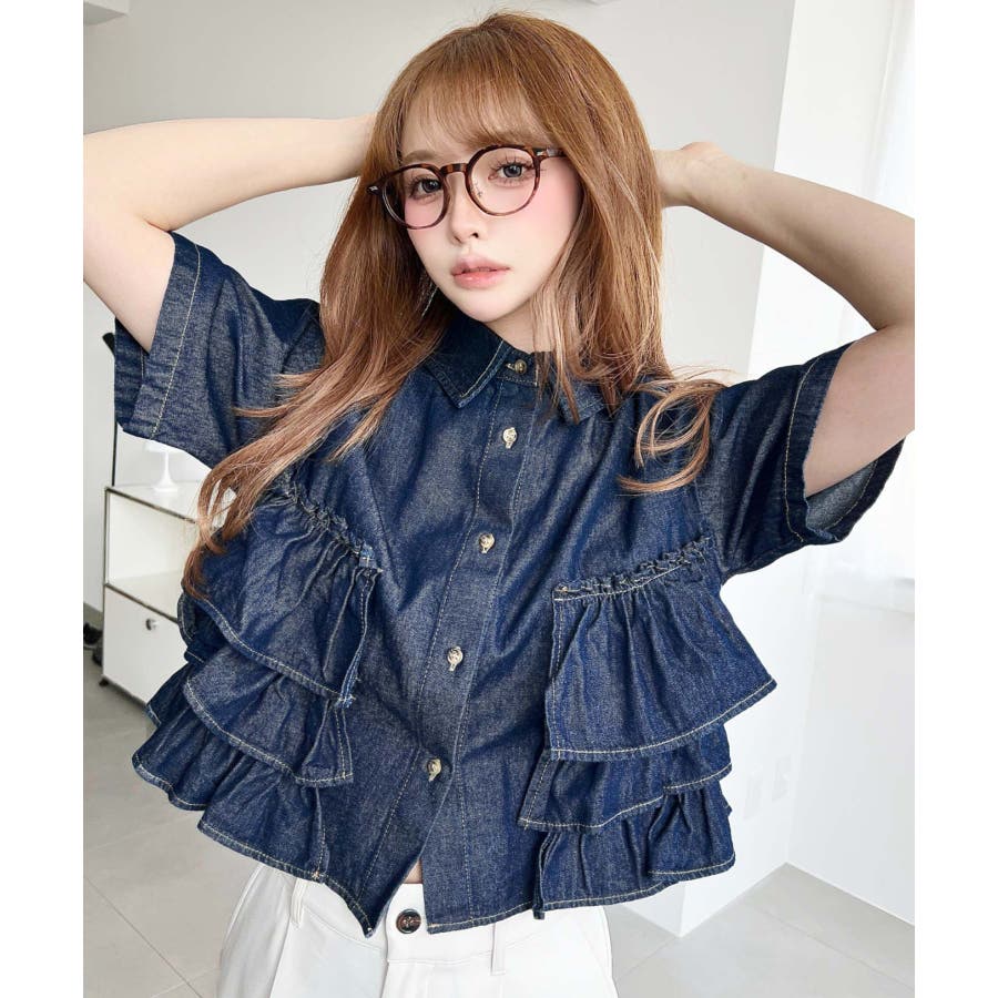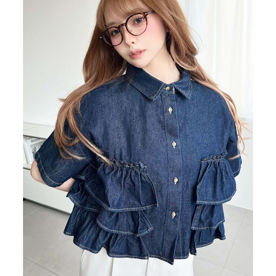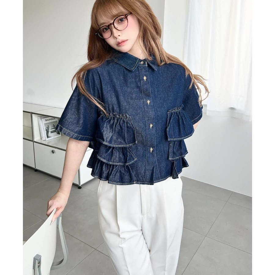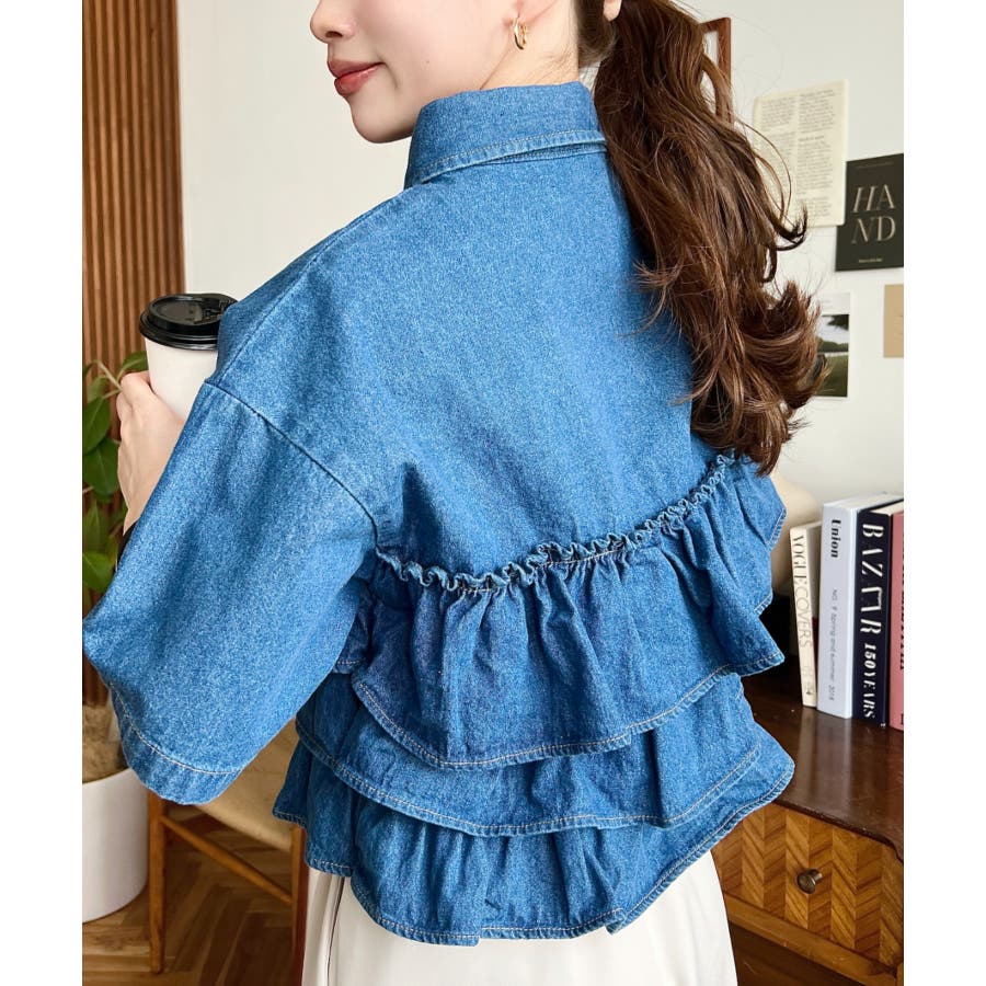 全体にティアードフリルが施されているので、カジュアルなイメージのあるデニムシャツもガーリーに着ることができます。