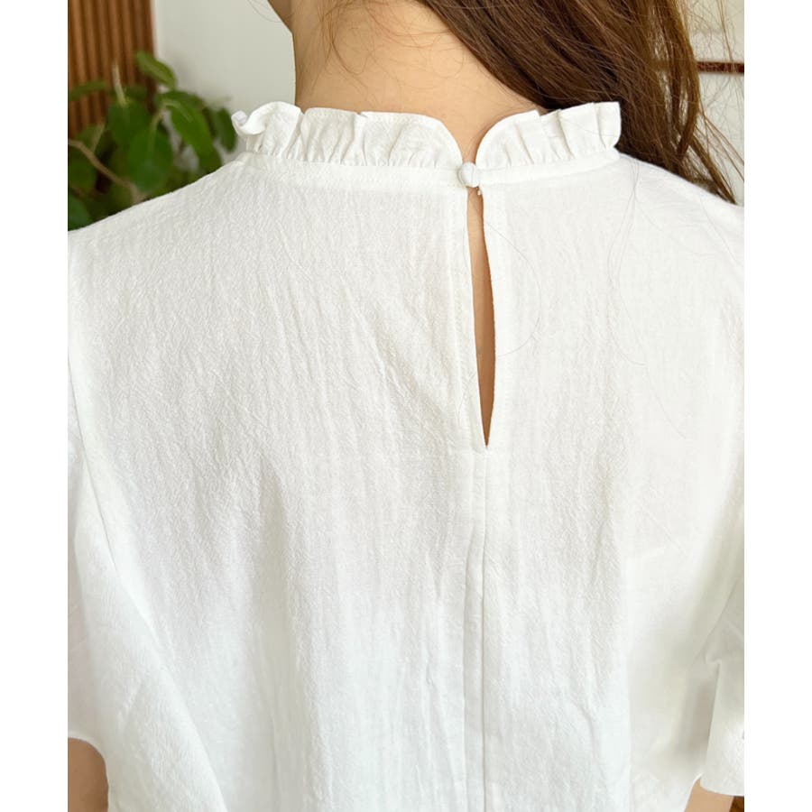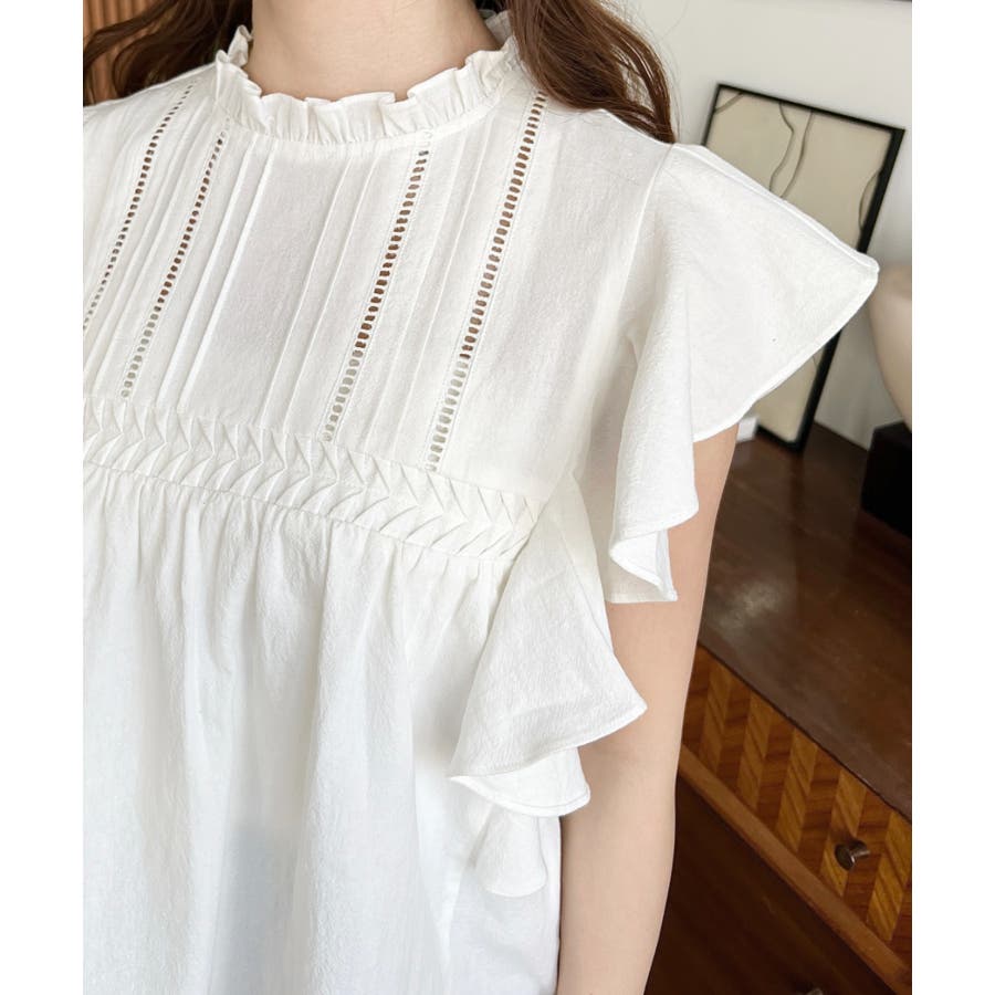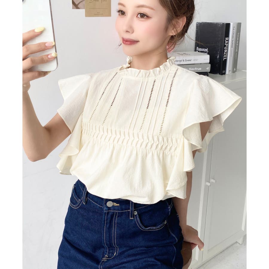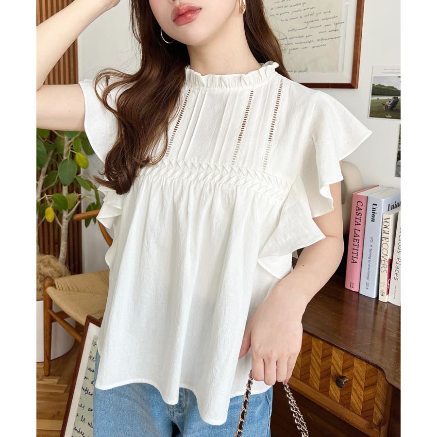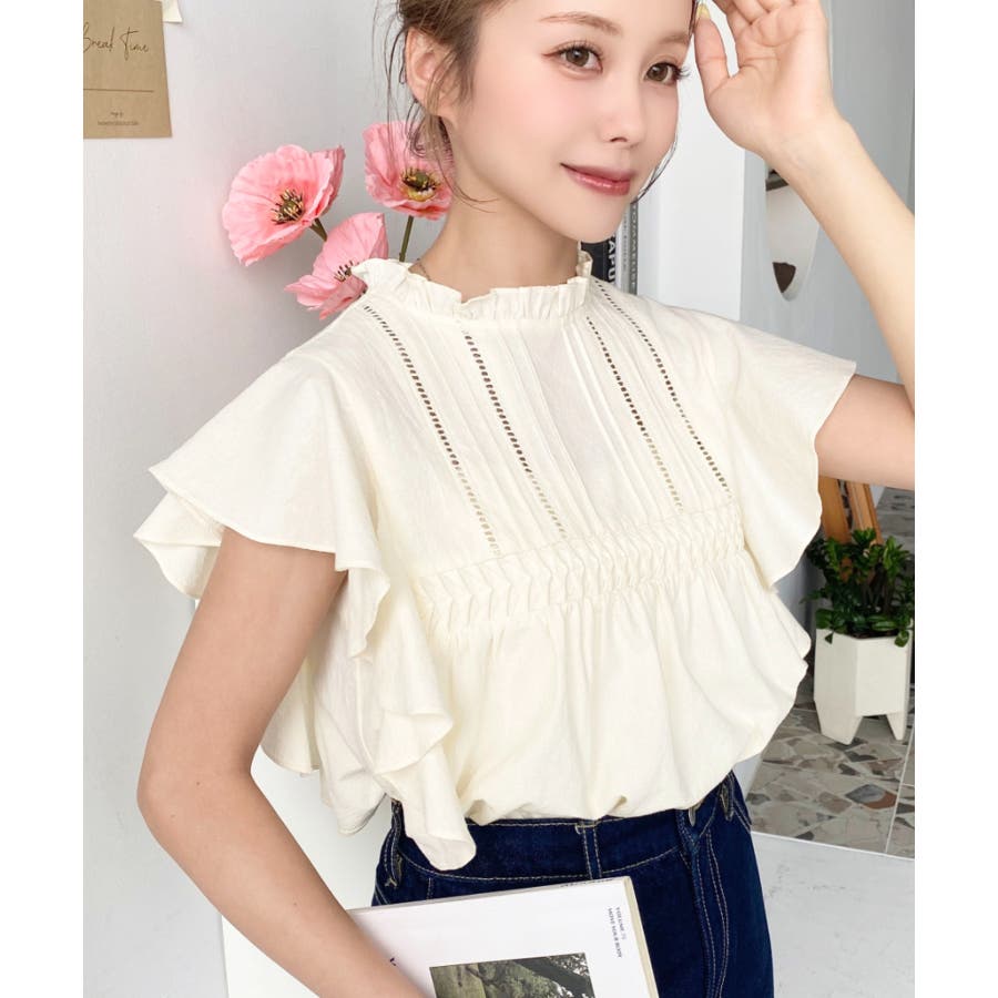 コットンワッシャーフリルスリーブ半袖ピンタックブラウス