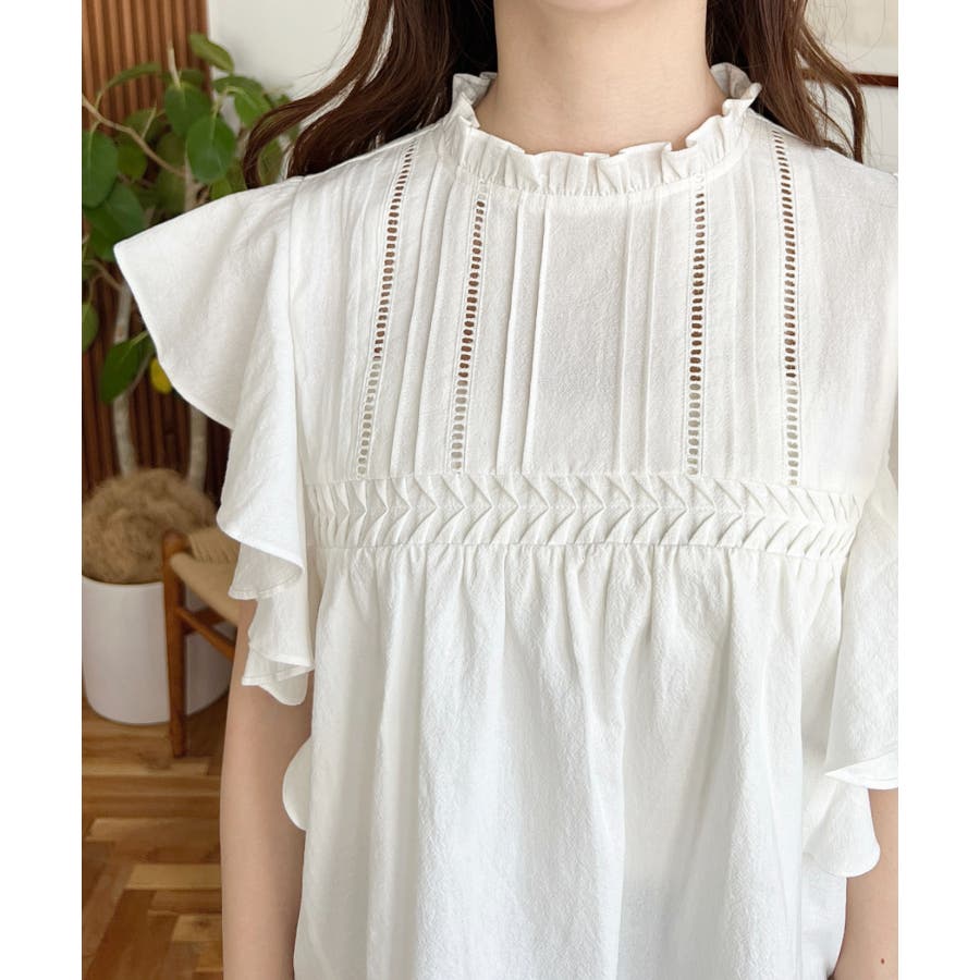 ・首元のさりげないフリルと、胸元にははしごレース&ピンタックをデザインし上品さをプラスした女性らしい印象に◎
