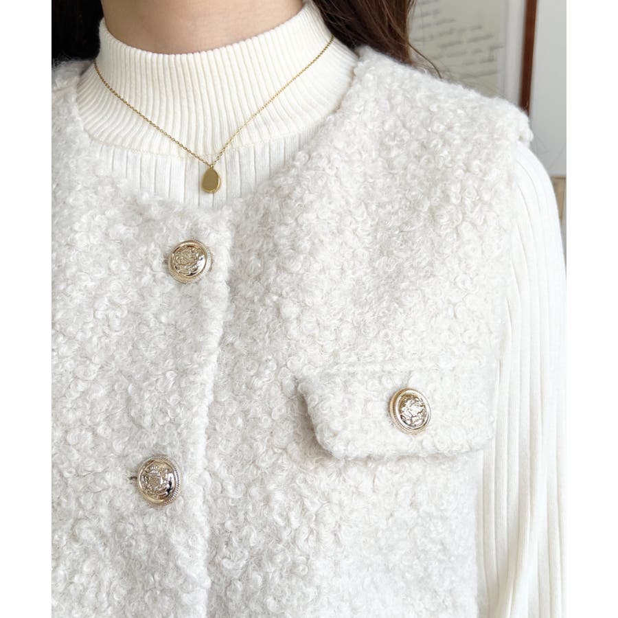 ・もこもこ素材のフェイクリングウールが可愛く、金ボタンデザインがアクセントになり、クラシカルで上品な印象をプラスしてくれるノーカラーベストです♪