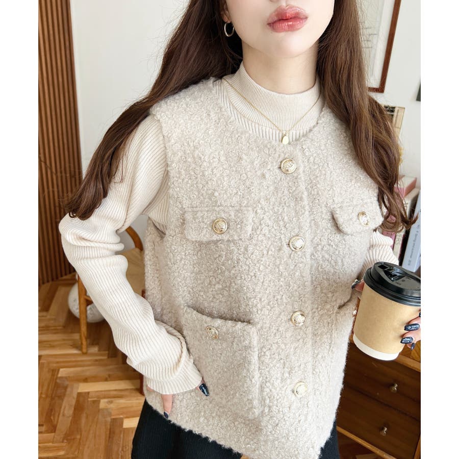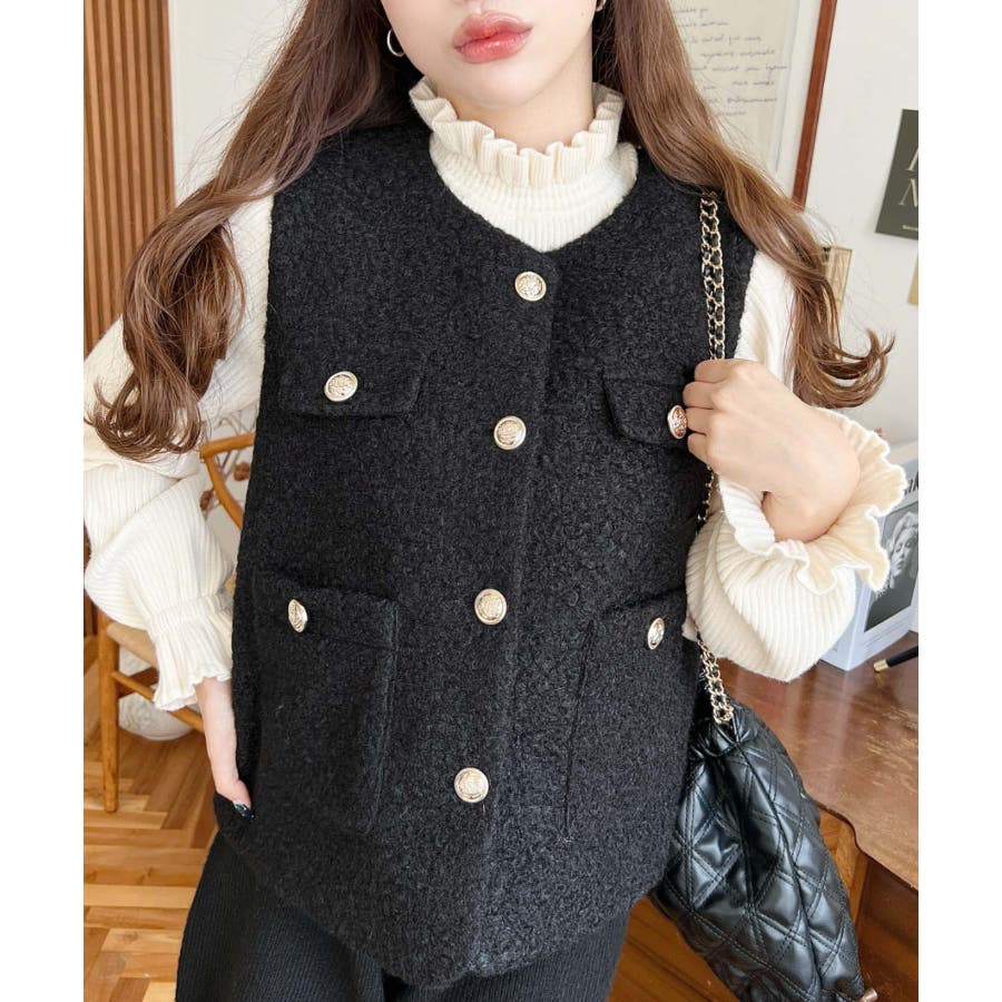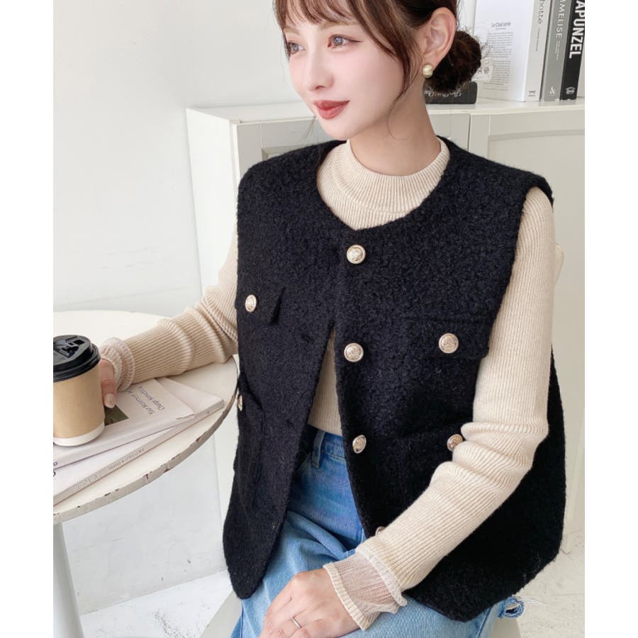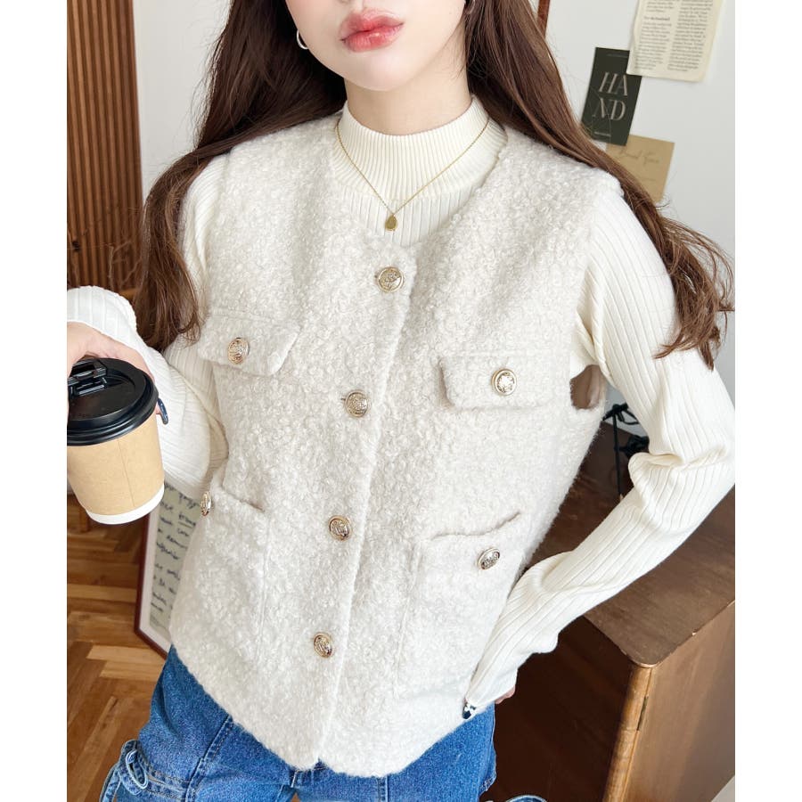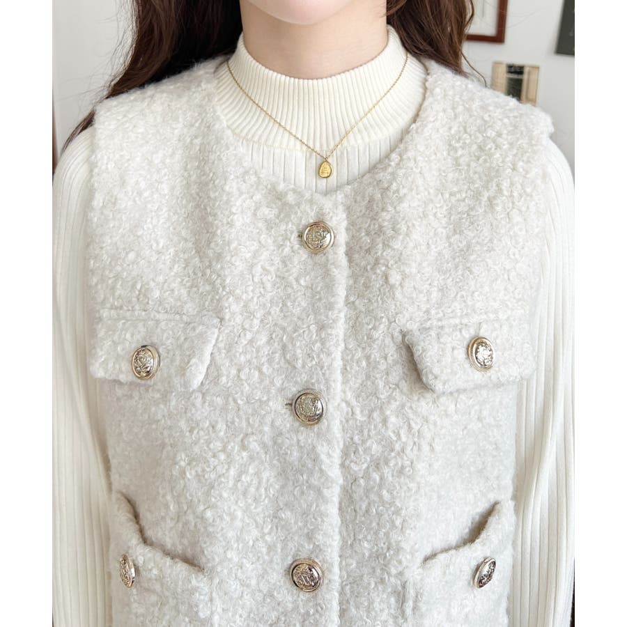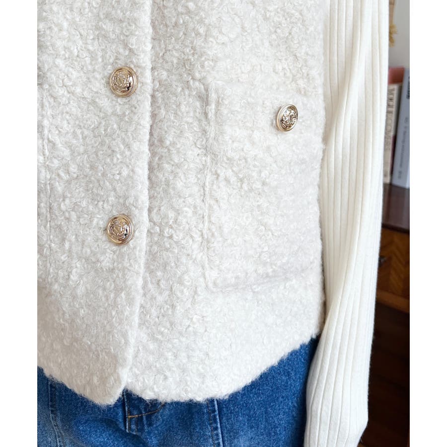 【もこもこ×金ボタンで、秋冬のシンプルコーデを格上げするフェイクリングウールノーカラーベスト♪】