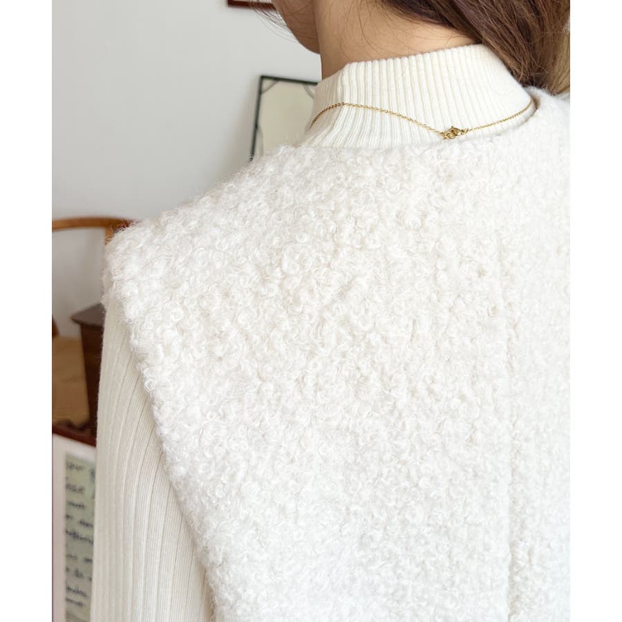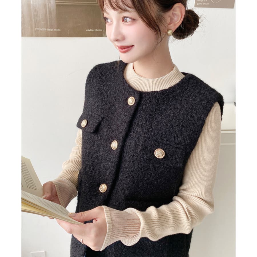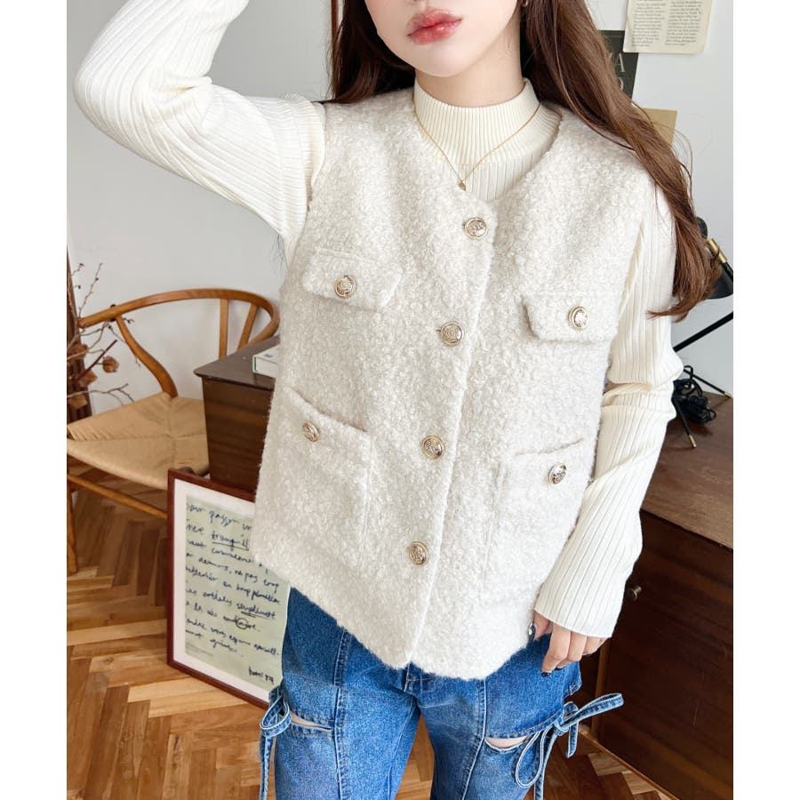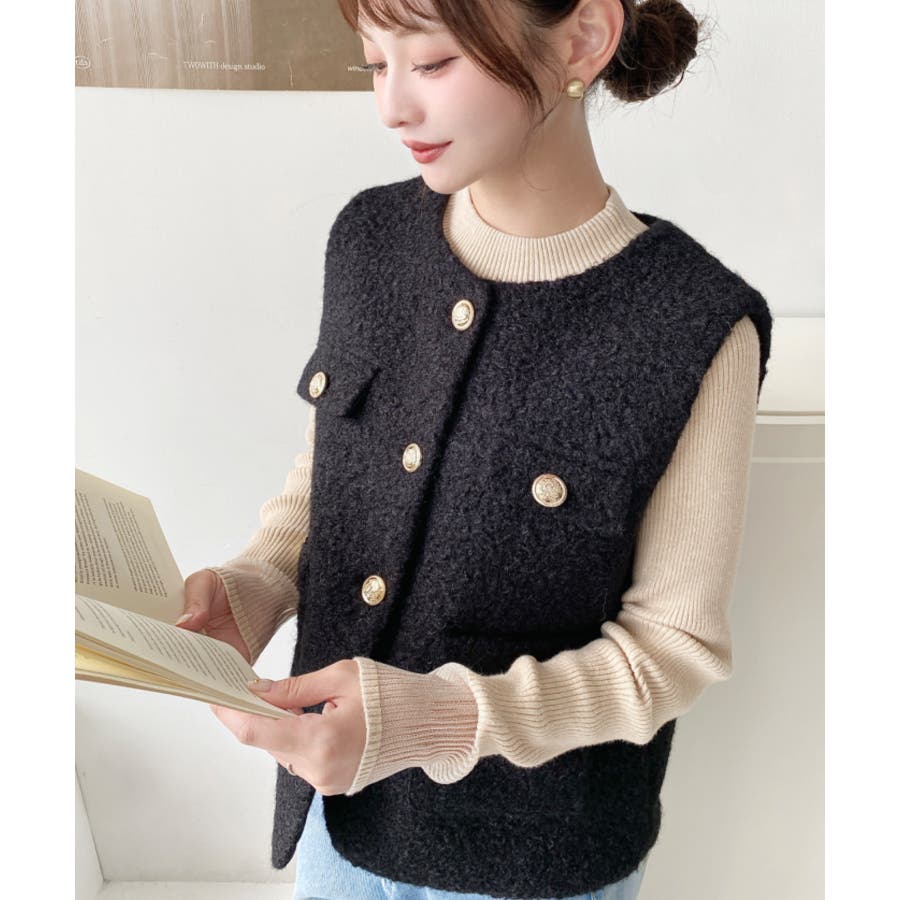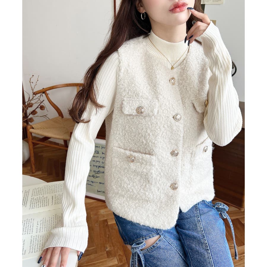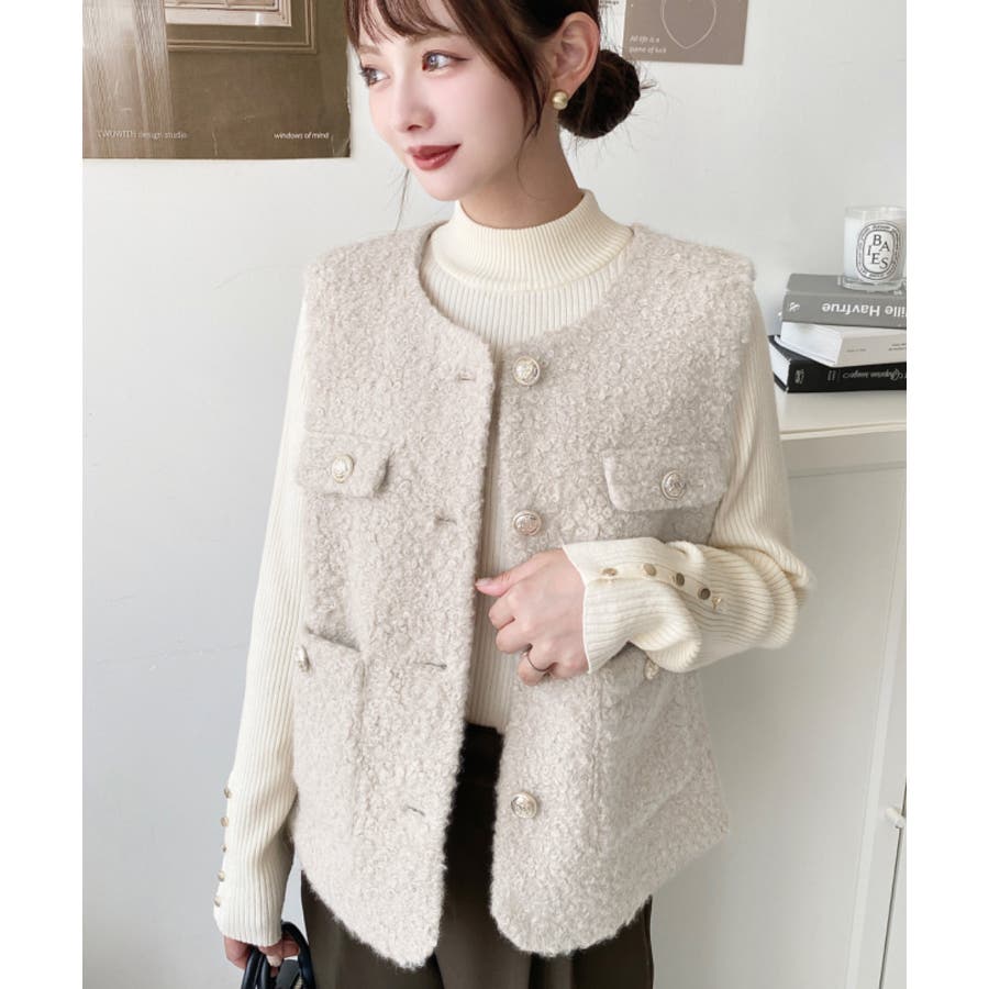 【もこもこ×金ボタンで、秋冬のシンプルコーデを格上げするフェイクリングウールノーカラーベスト♪】