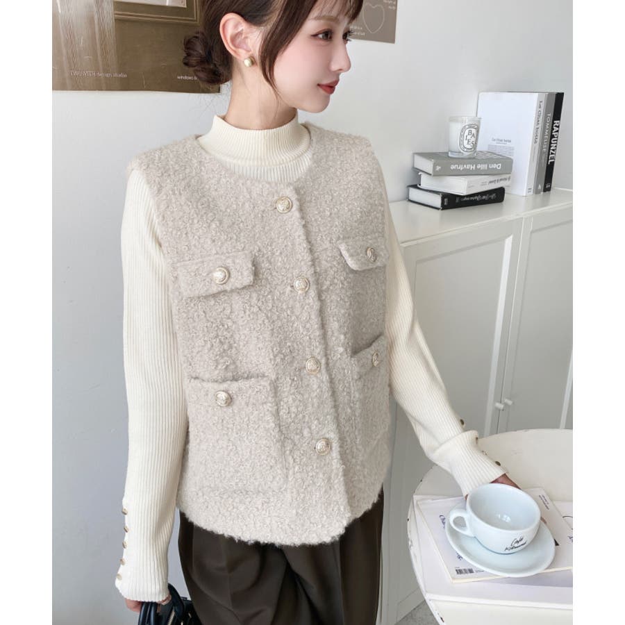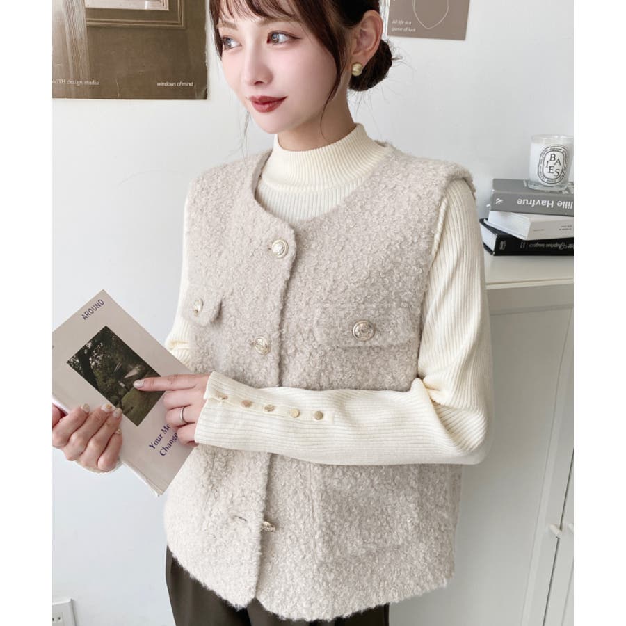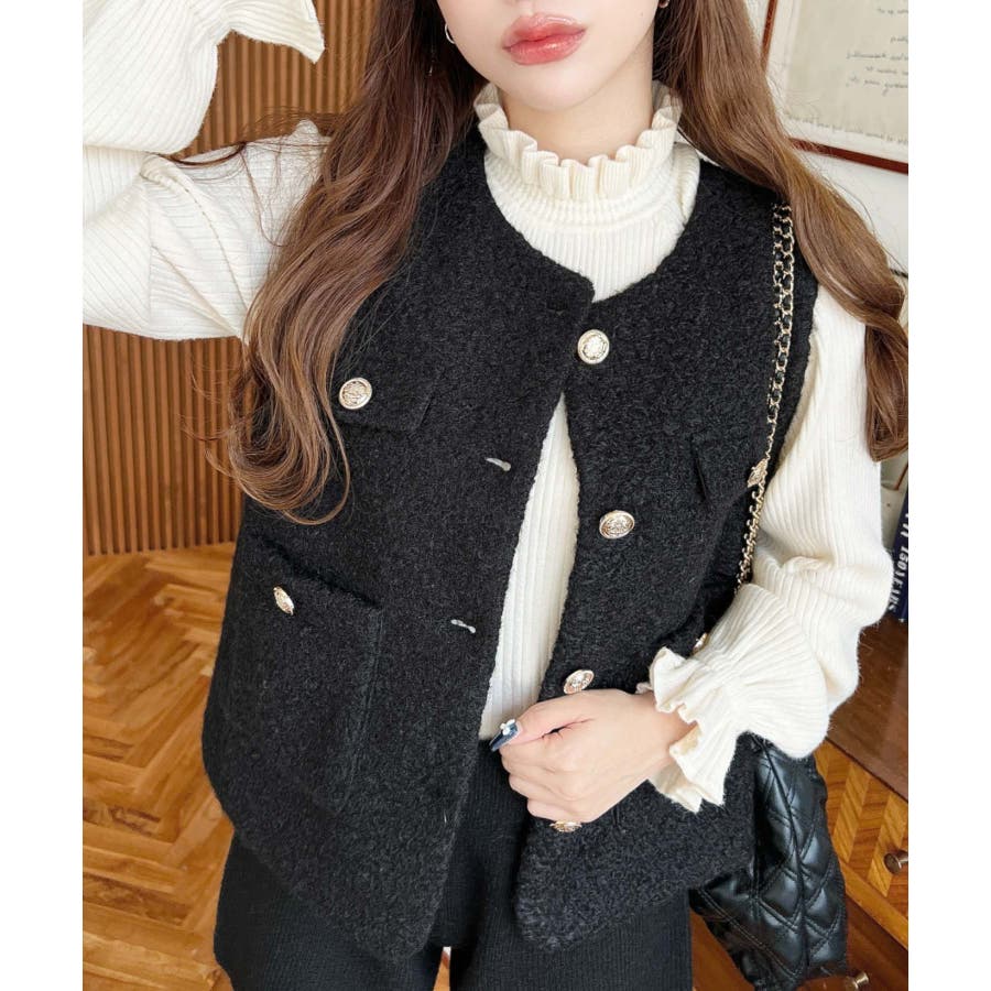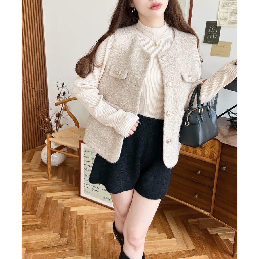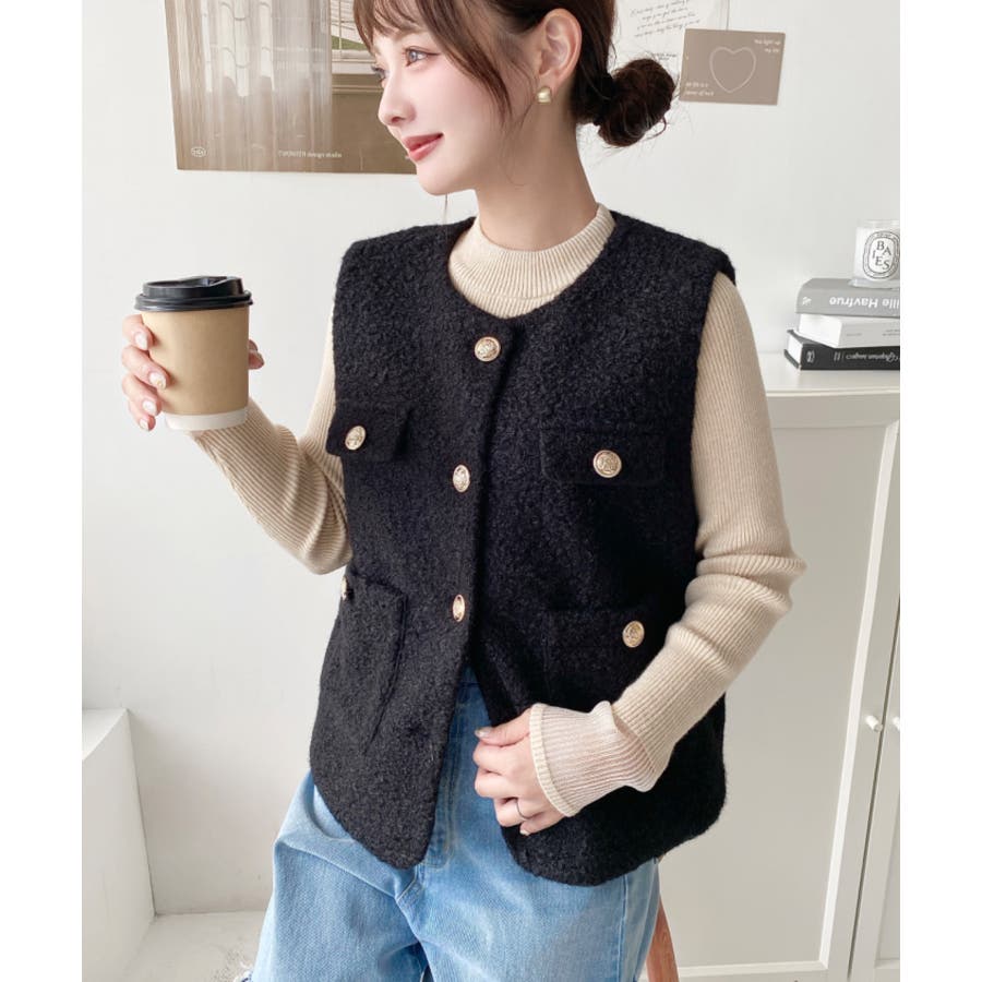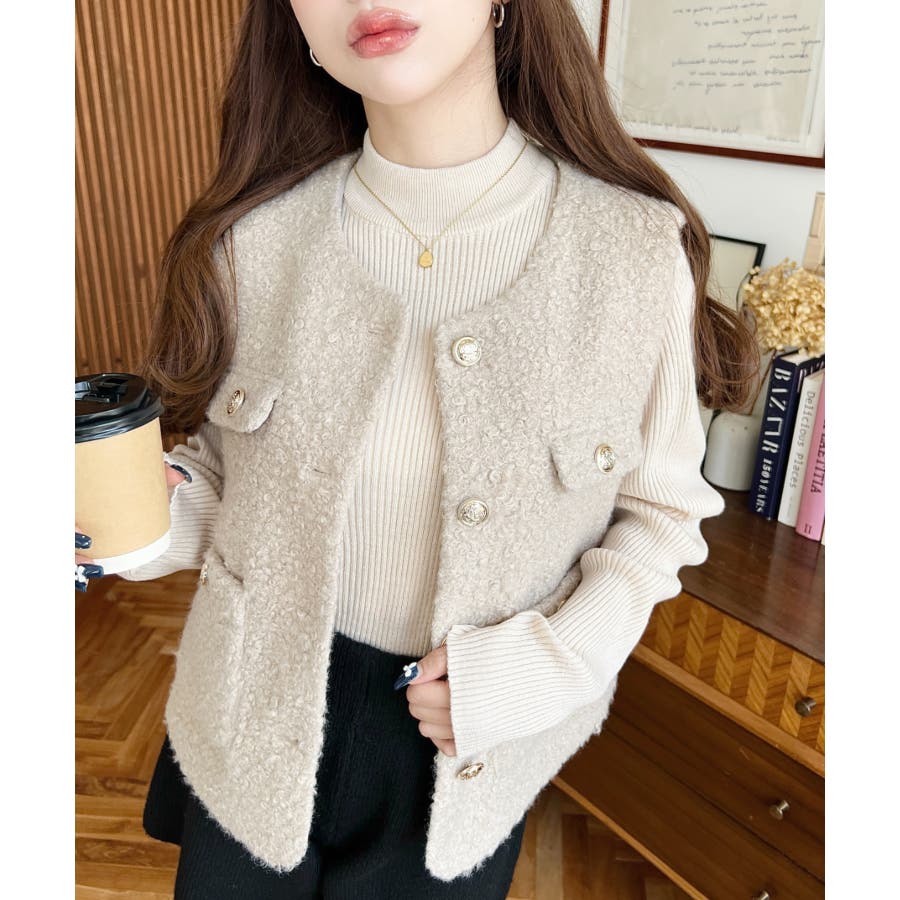 【もこもこ×金ボタンで、秋冬のシンプルコーデを格上げするフェイクリングウールノーカラーベスト♪】