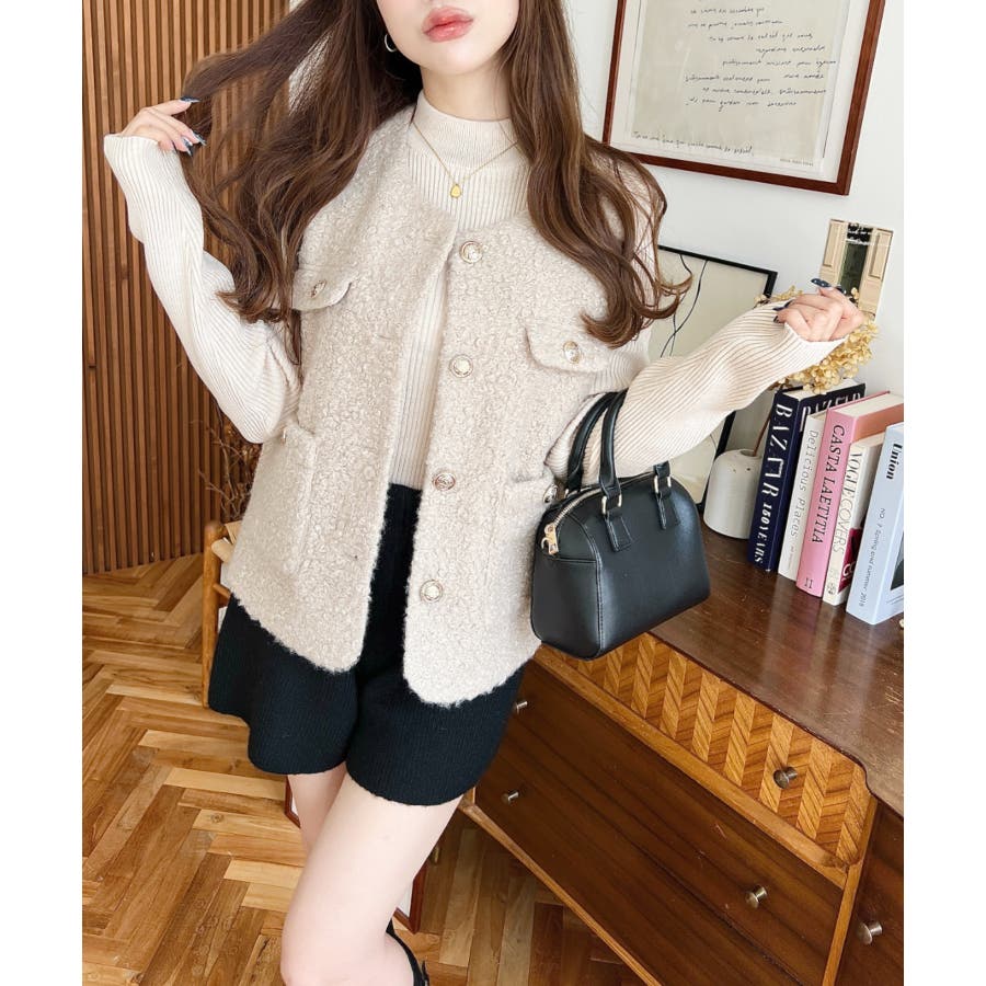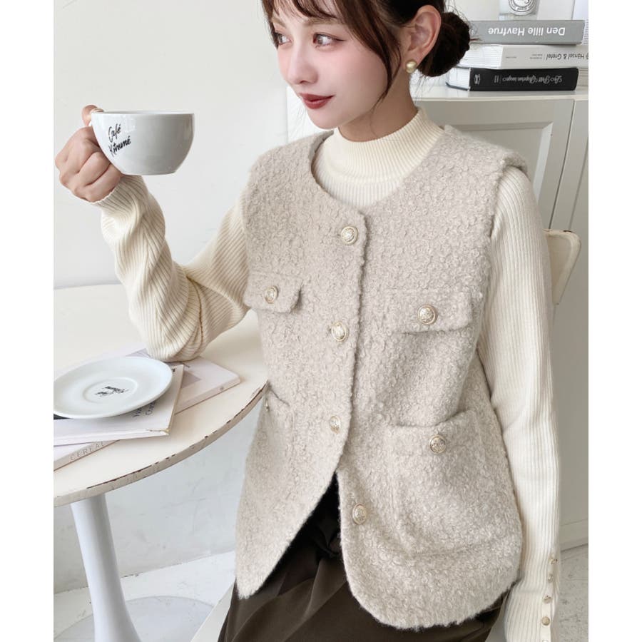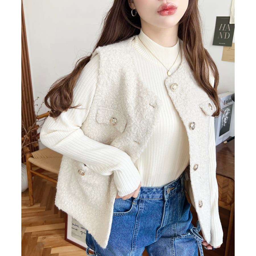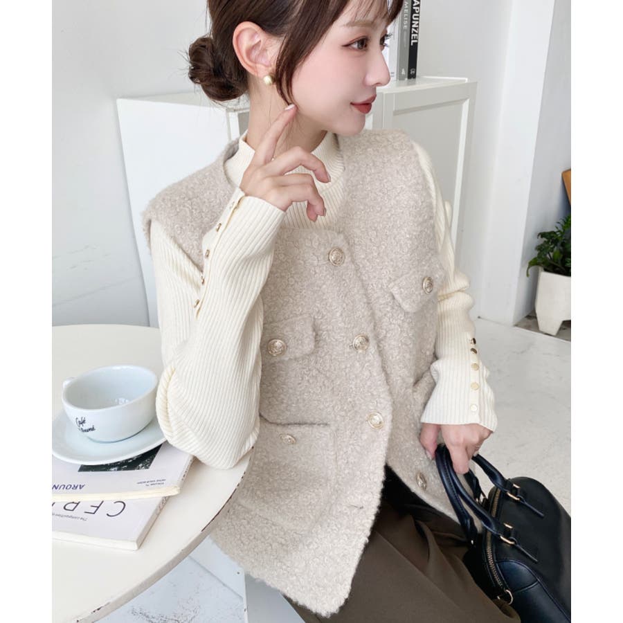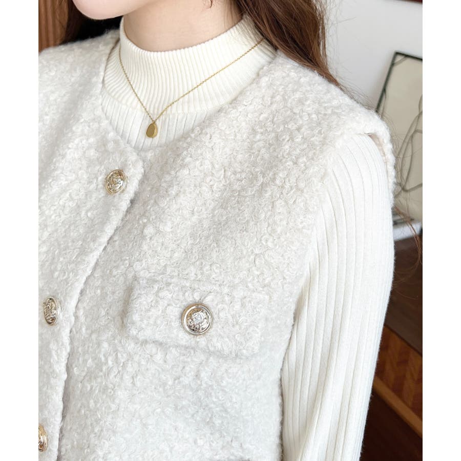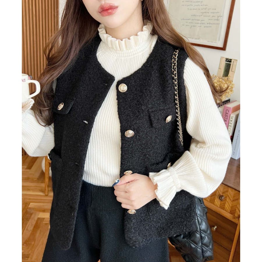 【もこもこ×金ボタンで、秋冬のシンプルコーデを格上げするフェイクリングウールノーカラーベスト♪】