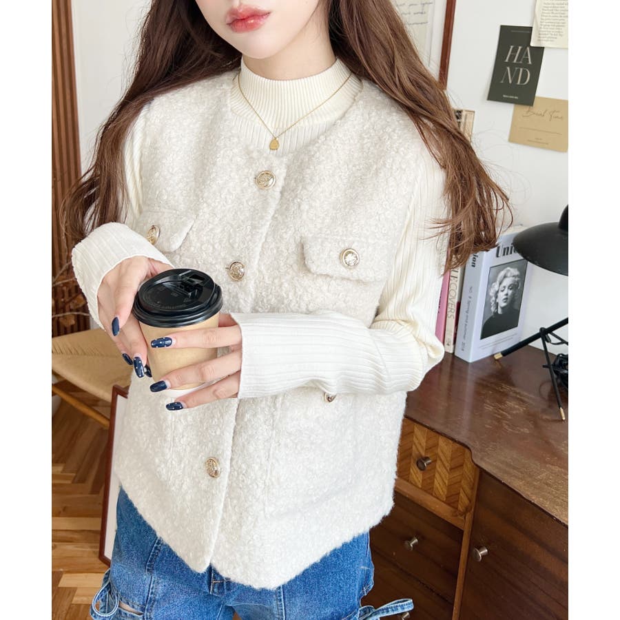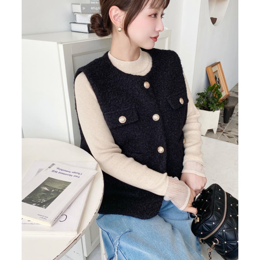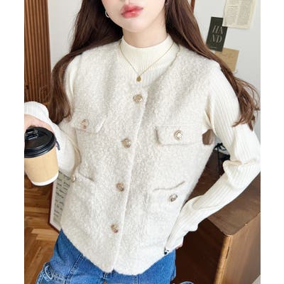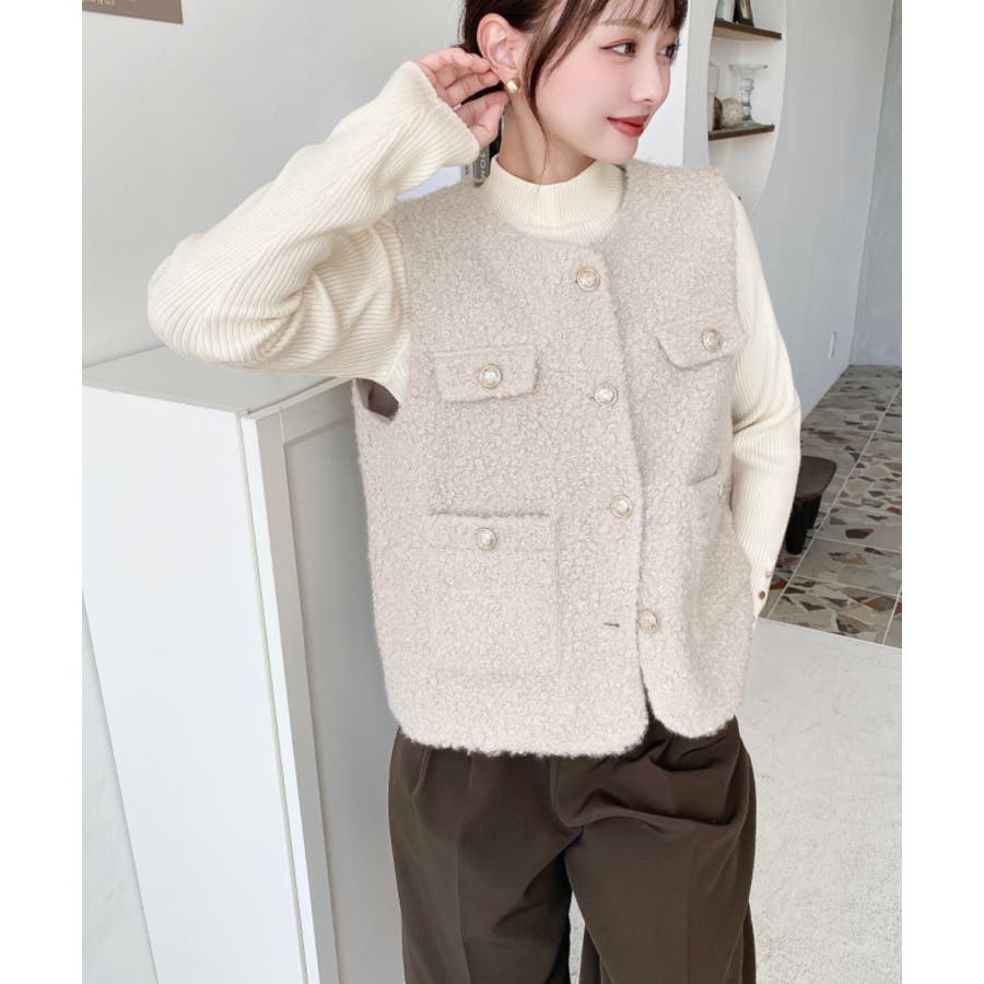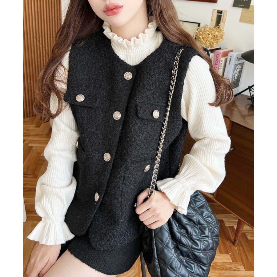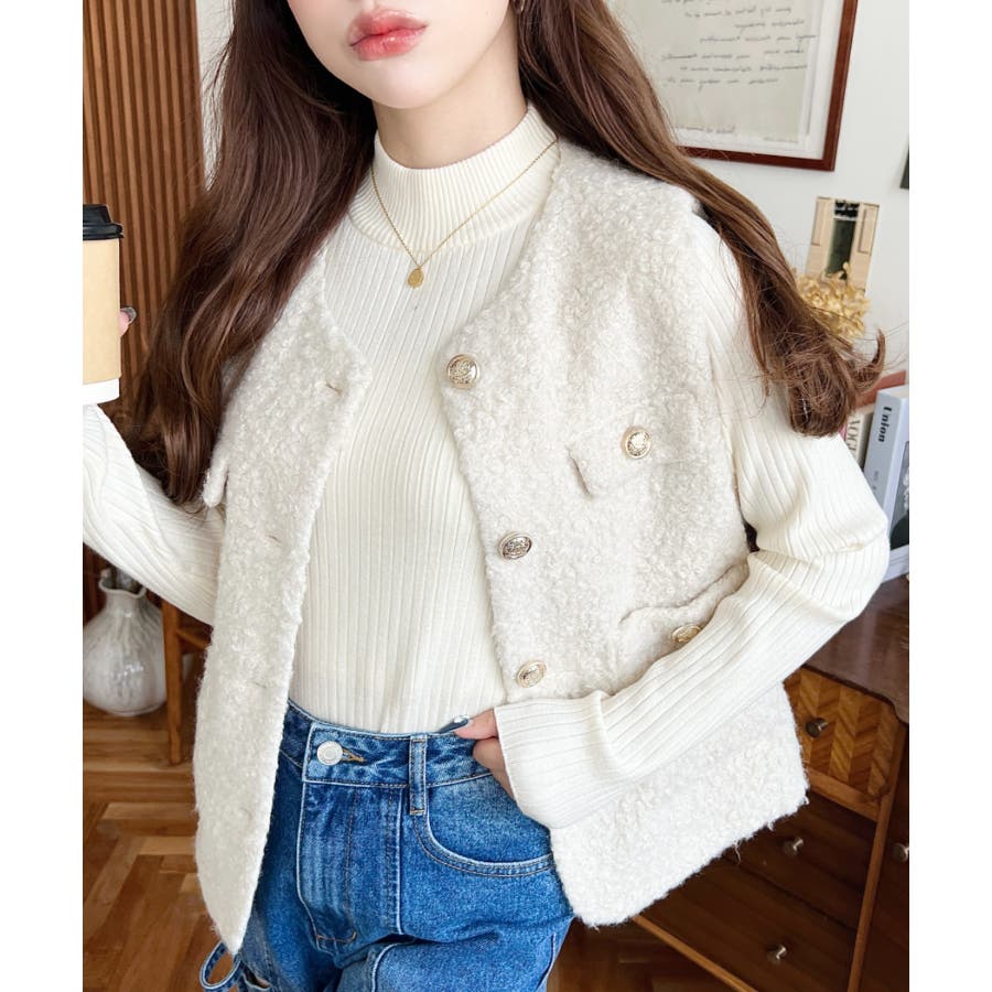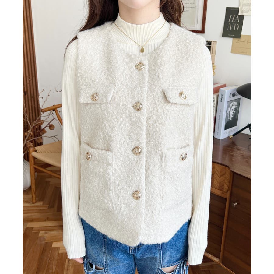 【もこもこ×金ボタンで、秋冬のシンプルコーデを格上げするフェイクリングウールノーカラーベスト♪】