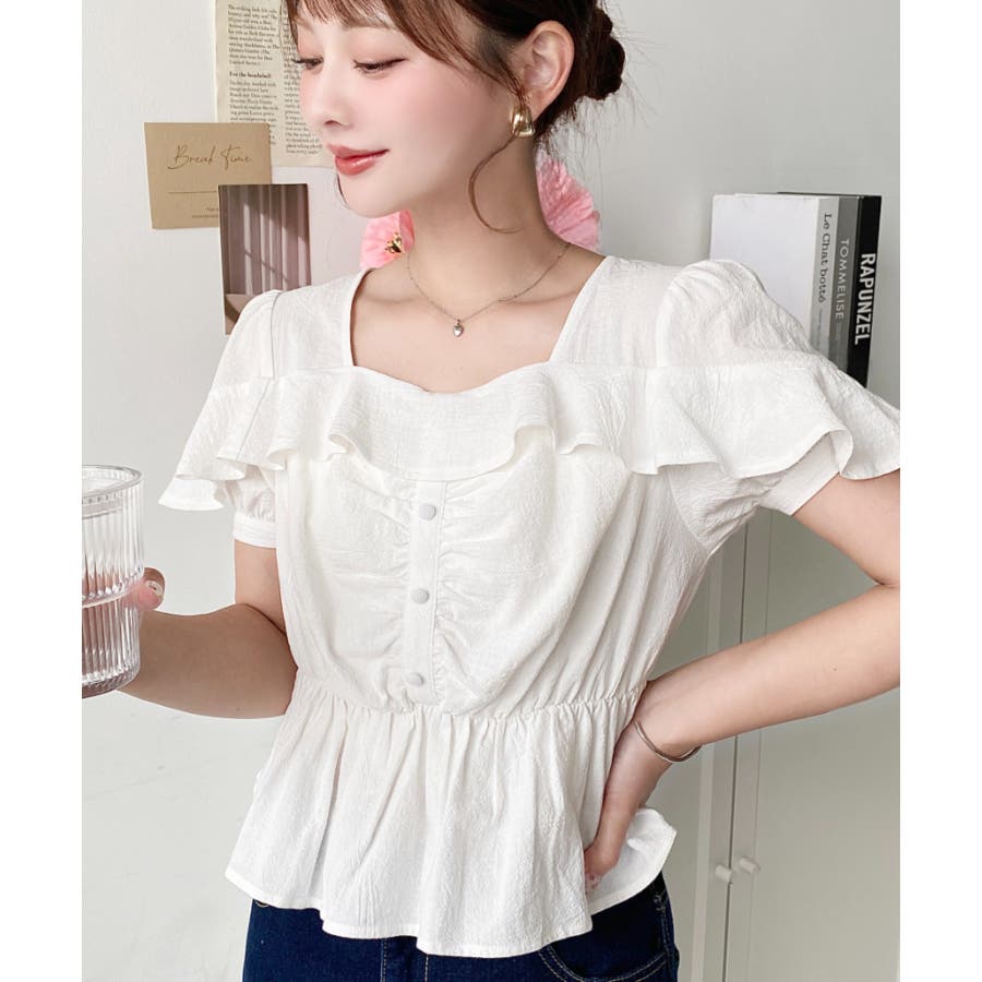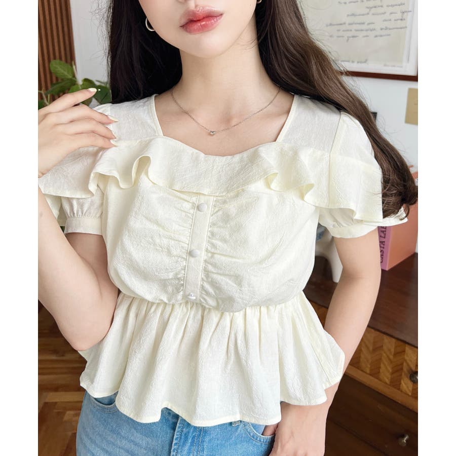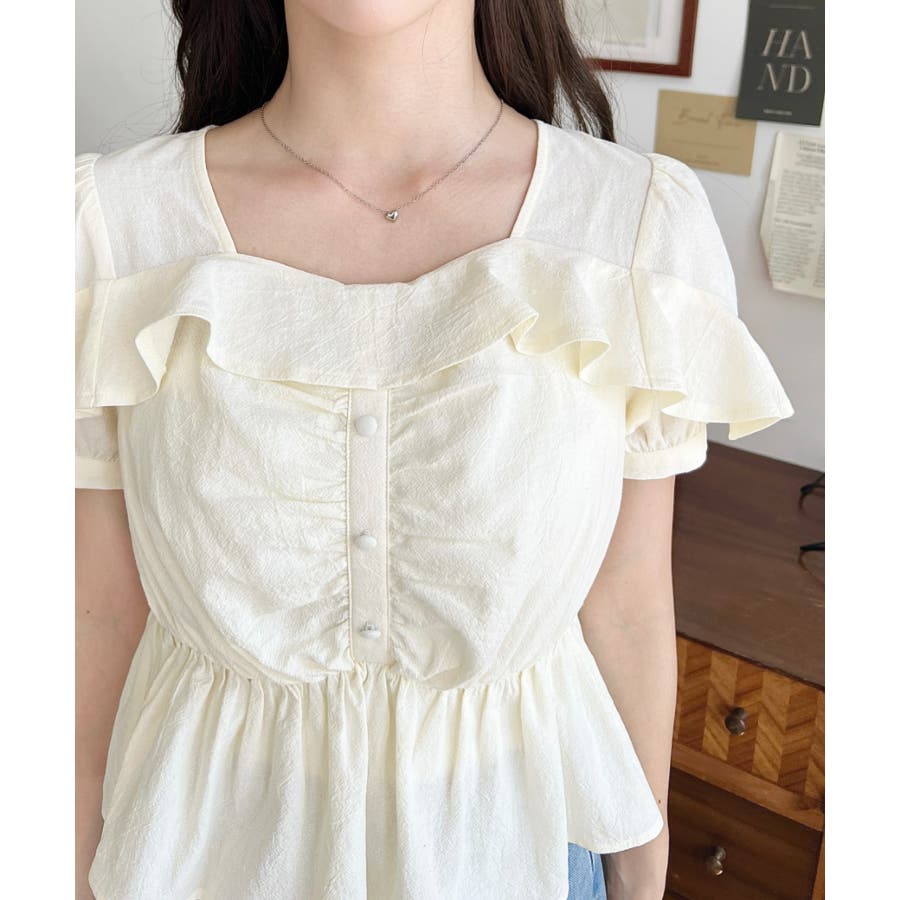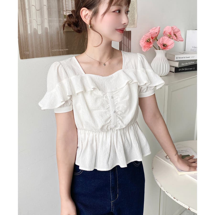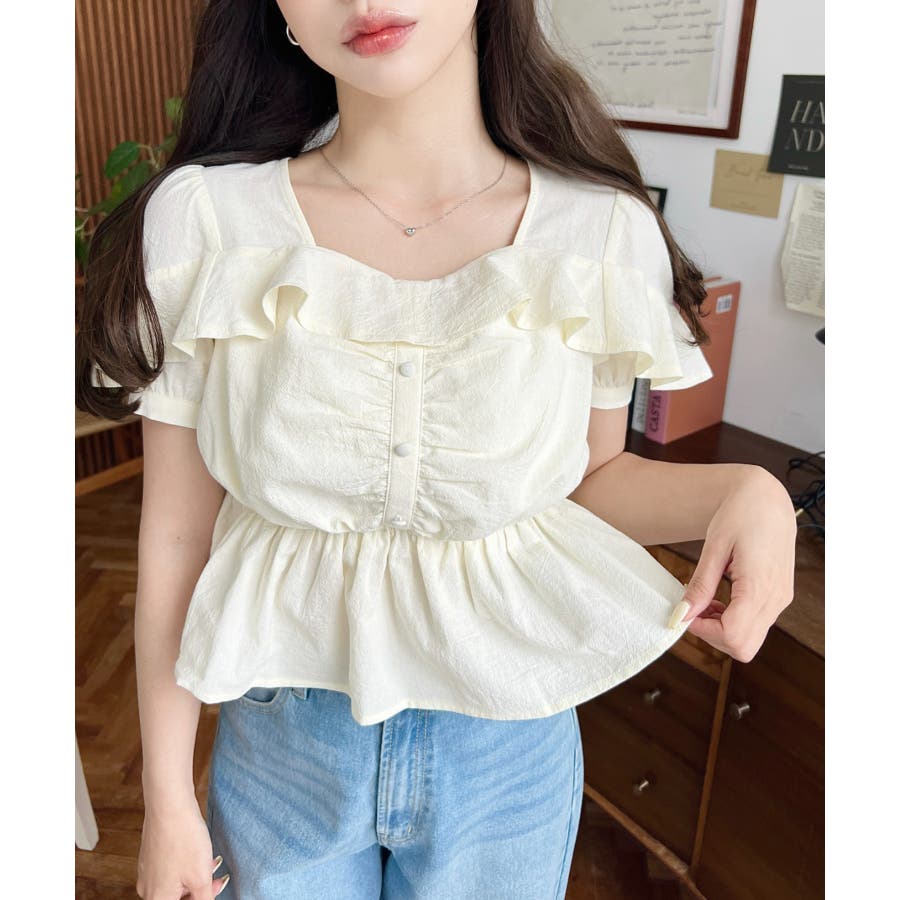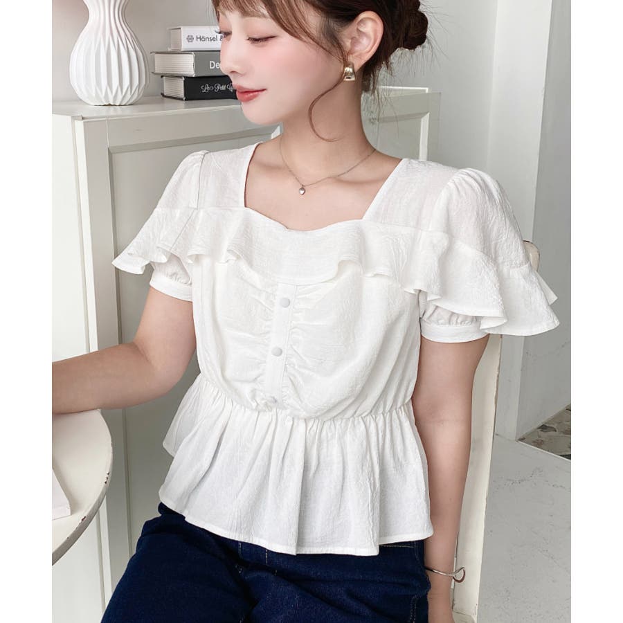 スクエアフリルペプラム半袖ブラウス