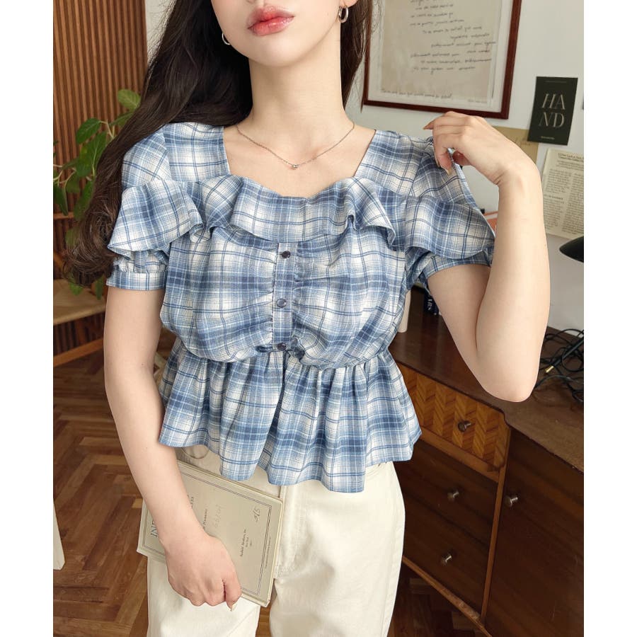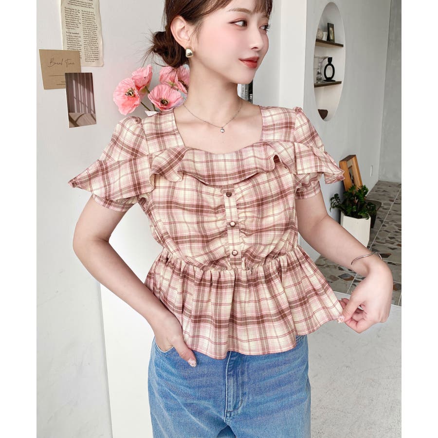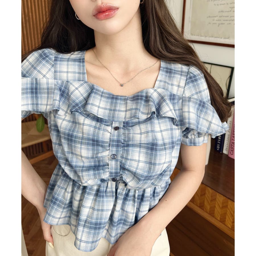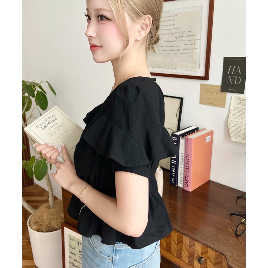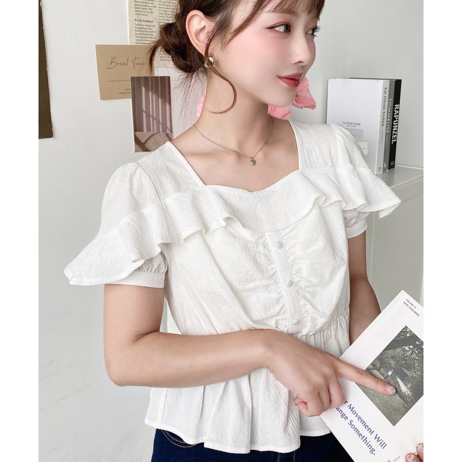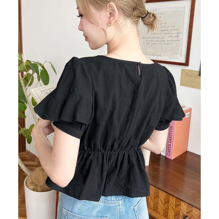 スクエアフリルペプラム半袖ブラウス