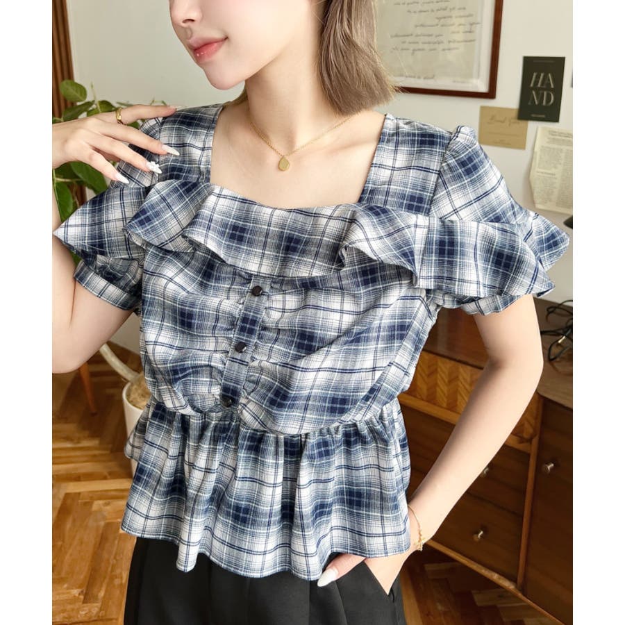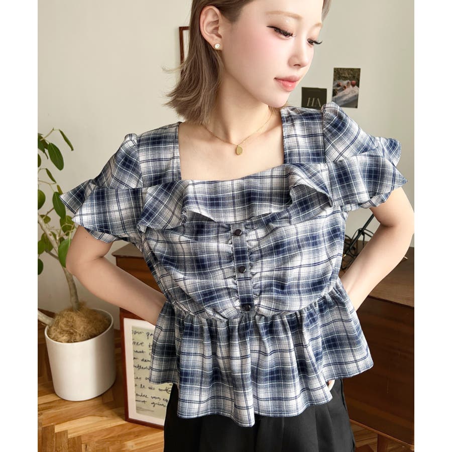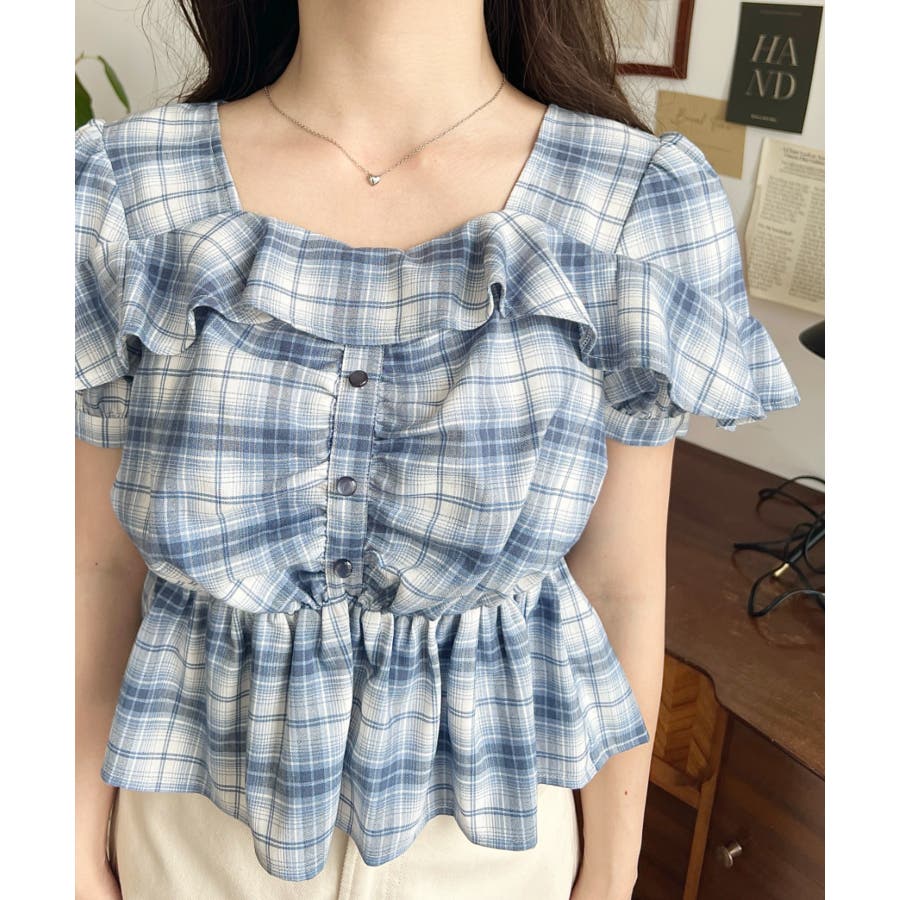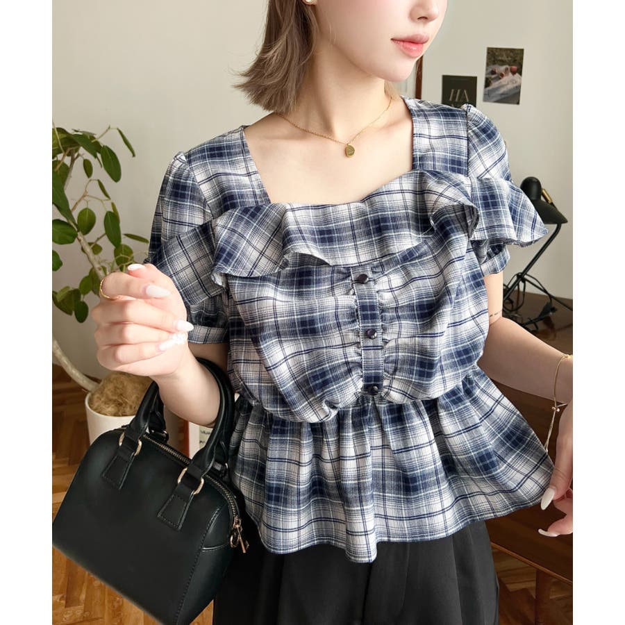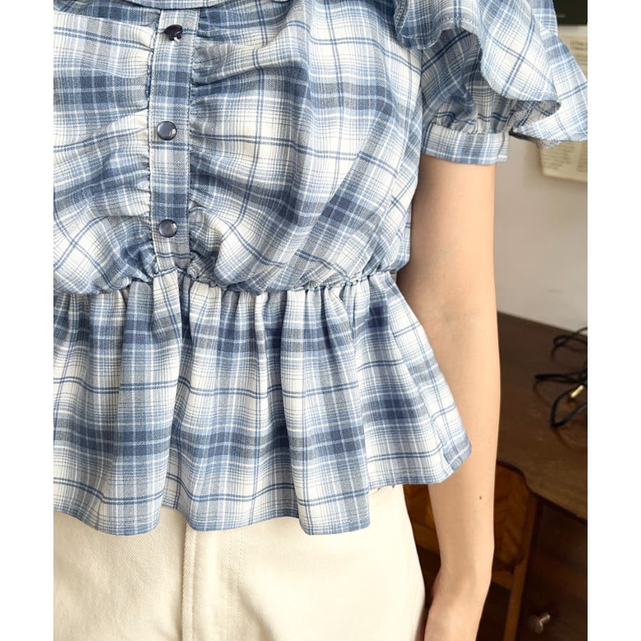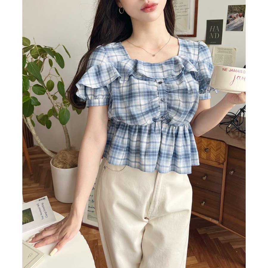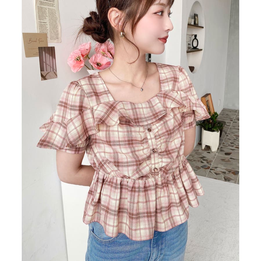スクエアフリルペプラム半袖ブラウス