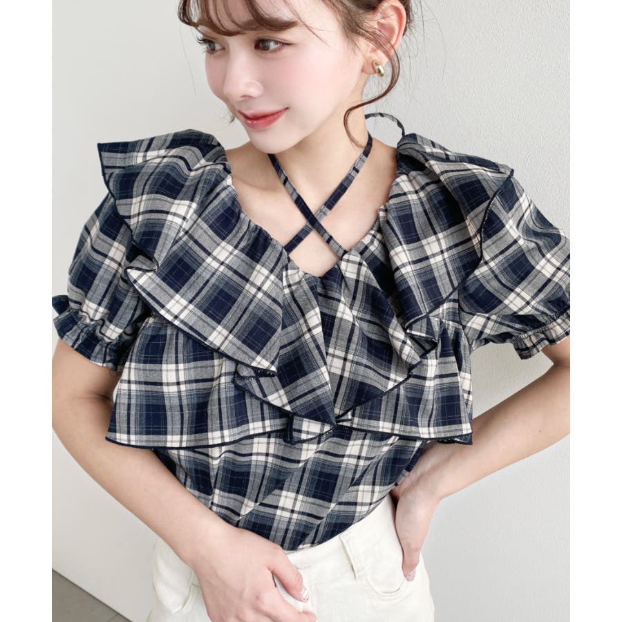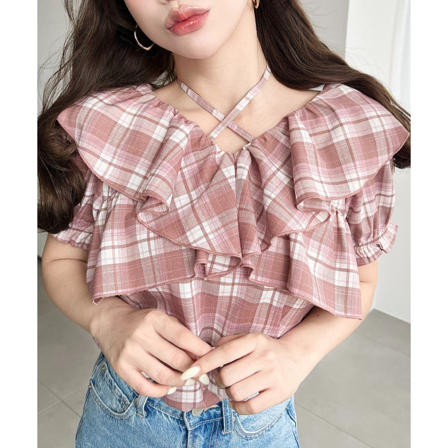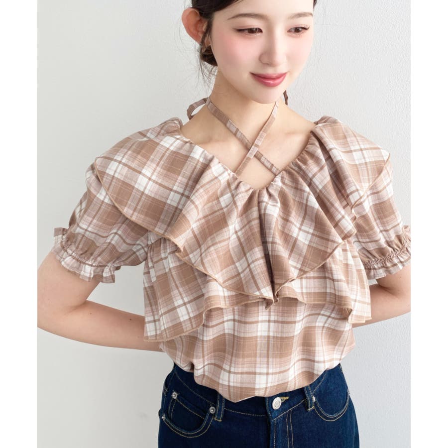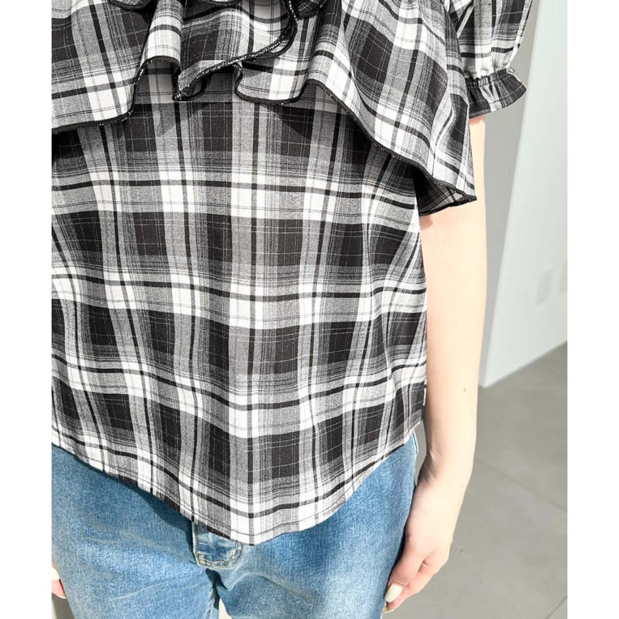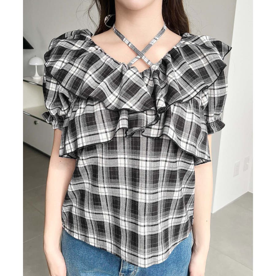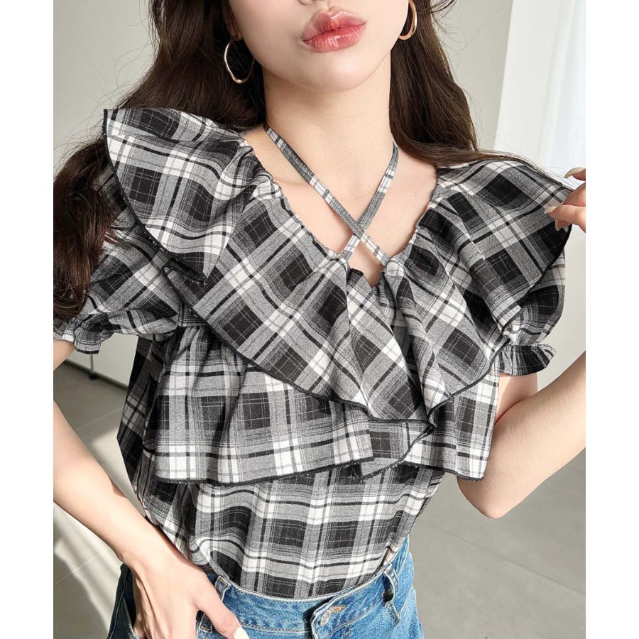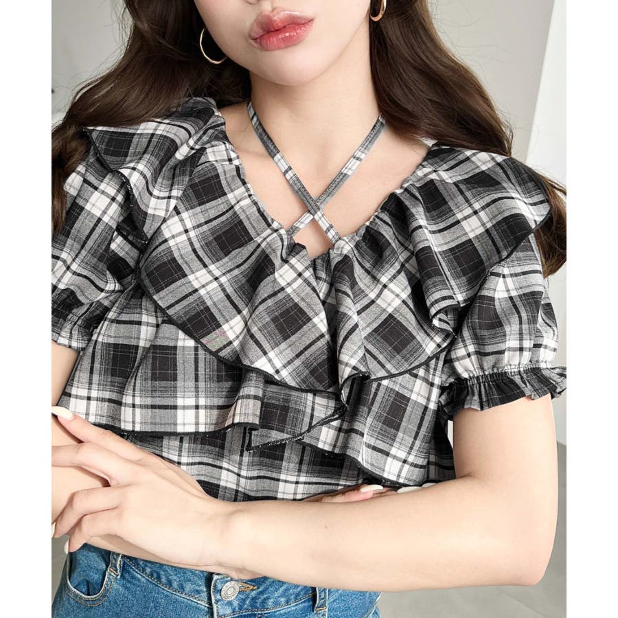 ・首元のクロスリボンと大きななフリルが可愛いらしさを引き立てるチェック柄ブラウス。