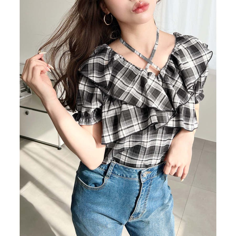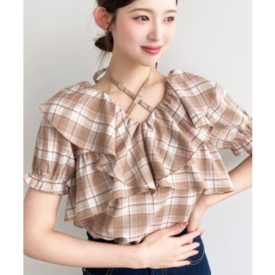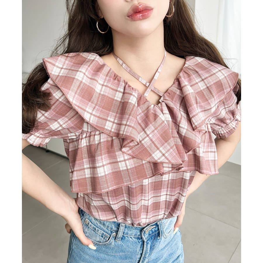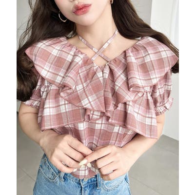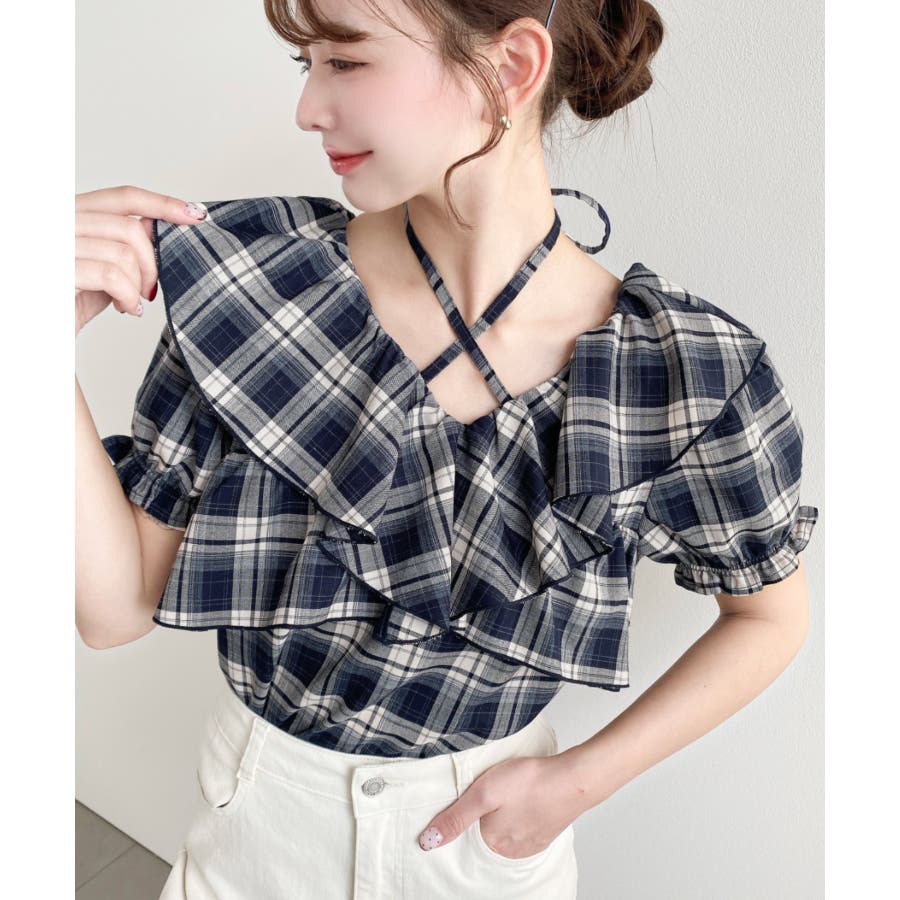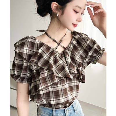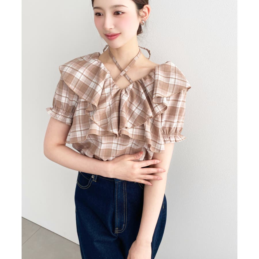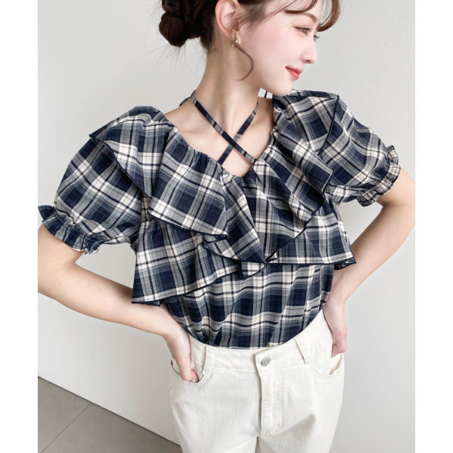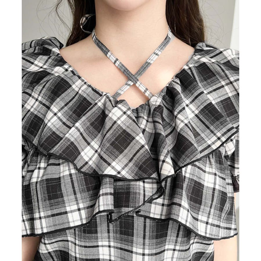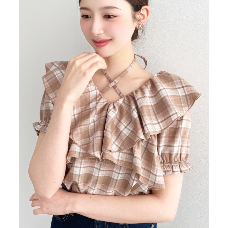 ・首元のクロスリボンと大きななフリルが可愛いらしさを引き立てるチェック柄ブラウス。