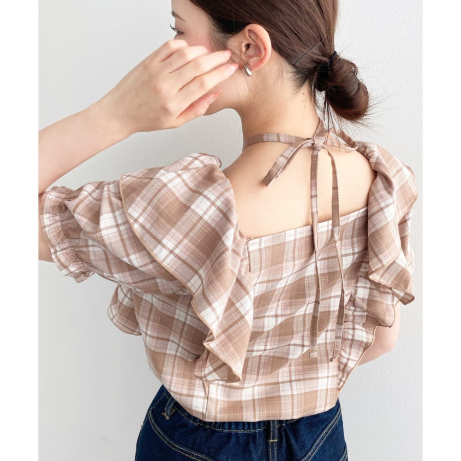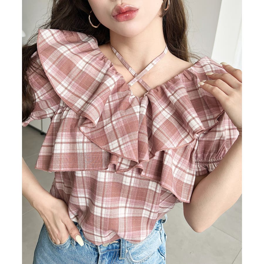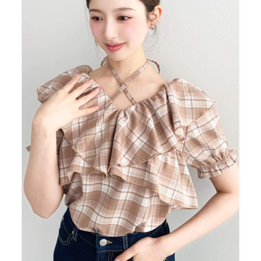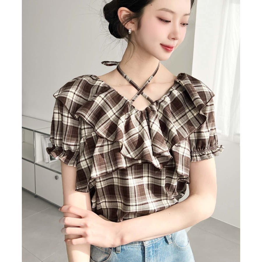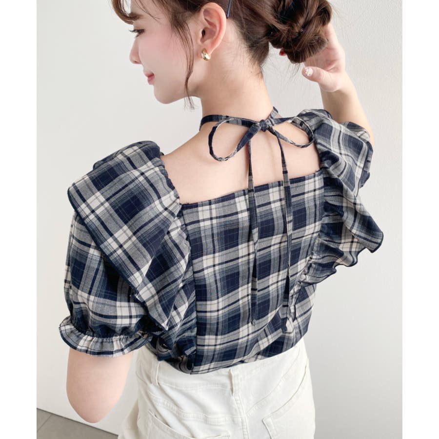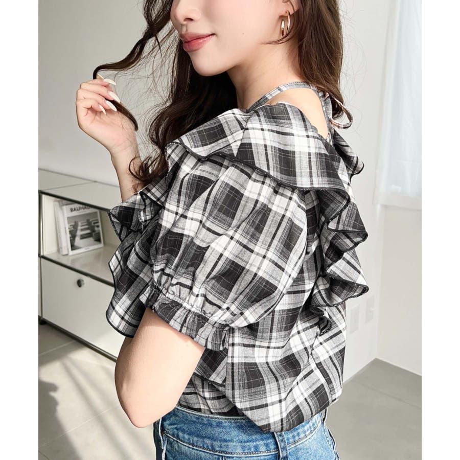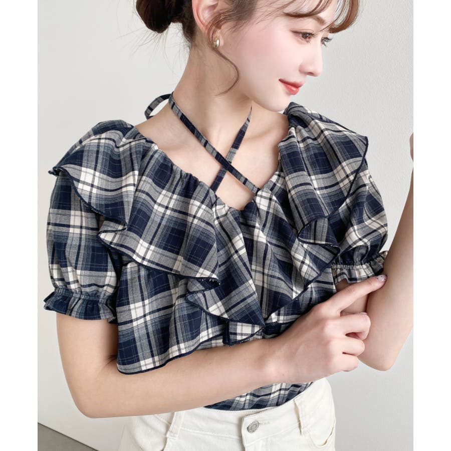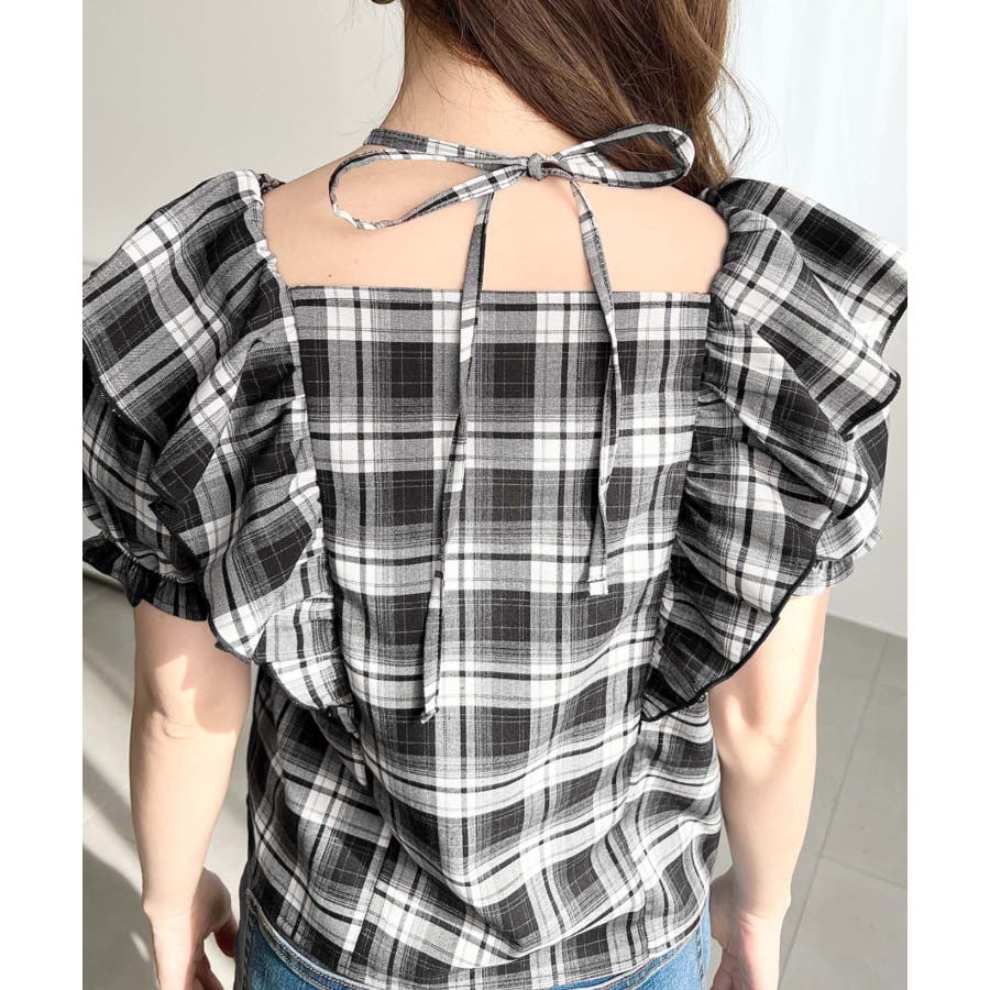 ・首元のクロスリボンと大きななフリルが可愛いらしさを引き立てるチェック柄ブラウス。