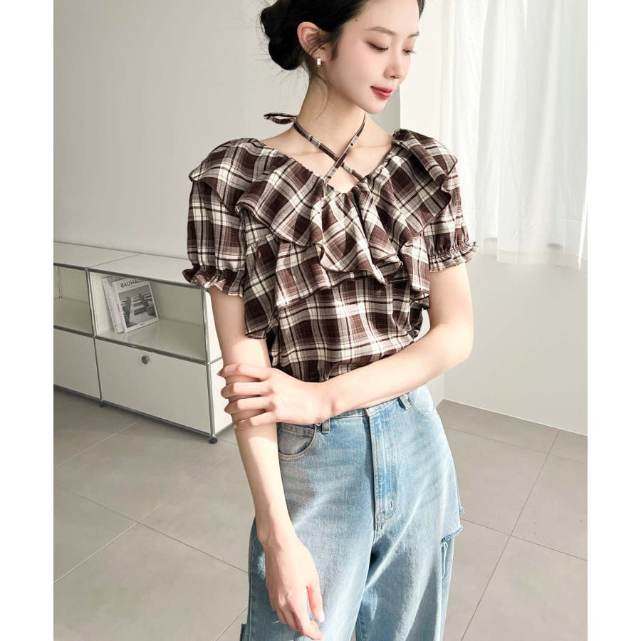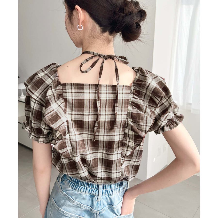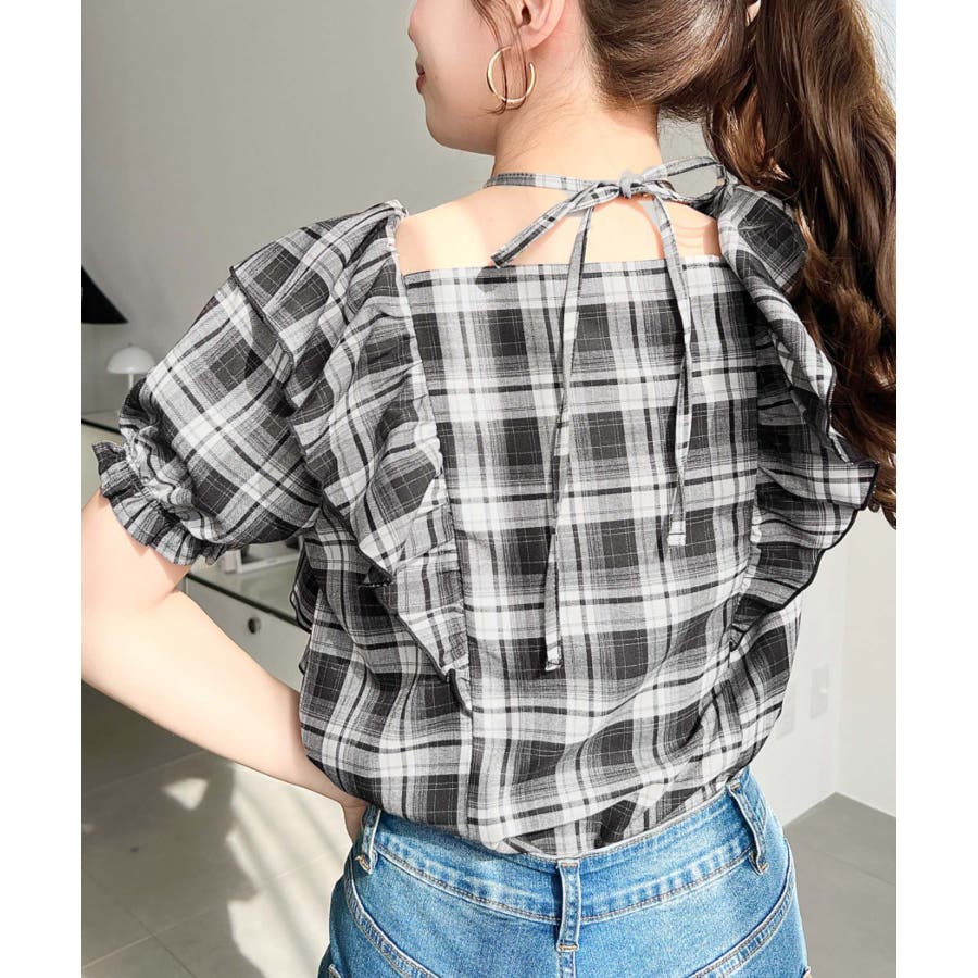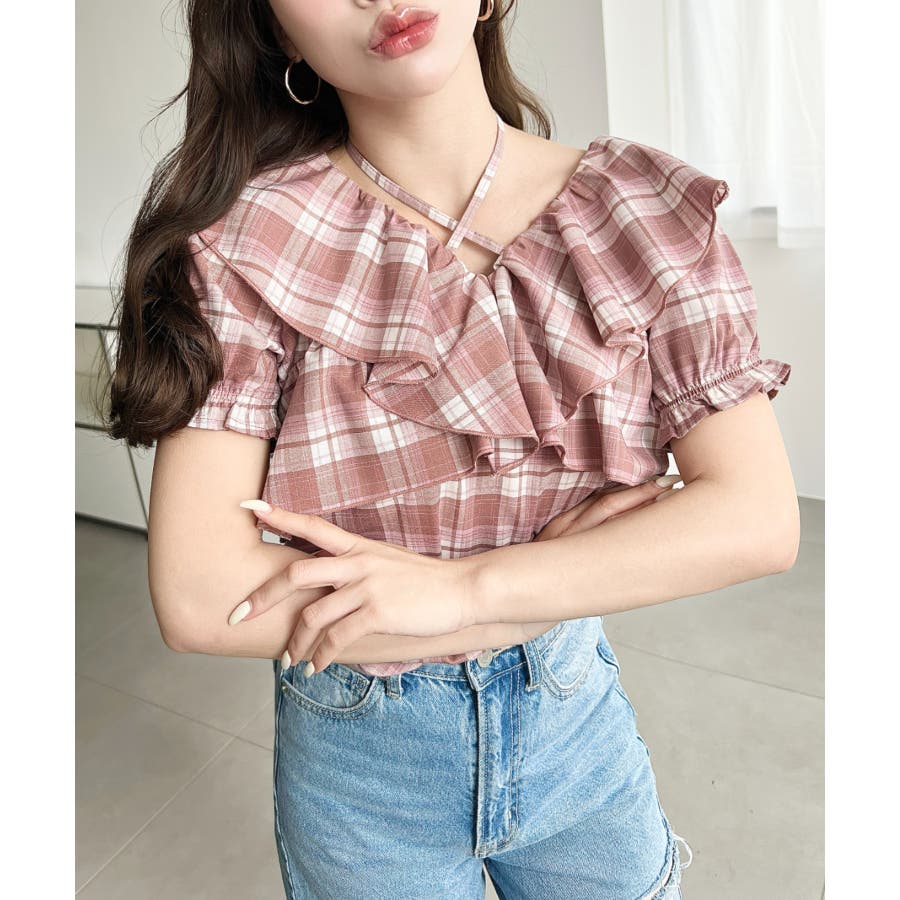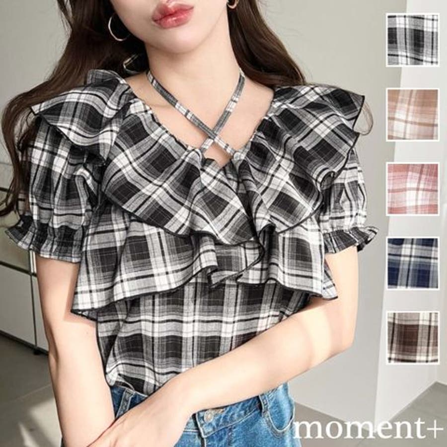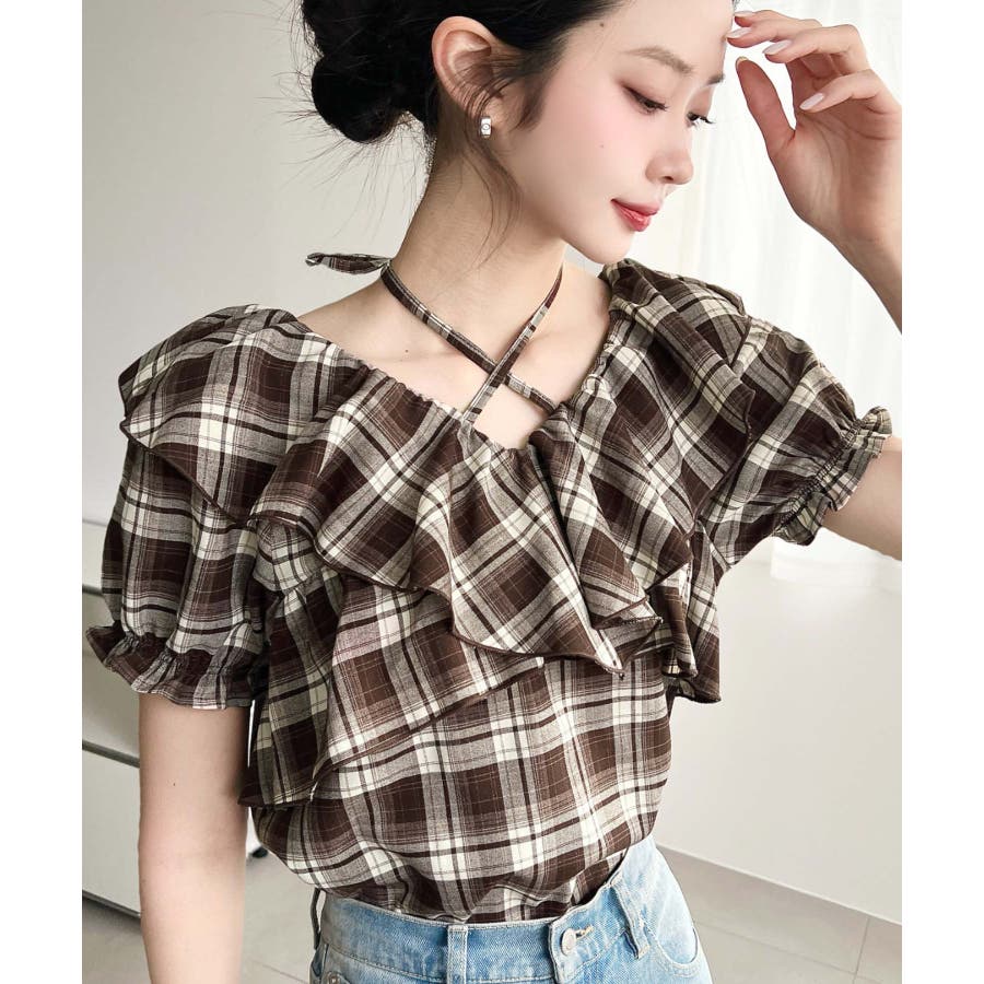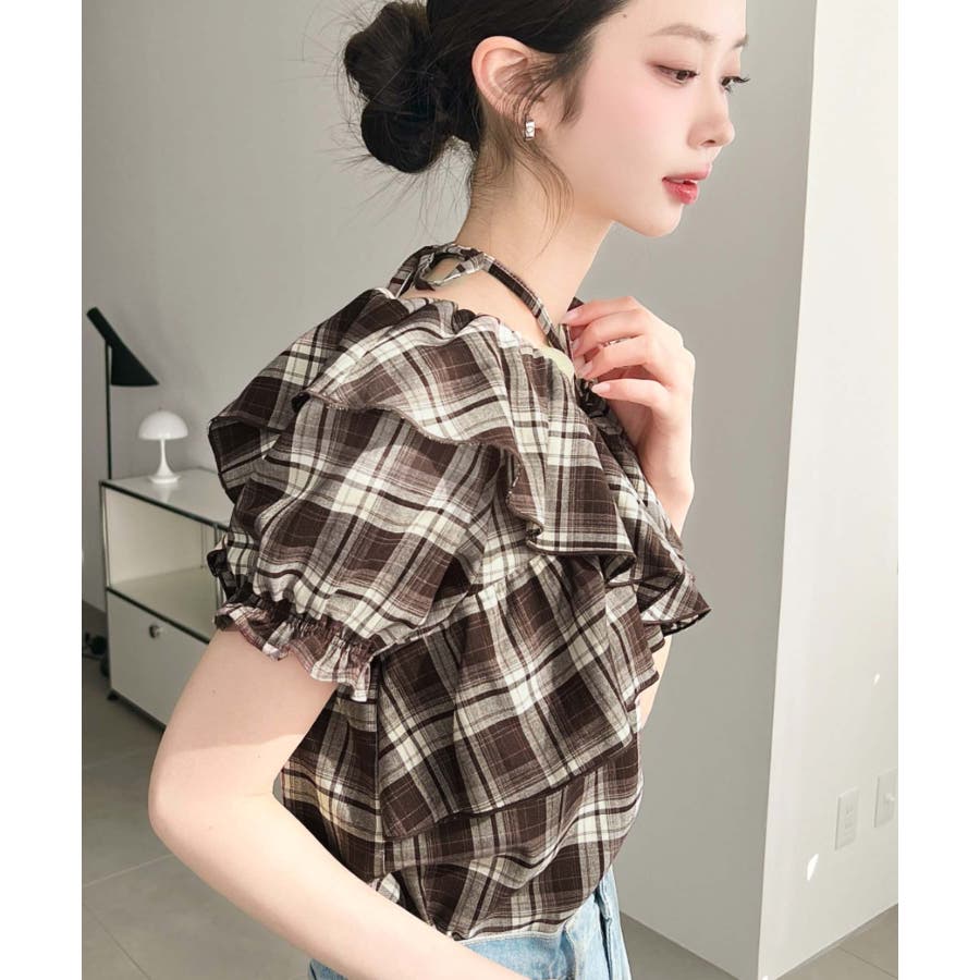 ・首元のクロスリボンと大きななフリルが可愛いらしさを引き立てるチェック柄ブラウス。