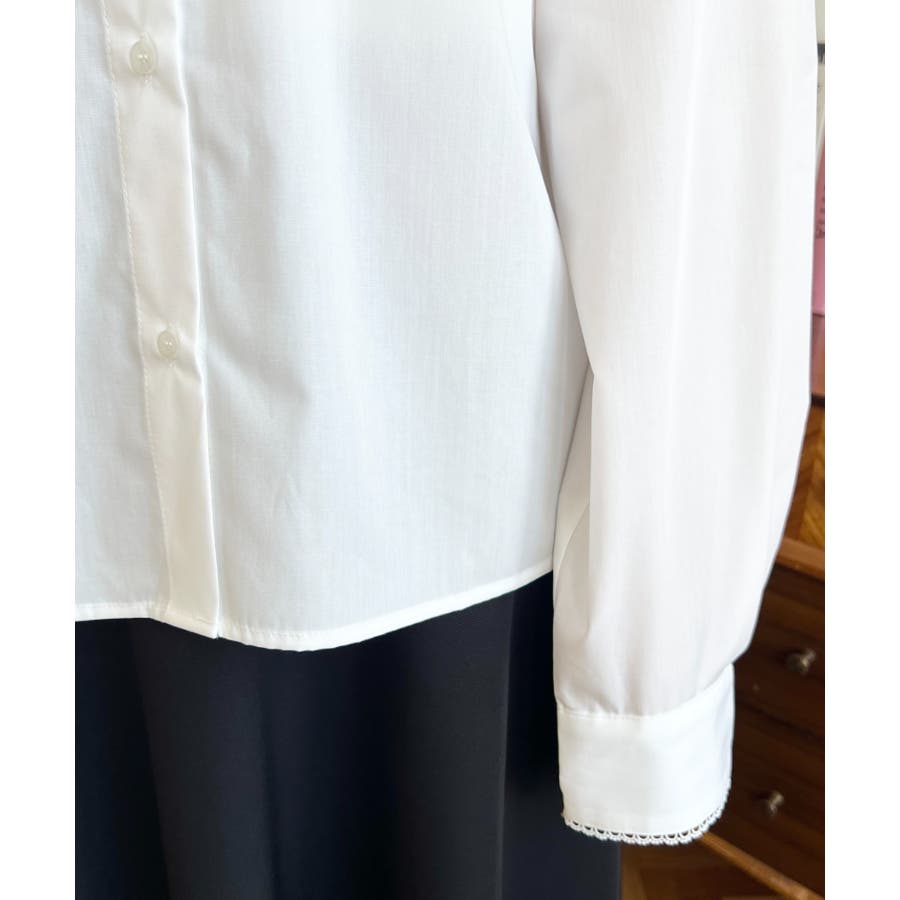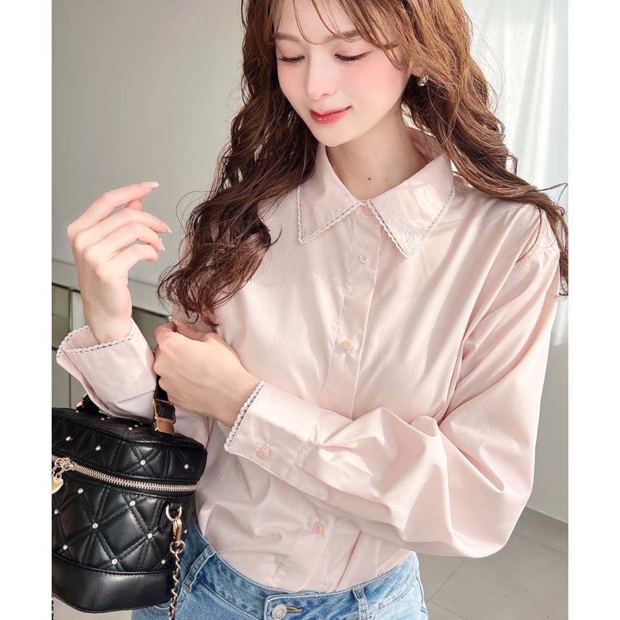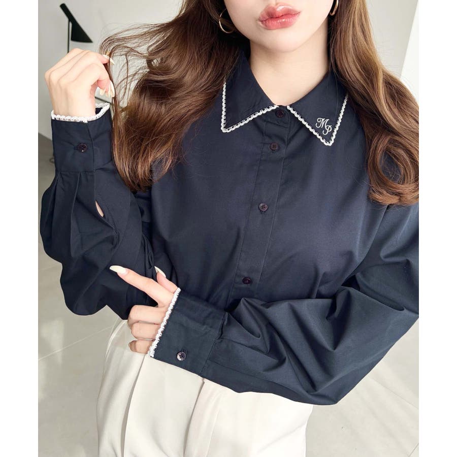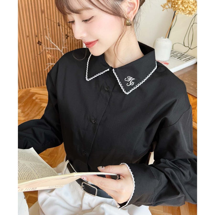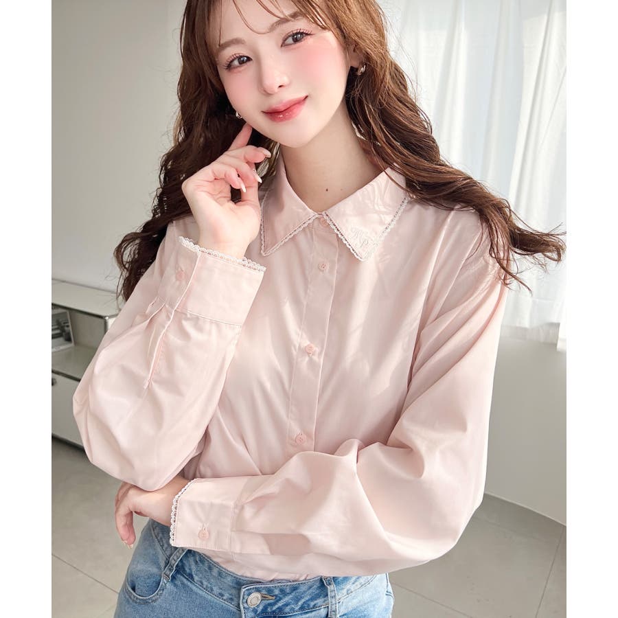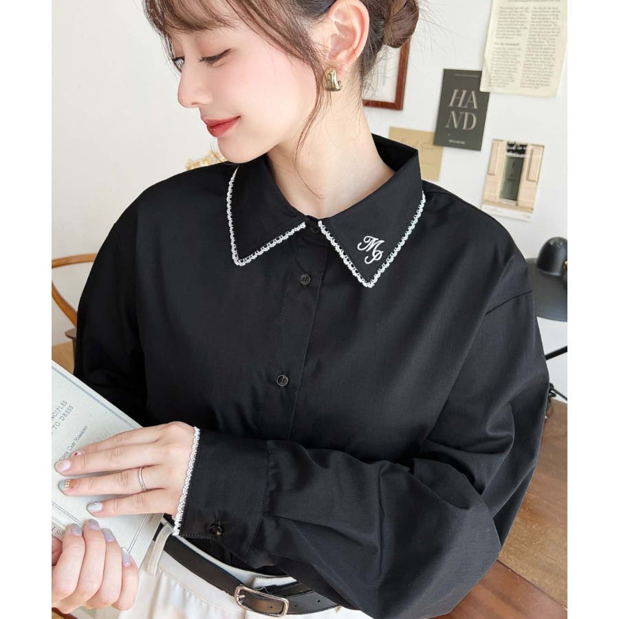 衿ワンポイント刺繍ピコレース長袖ブラウス