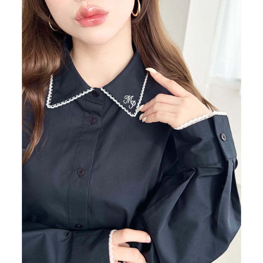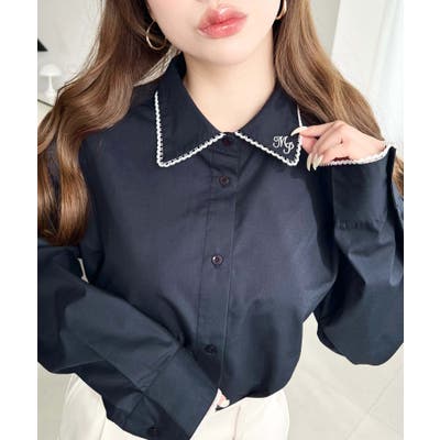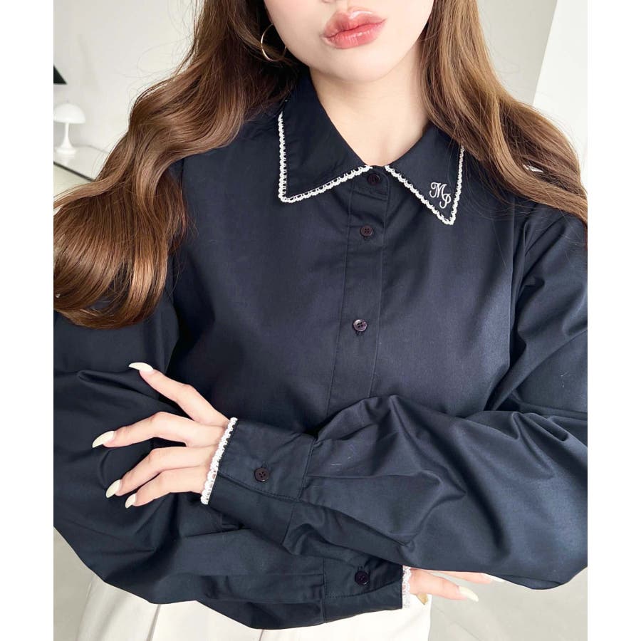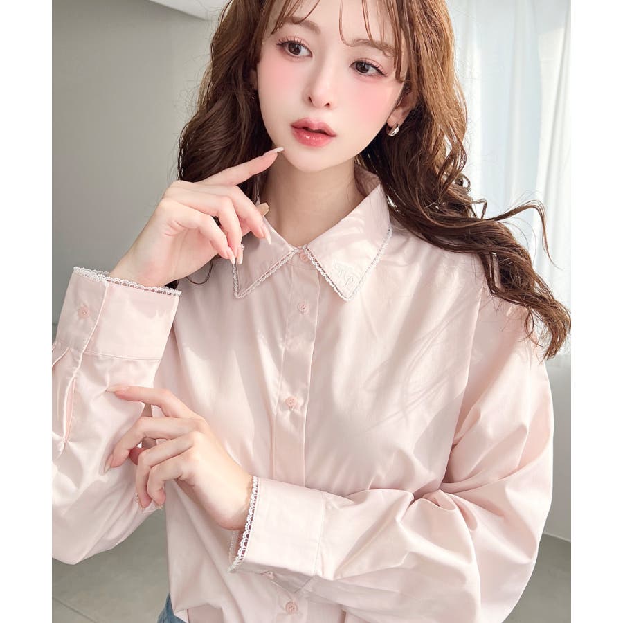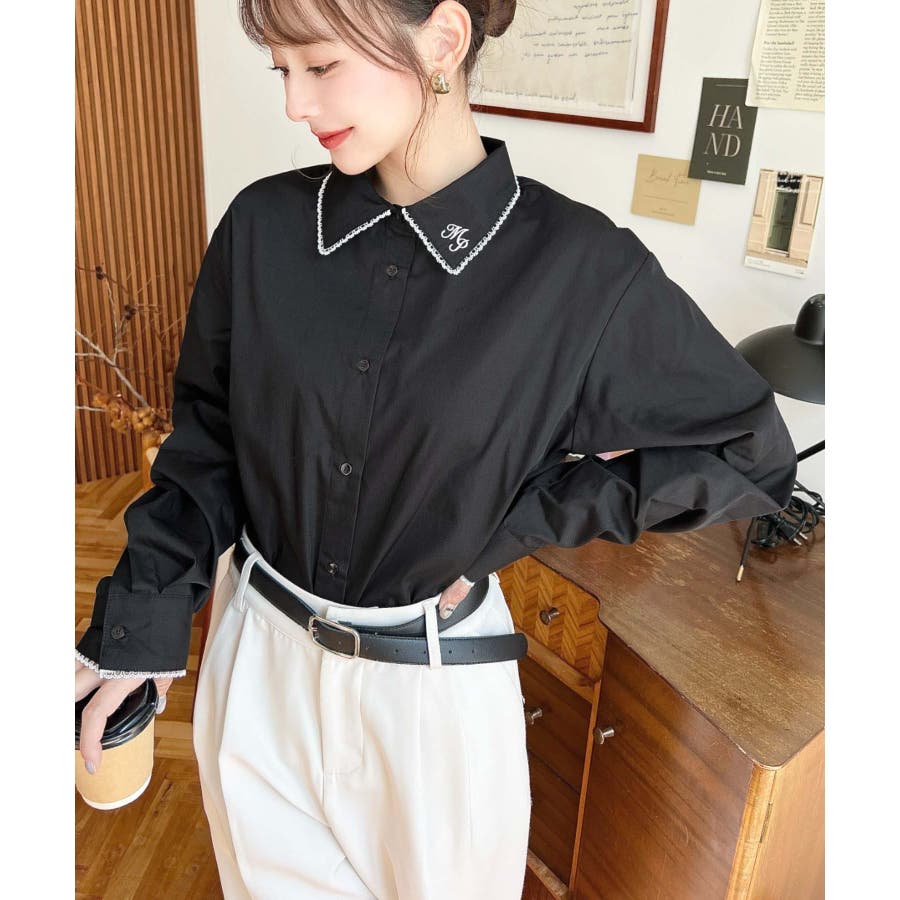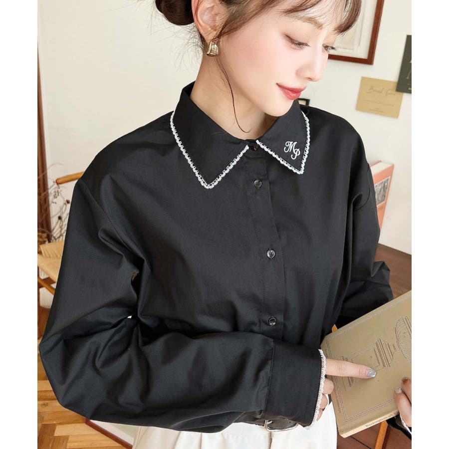 衿ワンポイント刺繍ピコレース長袖ブラウス