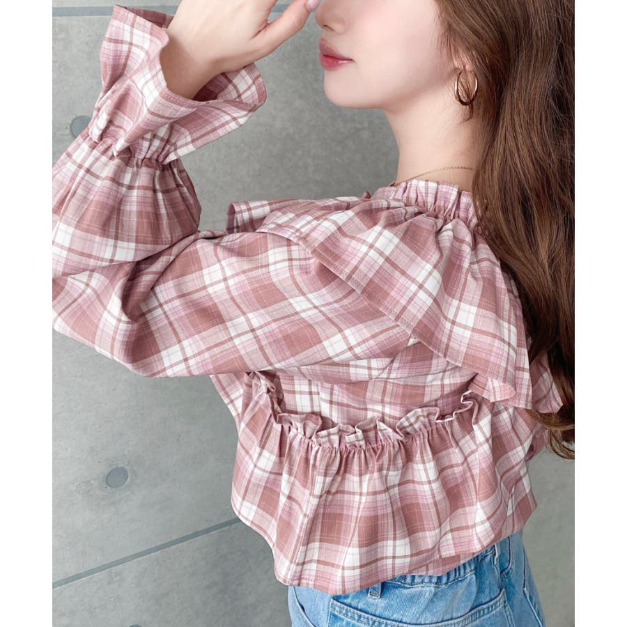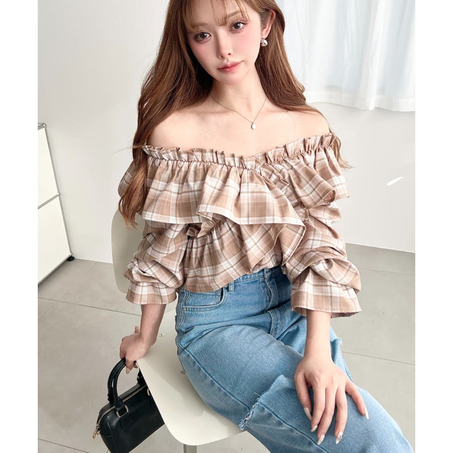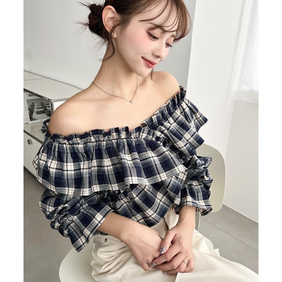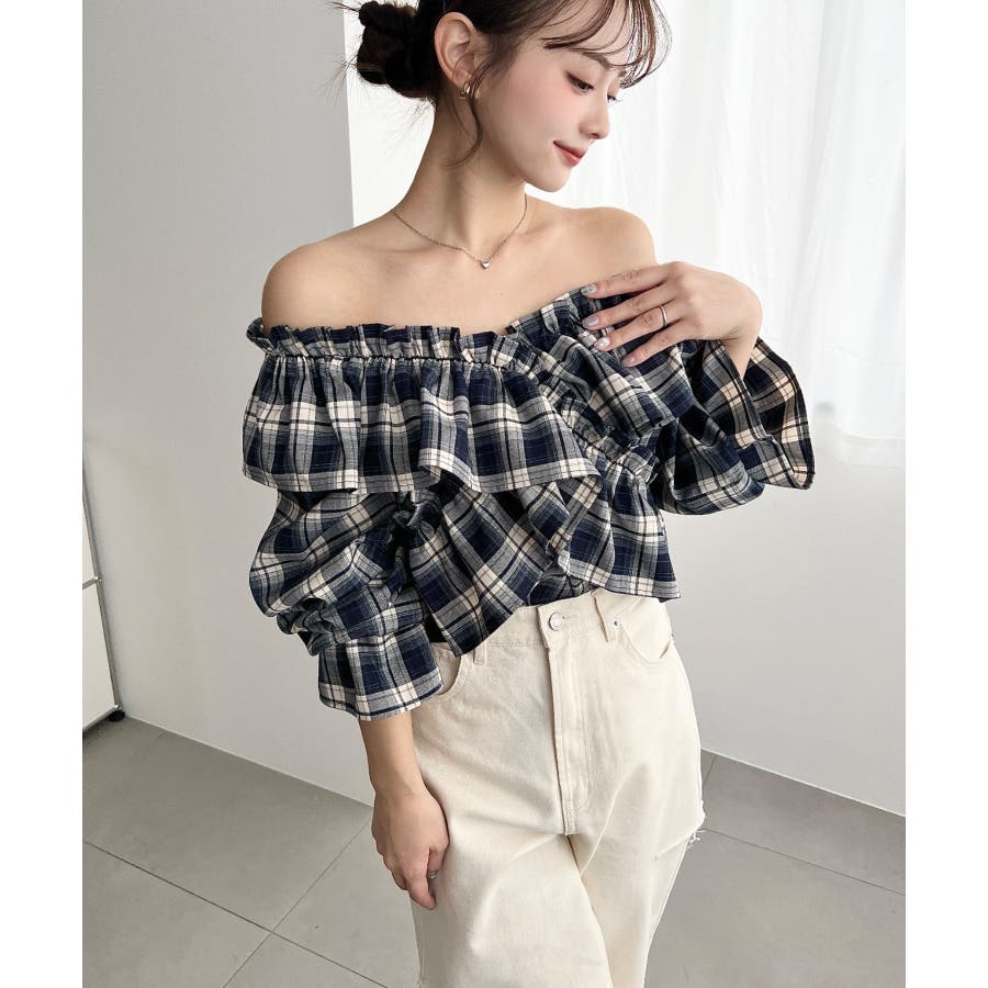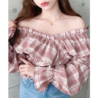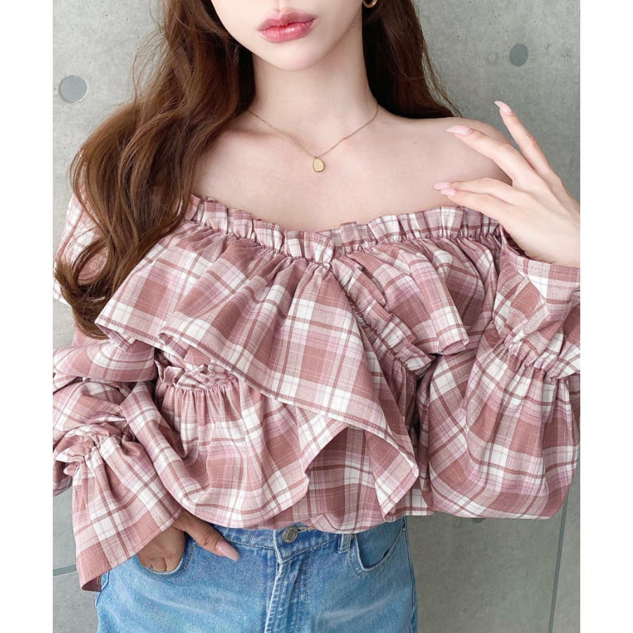 マルチウェイオフショルフリルリボンショート丈長袖チェックブラウス