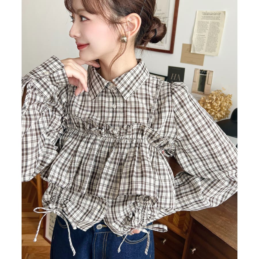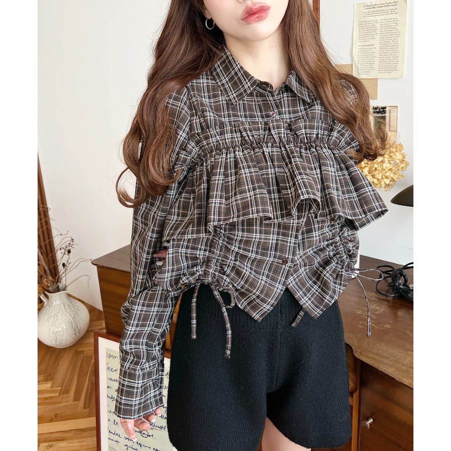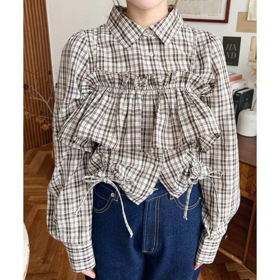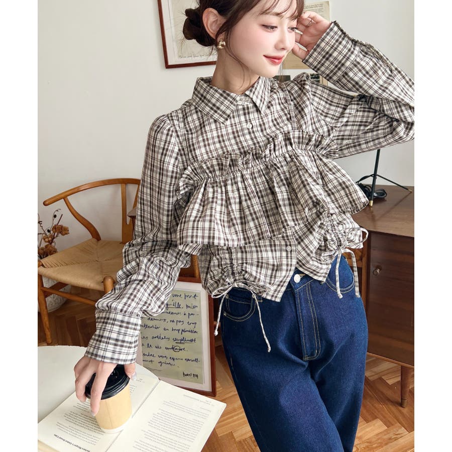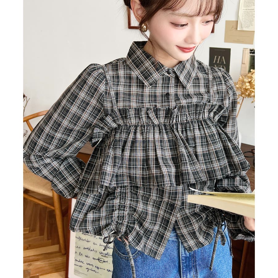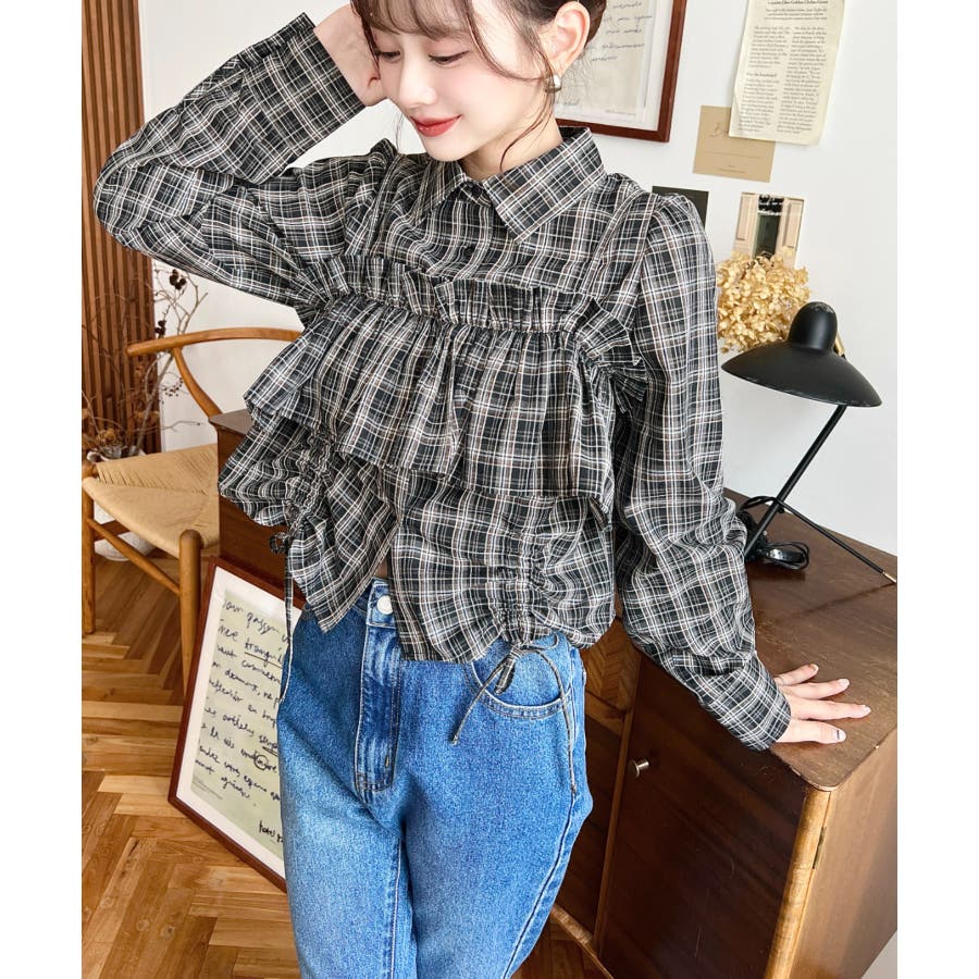 フリルビスチェセット裾ドロストリボン長袖チェックシャツ
