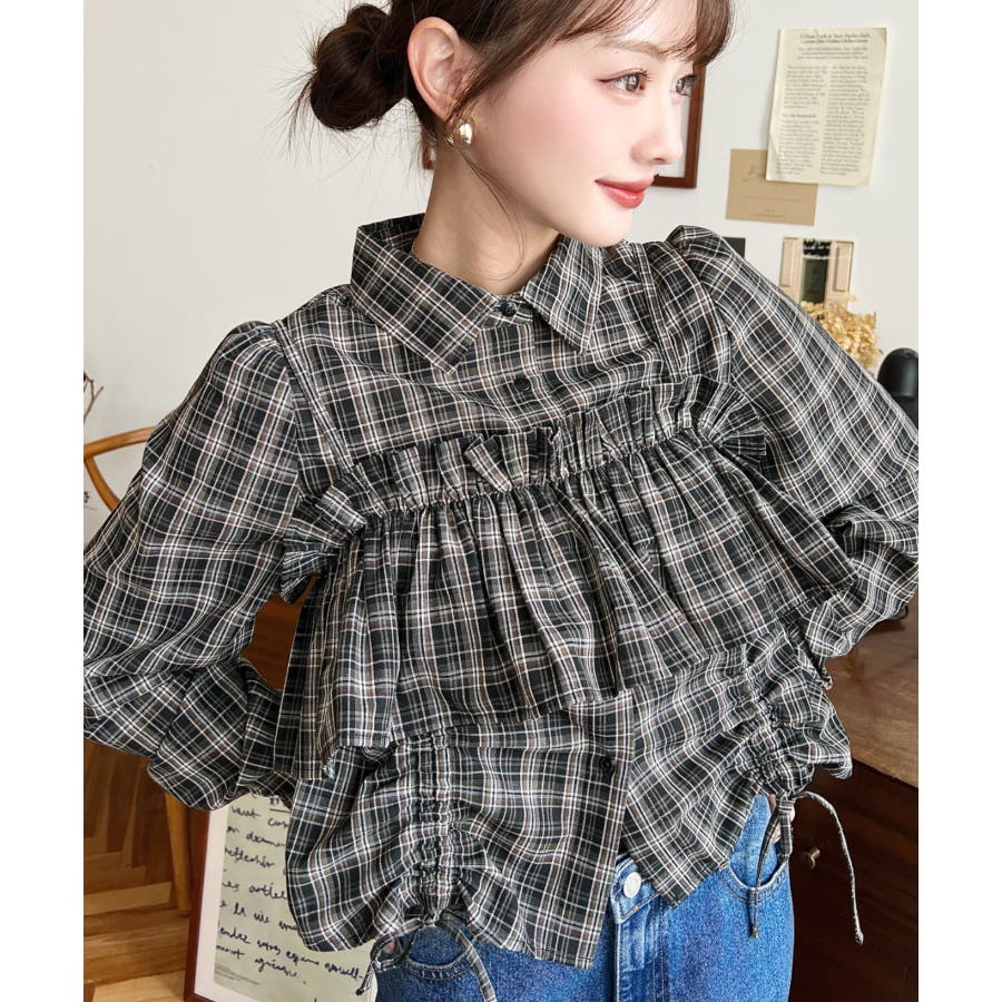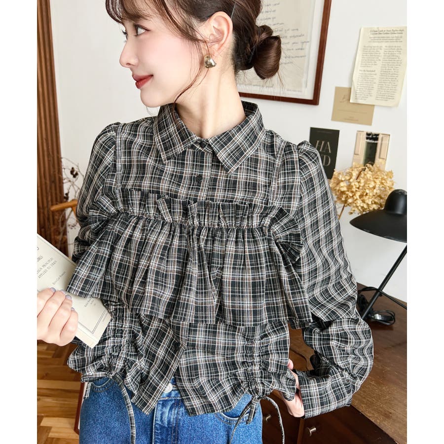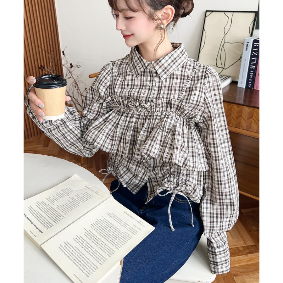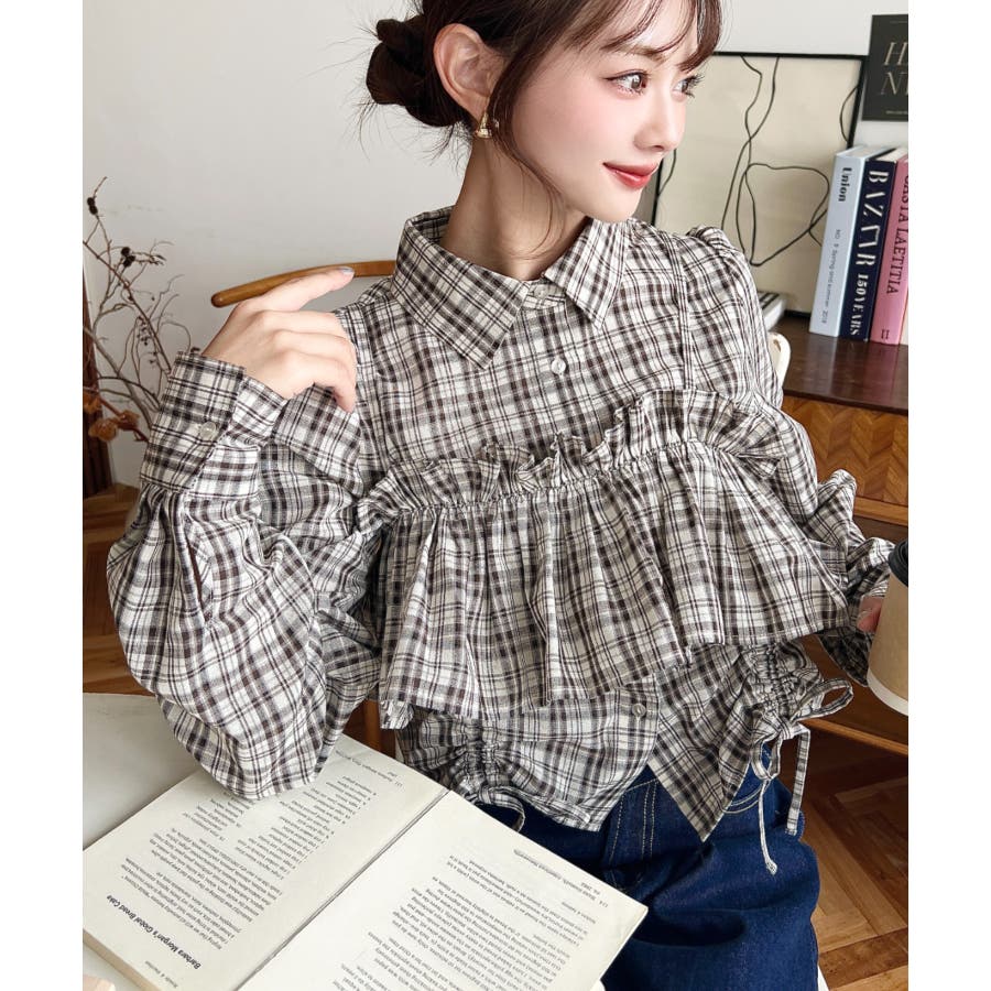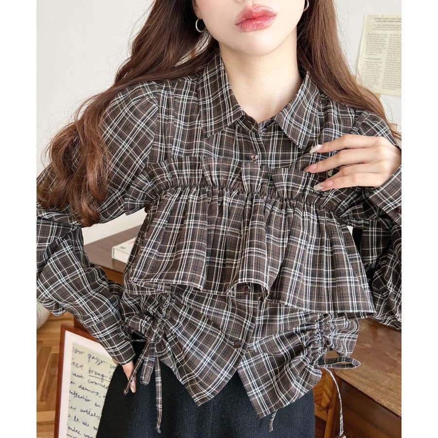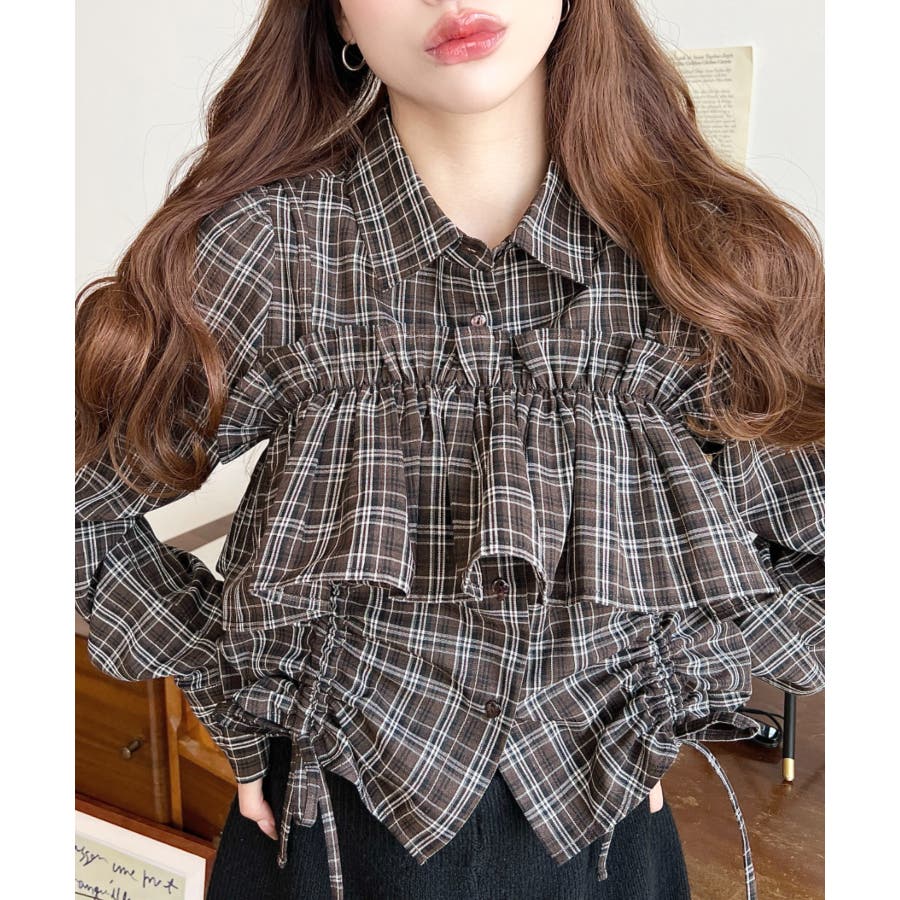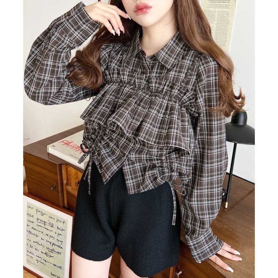 フリルビスチェセット裾ドロストリボン長袖チェックシャツ