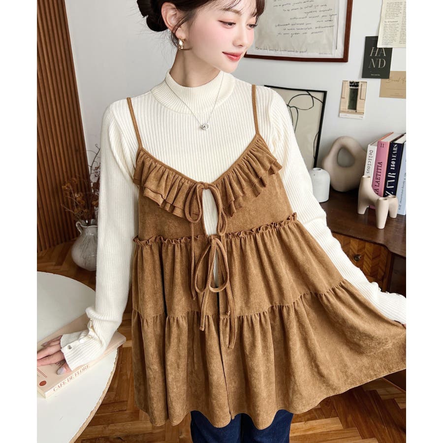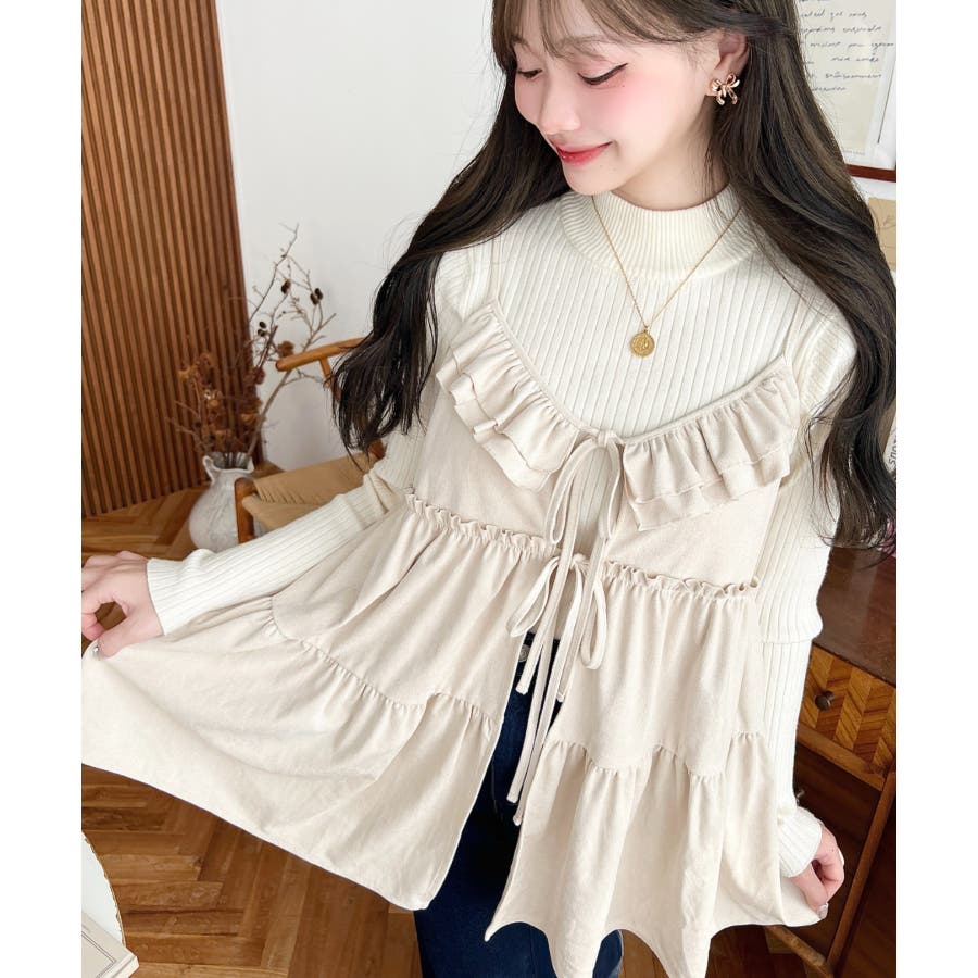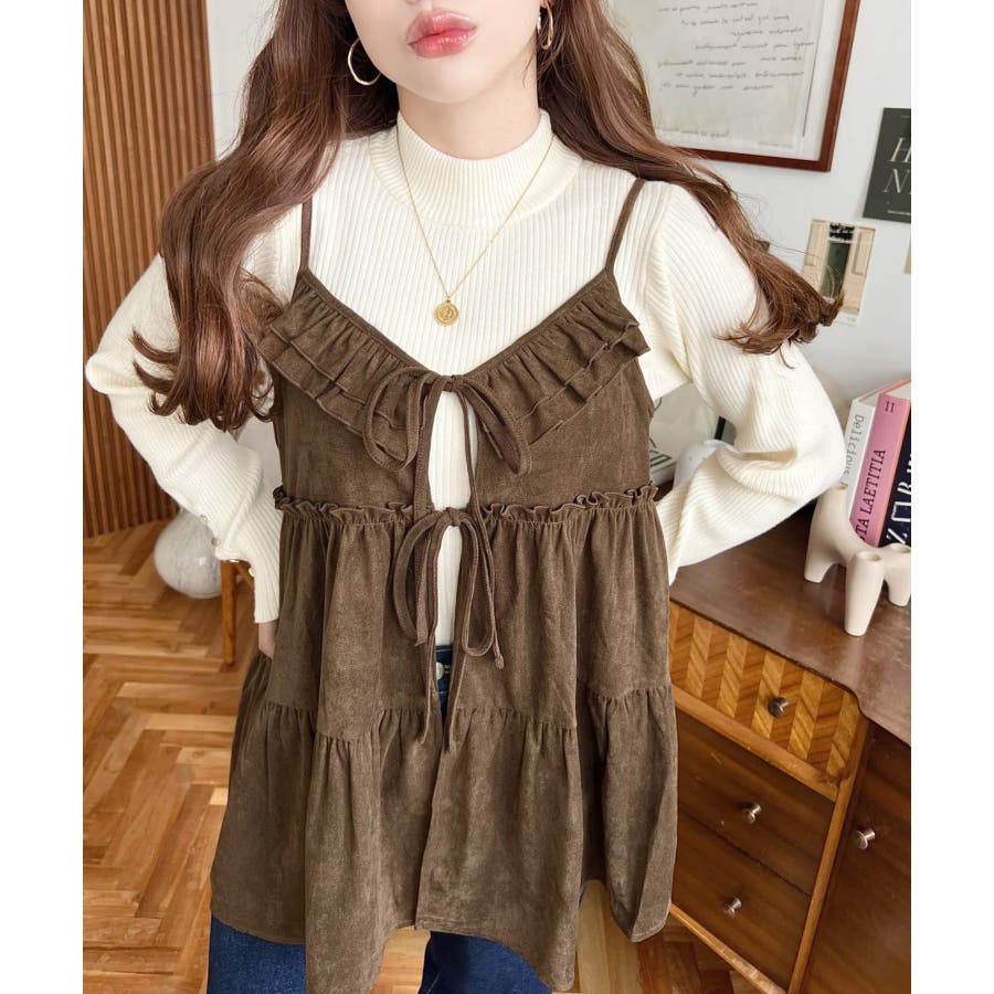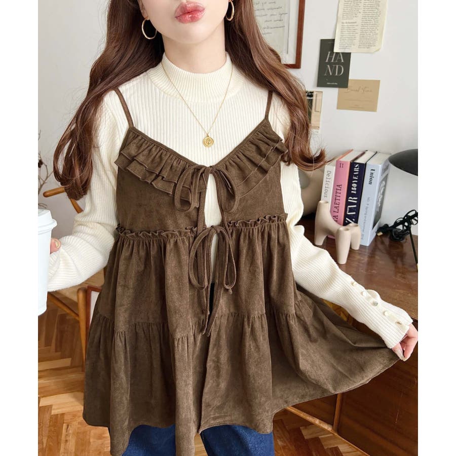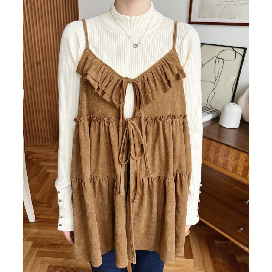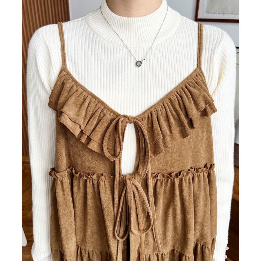 【ダブルリボンがアクセント。フリル×スエードで魅せる、大人のレイヤードトップス◎】