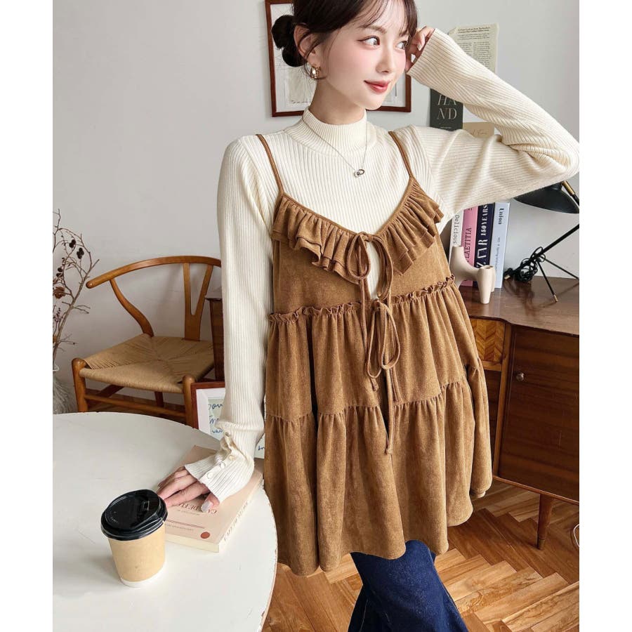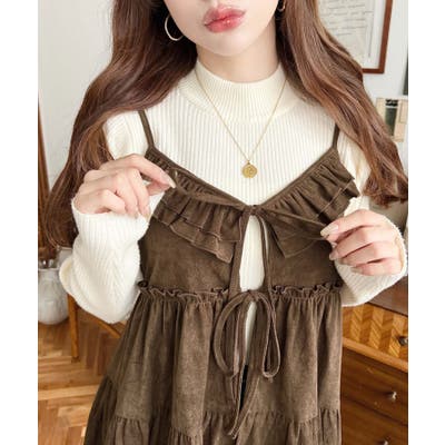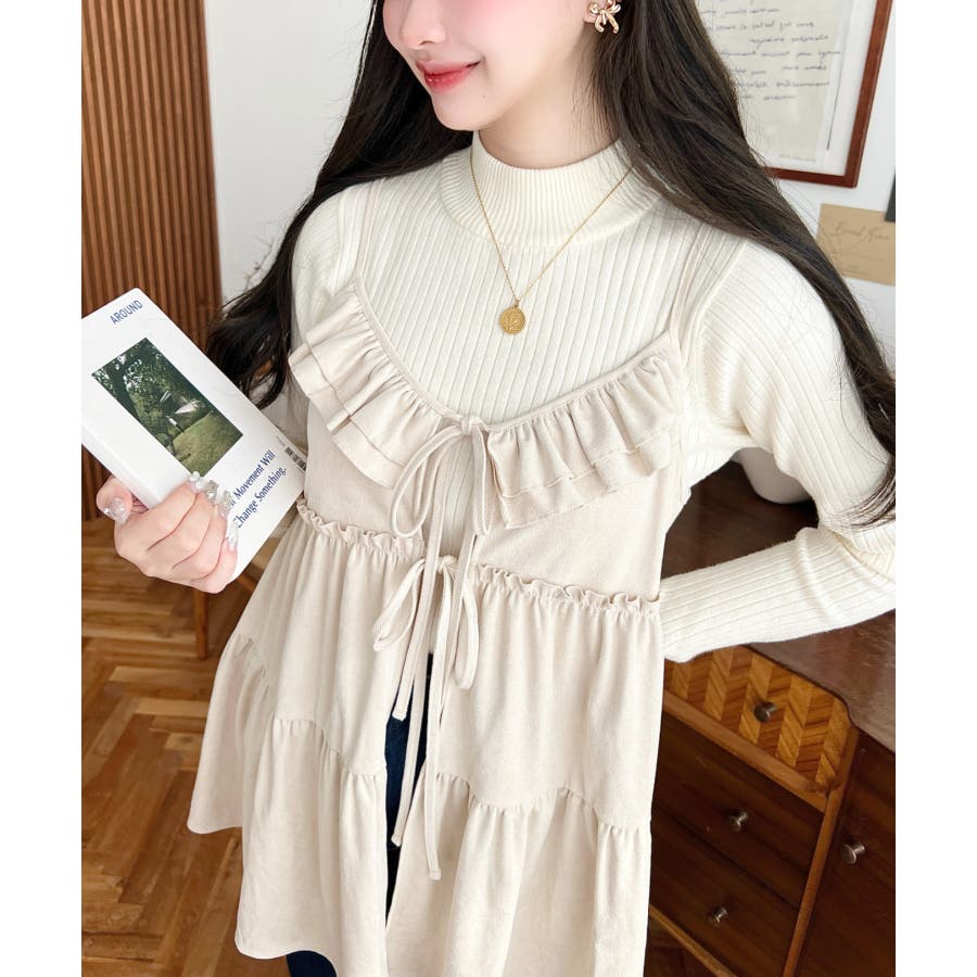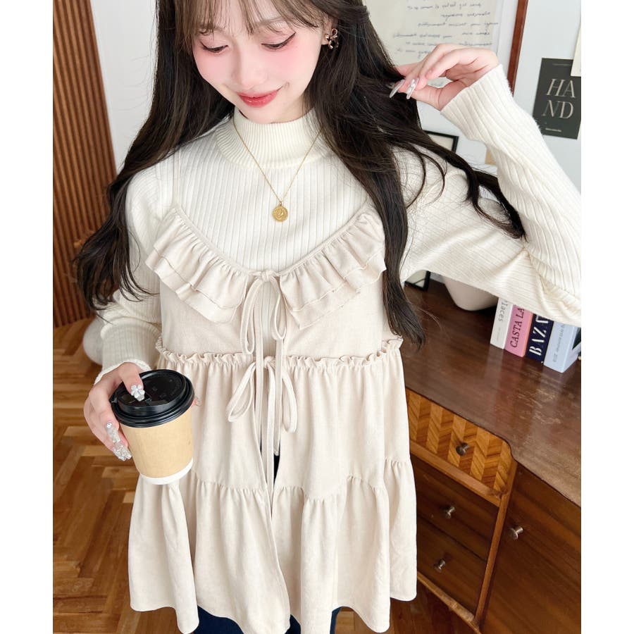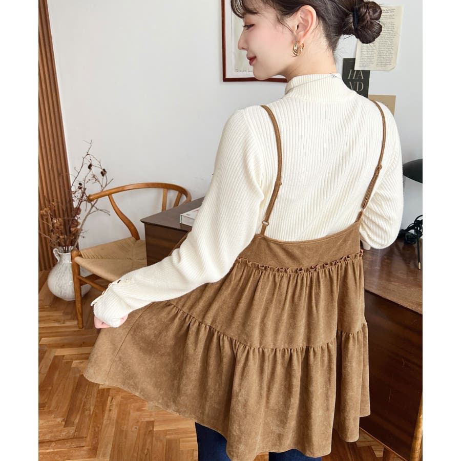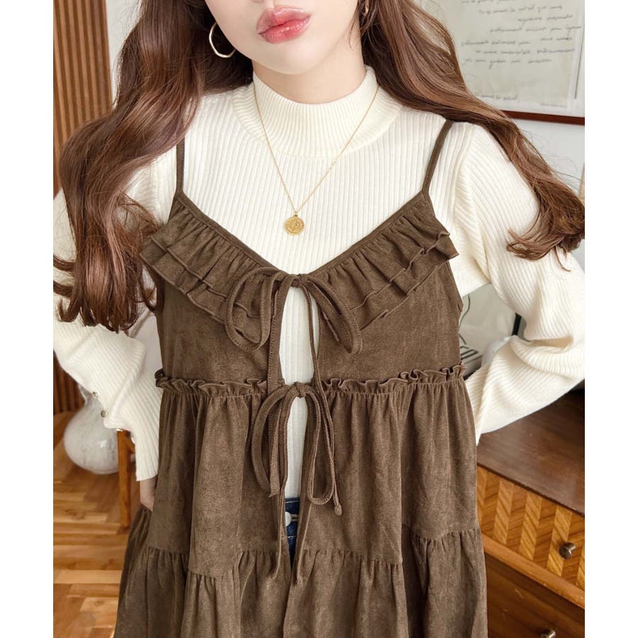 【ダブルリボンがアクセント。フリル×スエードで魅せる、大人のレイヤードトップス◎】